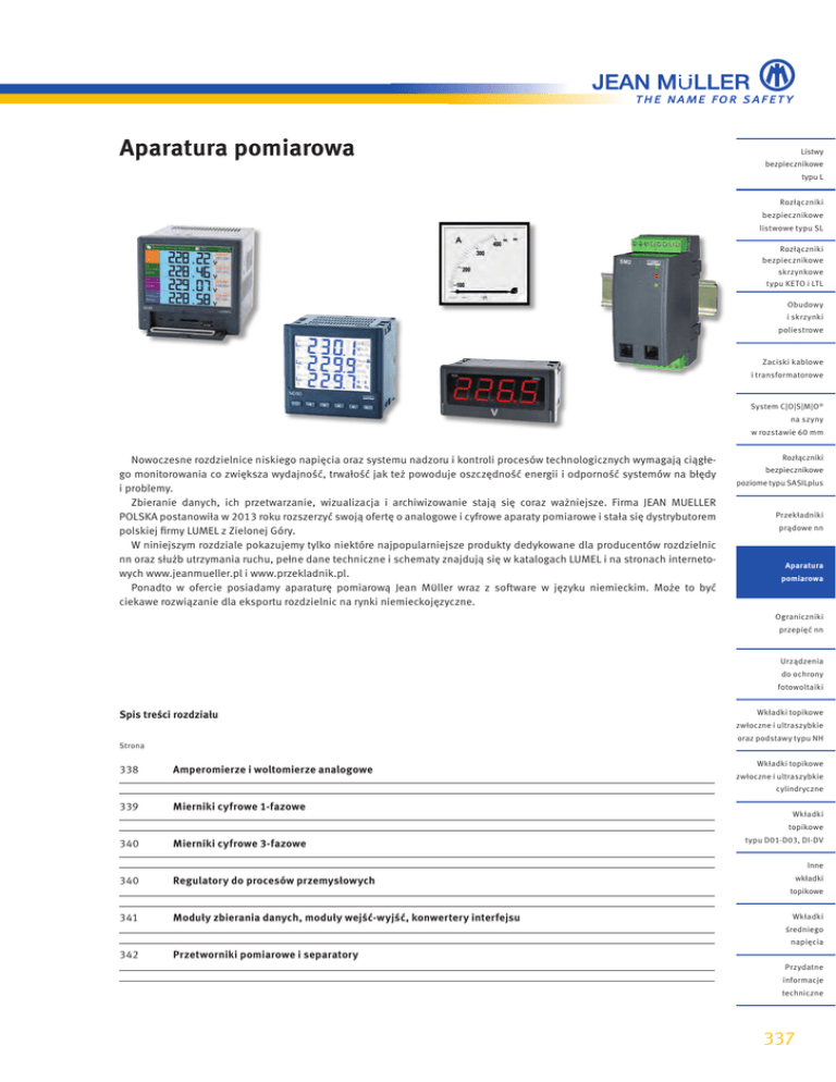 Aparatura pomiarowa Listwy bezpiecznikowe typu L Rozłączniki bezpiecznikowe listwowe typu SL Rozłączniki bezpiecznikowe skrzynkowe typu KETO i LTL Obudowy i skrzynki poliestrowe Zaciski kablowe i transformatorowe System C|O|S|M|O ® na szyny w rozstawie 60 mm Nowoczesne rozdzielnice niskiego napięcia oraz systemu nadzoru i kontroli procesów technologicznych wymagają ciągłego monitorowania co zwiększa wydajność, trwałość jak też powoduje oszczędność energii i odporność systemów na błędy i problemy. Zbieranie danych, ich przetwarzanie, wizualizacja i archiwizowanie stają się coraz ważniejsze. Firma JEAN MUELLER POLSKA postanowiła w 2013 roku rozszerzyć swoją ofertę o analogowe i cyfrowe aparaty pomiarowe i stała się dystrybutorem polskiej firmy LUMEL z Zielonej Góry. W niniejszym rozdziale pokazujemy tylko niektóre najpopularniejsze produkty dedykowane dla producentów rozdzielnic nn oraz służb utrzymania ruchu, pełne dane techniczne i schematy znajdują się w katalogach LUMEL i na stronach internetowych www.jeanmueller.pl i www.przekladnik.pl. Ponadto w ofercie posiadamy aparaturę pomiarową Jean MÜller wraz z software w języku niemieckim. Może to być ciekawe rozwiązanie dla eksportu rozdzielnic na rynki niemieckojęzyczne. Rozłączniki bezpiecznikowe poziome typu SASILplus Przekładniki prądowe nn Aparatura pomiarowa Ograniczniki przepięć nn Urządzenia do ochrony fotowoltaiki Spis treści rozdziału Wkładki topikowe zwłoczne i ultraszybkie oraz podstawy typu NH Strona 338 Amperomierze i woltomierze analogowe 339 Mierniki cyfrowe 1-fazowe Wkładki topikowe zwłoczne i ultraszybkie cylindryczne Wkładki topikowe 340 Mierniki cyfrowe 3-fazowe typu D01-D03, DI-DV Inne 340 Regulatory do procesów przemysłowych 341 Moduły zbierania danych, moduły wejść-wyjść, konwertery interfejsu wkładki topikowe Wkładki średniego napięcia 342 Przetworniki pomiarowe i separatory Przydatne informacje techniczne 337 Aparatura pomiarowa Amperomierze i woltomierze AC (elektromagnetyczne) Oznaczenie Opis EQ48 Amperomierz elektromagnetyczny, wymiar: 48x48 mm z przeciążeniem wraz ze skalą EQ72 Amperomierz elektromagnetyczny, wymiar: 72x72 mm z przeciążeniem wraz ze skalą EQ96 Amperomierz elektromagnetyczny, wymiar: 96x96 mm z przeciążeniem wraz ze skalą EB16 Zakres prądowy: do przekładników x/5A i x/1A, wymiar: 53x90 mm na szynę DIN, IP52 Zakres napięciowy: 6-600V, wymiar: 53x90 mm na szynę DIN, IP52 EA16 EA17 EA19 EA12 EV72 EV96 Zakres prądowy: do przekładników x/5A i x/1A, wymiar: 48x48 mm, IP50 Zakres napięciowy: 6-600V, wymiar: 48x48 mm, IP50 Zakres prądowy: do przekładników x/5A i x/1A, wymiar: 72x72 mm, IP50 Zakres napięciowy: 6-1000V, wymiar: 72x72 mm, IP50 Zakres prądowy: do przekładników x/5A i x/1A, wymiar: 96x96 mm, IP50 Zakres napięciowy: 6-1000V, wymiar: 96x96 mm, IP50 Zakres prądowy: do przekładników x/5A i x/1A, wymiar: 144x144 mm, IP50 Zakres napięciowy: 6-1000V, wymiar: 144x144 mm, IP50 Zakres prądowy: x/5A, skala zwykła i z 2-krotnym przeciążeniem zakres napięciowy: 500V, wymiar: 72x72 mm, IP52 Zakres prądowy: x/5A, skala zwykła i z 2-krotnym przeciążeniem zakres napięciowy: 500V, wymiar: 96x96 mm, IP52 Amperomierze prądu przemiennego (bimetalowe) Oznaczenie BA27 BA39 BE27 BE39 Opis Zakres prądowy ustroju bimetalowego: 0-1,2A lub 0-6A oraz przez przekładnik 0-1,2A/1 lub 5A, wymiar: 72x72 mm, IP50 Zakres prądowy ustroju bimetalowego: 0-1,2A lub 0-6A oraz przez przekładnik 0-1,2A/1 lub 5A, wymiar: 96x96 mm, IP50 Zakres prądowy ustroju bimetalowego: 0-1,2A lub 0-6A oraz przez przekładnik 0-1,2A/1 lub 5A, ustroju elektromagnetycznego: 0...1/2A lub 0...5/10A oraz przez przekładnik 0...2(x) x/1A i .../5A, wymiar: 72x72 mm, IP50 Zakres prądowy ustroju bimetalowego: 0-1,2A lub 0-6A oraz przez przekładnik 0-1,2A/1 lub 5A, ustroju elektromagnetycznego: 0...1/2A lub 0...5/10A oraz przez przekładnik 0...2(x) x/1A i .../5A, wymiar: 96x96 mm, IP50 Amperomierze i woltomierze AC z prostownikiem Oznaczenie Opis MA17P Zakres prądowy dla 50Hz: 1-6A, napięciowy: 6mV-1,5V, wymiar: 72x72 mm, IP50 MA19P Zakres prądowy dla 50Hz: 1-6A, napięciowy: 6mV-1,5V, wymiar: 96x96 mm, IP50 MA12P Zakres prądowy: 400mA-1A, napięciowy: 2,5-600V, wymiar: 144x144 mm, IP50 Woltomierze 3-fazowe napięcia przemiennego z przełącznikiem Oznaczenie EP27 EP29 Opis Zakres napięciowy: 100 i 500V, przez przekładnik: xV/100V i 110V, wymiar: 72x72 mm, IP50 Zakres napięciowy: 100 i 500V, przez przekładnik: xV/100V i 110V, wymiar: 96x96 mm, IP50 Mierniki mocy Oznaczenie Opis Miernik mocy czynnej P, 1-fazowy: 50W-12kW, wymiar: 96x96 mm, IP50 PA39 338 Miernik mocy czynnej i biernej, 3-fazowy, 3-przewodowy, wymiar: 96x96 mm, IP50 Miernik mocy czynnej i biernej, 3-fazowy, 4-przewodowy, wymiar: 96x96 mm, IP50 Amperomierze i woltomierze DC (magnetoelektryczne) Oznaczenie MB16 MA16 MA17 MA19 MA12 Listwy Opis Zakres prądowy: 40µA-25A, napięciowy: 60mV-600V oraz przez bocznik: 1A-15kA wymiar: 53x90 mm, na szynę DIN, IP52 Zakres pomiarowy do bocznika xA/60mV: 1A-15kA, wymiar: 48x48 mm, IP50 Zakres napięciowy bezpośredni: 0-60mV, wymiar: 48x48 mm, IP50 Zakres pomiarowy do bocznika xA/60mV: 1A-15kA, wymiar: 72x72 mm, IP50 Zakres napięciowy bezpośredni: 0-60mV, wymiar: 72x72 mm, IP50 Zakres pomiarowy do bocznika xA/60mV: 1A-15kA, wymiar: 96x96 mm, IP50 Zakres napięciowy bezpośredni: 0-60mV, wymiar: 96x96 mm, IP50 Zakres napięciowy bezpośredni: 0-60mV, wymiar: 144x144 mm, IP50 Oznaczenie Opis Miernik cos φ, wymiar: 96x96 mm, IP50 FA32 Miernik cos φ, wymiar: 144x144 mm, IP50 CA37 Częstościomierz, klasa 0,2 (48-420Hz) i 0,5 (45-440Hz), wymiar: 72x72 mm, IP50 CA39 Częstościomierz, klasa 0,2 (48-420Hz) i 0,5 (45-440Hz), wymiar: 96x96 mm, IP50 CA32 Częstościomierz, klasa 0,2 (48-420Hz) i 0,5 (45-440Hz), wymiar: 144x144 mm, IP50 Mierniki cyfrowe 1-fazowe N20 N20Z listwowe typu SL Rozłączniki bezpiecznikowe skrzynkowe typu KE