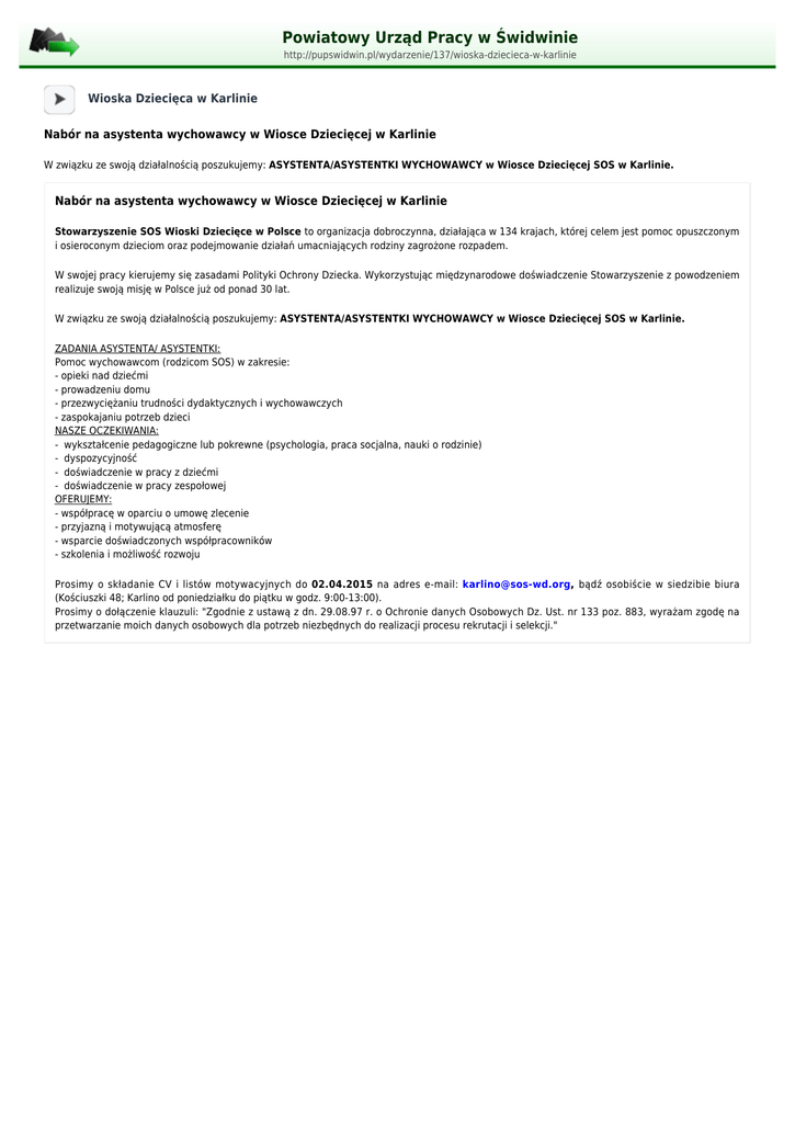 Powiatowy Urząd Pracy w Świdwinie http://pupswidwin.pl/wydarzenie/137/wioska-dziecieca-w-karlinie Wioska Dziecięca w Karlinie Nabór na asystenta wychowawcy w Wiosce Dziecięcej w Karlinie W związku ze swoją działalnością poszukujemy: ASYSTENTA/ASYSTENTKI WYCHOWAWCY w Wiosce Dziecięcej SOS w Karlinie. Nabór na asystenta wychowawcy w Wiosce Dziecięcej w Karlinie Stowarzyszenie SOS Wioski Dziecięce w Polsce to organizacja dobroczynna, działająca w 134 krajach, której celem jest pomoc opuszczonym i osieroconym dzieciom oraz podejmowanie działań umacniających rodziny zagrożone rozpadem. W swojej pracy kierujemy się zasadami Polityki Ochrony Dziecka. Wykorzystując międzynarodowe doświadczenie Stowarzyszenie z powodzeniem realizuje swoją misję w Polsce już od ponad 30 lat. W związku ze swoją działalnością poszukujemy: ASYSTENTA/ASYSTENTKI WYCHOWAWCY w Wiosce Dziecięcej SOS w Karlinie. ZADANIA ASYSTENTA/ ASYSTENTKI: Pomoc wychowawcom (rodzicom SOS) w zakresie: - opieki nad dziećmi - prowadzeniu domu - przezwyciężaniu trudności dydaktycznych i wychowawczych - zaspokajaniu potrzeb dzieci NASZE OCZEKIWANIA: - wykształcenie pedagogiczne lub pokrewne (psychologia, praca socjalna, nauki o rodzinie) - dyspozycyjność - doświadczenie w pracy z dziećmi - doświadczenie w pracy zespołowej OFERUJEMY: - współpracę w oparciu o umowę zlecenie - przyjazną i motywującą atmosferę - wsparcie doświadczonych współpracowników - szkolenia i możliwość rozwoju Prosimy o składanie CV i listów motywacyjnych do 02.04.2015 na adres e-mail: [email protected], bądź osobiście w siedzibie biura (Kościuszki 48; Karlino od poniedziałku do piątku w godz. 9:00-13:00). Prosimy o dołączenie klauzuli: "Zgodnie z ustawą z dn. 29.08.97 r. o Ochronie danych Osobowych Dz. Ust. nr 133 poz. 883, wyrażam zgodę na przetwarzanie moich danych osobowych dla potrzeb niezbędnych do realizacji procesu rekrutacji i selekcji."