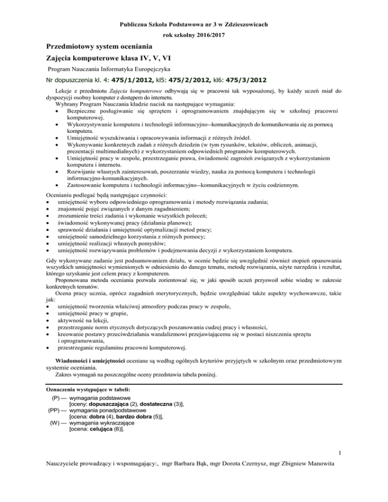 Publiczna Szkoła Podstawowa nr 3 w Zdzieszowicach rok szkolny 2016/2017 Przedmiotowy system oceniania Zajęcia komputerowe klasa IV, V, VI Program Nauczania Informatyka Europejczyka Nr dopuszczenia kl. 4: 475/1/2012, kl5: 475/2/2012, kl6: 475/3/2012 Ocena pracy ucznia Lekcje z przedmiotu Zajęcia komputerowe odbywają się w pracowni tak wyposażonej, by każdy uczeń miał do dyspozycji osobny komputer z dostępem do internetu. Wybrany Program Nauczania kładzie nacisk na następujące wymagania: Bezpieczne posługiwanie się sprzętem i oprogramowaniem znajdującym się w szkolnej pracowni komputerowej. Wykorzystywanie komputera i technologii informacyjno--komunikacyjnych do komunikowania się za pomocą komputera. Umiejętność wyszukiwania i opracowywania informacji z różnych źródeł. Wykonywanie konkretnych zadań z różnych dziedzin (w tym rysunków, tekstów, obliczeń, animacji, prezentacji multimedialnych) z wykorzystaniem odpowiednich programów komputerowych. Umiejętność pracy w zespole, przestrzeganie prawa, świadomość zagrożeń związanych z wykorzystaniem komputera i internetu. Rozwijanie własnych zainteresowań, poszerzanie wiedzy, nauka za pomocą komputera i technologii informacyjno-komunikacyjnych. Zastosowanie komputera i technologii informacyjno--komunikacyjnych w życiu codziennym. Ocenianiu podlegać będą następujące czynności: umiejętność wyboru odpowiedniego oprogramowania i metody rozwiązania zadania; znajomość pojęć związanych z danym zagadnieniem; zrozumienie treści zadania i wykonanie wszystkich poleceń; świadomość wykonywanej pracy (działania planowe); sprawność działania i umiejętność optymalizacji metod pracy; umiejętność samodzielnego korzystania z różnych pomocy; umiejętność realizacji własnych pomysłów; umiejętność rozwiązywania problemów i podejmowania decyzji z wykorzystaniem komputera. Gdy wykonywane zadanie jest podsumowaniem działu, w ocenie będzie się uwzględnić również stopień opanowania wszystkich umiejętności wymienionych w odniesieniu do danego tematu, metodę rozwiązania, użyte narzędzia i rezultat, którego uzyskanie jest celem pracy z komputerem. Proponowana metoda oceniania pozwala zorientować się, w jaki sposób uczeń przyswoił sobie wiedzę w zakresie konkretnych tematów. Ocena pracy ucznia, oprócz zagadnień merytorycznych, będzie uwzględniać także aspekty wychowawcze, takie jak: umiejętność tworzenia właściwej atmosfery podczas pracy w zespole, umiejętność pracy w grupie, aktywność na lekcji, przestrzeganie norm etycznych dotyczących poszanowania cudzej pracy i własności, kreowanie postawy przeciwdziałania wandalizmowi przejawiającemu się w postaci niszczenia sprzętu i oprogramowania, przestrzeganie regulaminu pracowni komputerowej. Wiadomości i umiejętności oceniane są według ogólnych kryteriów przyjętych w szkolnym oraz przedmiotowym systemie oceniania. Zakres wymagań na poszczególne oceny przedstawia tabela poniżej. Oznaczenia występujące w tabeli: (P) — wymagania podstawowe [oceny: dopuszczająca (2), dostateczna (3)], (PP) — wymagania ponadpodstawowe [ocena: dobra (4), bardzo dobra (5)], (W) — wymagania wykraczające [ocena: celująca (6)]. 1 Nauczyciele prowadzący i wspomagający:, mgr Barbara Bąk, mgr Dorota Czernysz, mgr Zbigniew Manowita Publiczna Szkoła Podstawowa nr 3 w Zdzieszowicach rok szkolny 2016/2017 Ocena Celująca (6) Bardzo dobra (5) Dobra (4) Dostateczna (3) Dopuszczająca (2) Niedostateczna (1) Kryteria Uczeń: Uczeń: Uczeń: Uczeń: Uczeń: Uczeń: Zakres wiedzy i umiejętności Posiada wiedzę wykraczającą poza program nauczania [W]. Wykazuje szczególne zainteresowanie przedmiotem. Pracuje zawsze samodzielnie. Wykorzystuje posiadaną wiedzę do poszerzenia własnych zainteresowań i rozwiązywania problemów. Sprawnie posługuje się językiem informatycznym. Posiada wiedzę przewidzianą przez program [P;PP]. Wykazuje zainteresowanie przedmiotem. Pracuje zawsze samodzielnie. Wykorzystuje posiadaną wiedzę do poszerzenia własnych zainteresowań. Czyta tekst ze zrozumieniem. Zawsze poprawnie posługuje się słownictwem informatycznym. Posiada większość wiedzy przewidzianej przez program [P;PP]. Wykazuje zainteresowanie przedmiotem. Pracuje zawsze samodzielnie. Wykorzystuje posiadaną wiedzę do poszerzenia własnych zainteresowań. Czyta tekst ze zrozumieniem. Zawsze poprawnie posługuje się słownictwem informatycznym. Opanował podstawową wiedzę przewidzianą przez program [P]. Wykazuje niewielkie zainteresowanie przedmiotem. Pracuje z niewielką pomocą nauczyciela. W niewielkim zakresie wykorzystuje posiadaną wiedzę do poszerzania własnych zainteresowań. Opanował wiedzę niezbędną w toku dalszego kształcenia [P]. Wykazuje niewielkie zainteresowanie przedmiotem. Pracuje z pomocą nauczyciela. W niewielkim zakresie wykorzystuje posiadaną wiedzę do poszerzania własnych zainteresowań. Nie opanował podstawowej wiedzy [P]. Nie wykazuje zainteresowania przedmiotem. Pomoc nauczyciela jest niezbędna do wykonania najprostszych zadań. Nie wykorzystuje posiadanej wiedzy do poszerzania własnych zainteresowań. Ocena Celująca (6) Bardzo dobra (5) Dobra (4) Dostateczna (3) Dopuszczająca (2) Niedostateczna (1) Kryteria Uczeń: Uczeń: Uczeń: Uczeń: Uczeń: Uczeń: Wypowiedzi ucznia zawierają własne przemyślenia. W sposób twórczy wykorzystuje wiadomości i umiejętności w nowych sytuacjach. W pełni korzysta z dostępnych opcji programu. Świadomie przestrzega zasad bezpiecznej i higienicznej pracy z komputerem. Wypowiedzi ucznia są wyczerpujące. Podczas wykonywania zadań wykazuje dużą staranność i sumienność. Korzysta z opcji programu w zakresie przewidzianym programem [P;PP]. Przestrzega zasad bezpiecznej i higienicznej pracy z komputerem. Wypowiedzi ucznia nie wyczerpują całości tematu. Wykorzystuje posiadaną wiedzę do poszerzenia własnych umiejętności