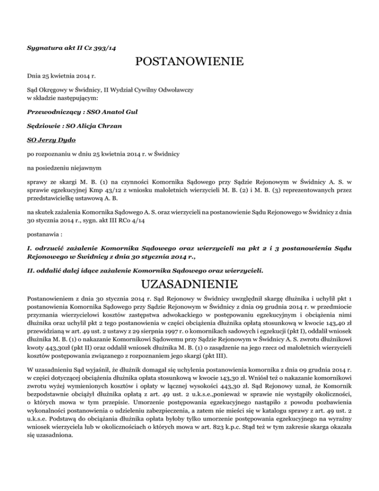 Sygnatura akt II Cz 393/14 POSTANOWIENIE Dnia 25 kwietnia 2014 r. Sąd Okręgowy w Świdnicy, II Wydział Cywilny Odwoławczy w składzie następującym: Przewodniczący : SSO Anatol Gul Sędziowie : SO Alicja Chrzan SO Jerzy Dydo po rozpoznaniu w dniu 25 kwietnia 2014 r. w Świdnicy na posiedzeniu niejawnym sprawy ze skargi M. B. (1) na czynności Komornika Sądowego przy Sądzie Rejonowym w Świdnicy A. S. w sprawie egzekucyjnej Kmp 43/12 z wniosku małoletnich wierzycieli M. B. (2) i M. B. (3) reprezentowanych przez przedstawicielkę ustawową A. B. na skutek zażalenia Komornika Sądowego A. S. oraz wierzycieli na postanowienie Sądu Rejonowego w Świdnicy z dnia 30 stycznia 2014 r., sygn. akt III RCo 4/14 postanawia : I. odrzucić zażalenie Komornika Sądowego oraz wierzycieli na pkt 2 i 3 postanowienia Sądu Rejonowego w Świdnicy z dnia 30 stycznia 2014 r., II. oddalić dalej idące zażalenie Komornika Sądowego oraz wierzycieli. UZASADNIENIE Postanowieniem z dnia 30 stycznia 2014 r. Sąd Rejonowy w Świdnicy uwzględnił skargę dłużnika i uchylił pkt 1 postanowienia Komornika Sądowego przy Sądzie Rejonowym w Świdnicy z dnia 09 grudnia 2014 r. w przedmiocie przyznania wierzycielowi kosztów zastępstwa adwokackiego w postępowaniu egzekucyjnym i obciążenia nimi dłużnika oraz uchylił pkt 2 tego postanowienia w części obciążenia dłużnika opłatą stosunkową w kwocie 143,40 zł przewidzianą w art. 49 ust. 2 ustawy z 29 sierpnia 1997 r. o komornikach sadowych i egzekucji (pkt I), oddalił wniosek dłużnika M. B. (1) o nakazanie Komornikowi Sądowemu przy Sądzie Rejonowym w Świdnicy A. S. zwrotu dłużnikowi kwoty 443,30zł (pkt II) oraz oddalił wniosek dłużnika M. B. (1) o zasądzenie na jego rzecz od małoletnich wierzycieli kosztów postępowania związanego z rozpoznaniem jego skargi (pkt III). W uzasadnieniu Sąd wyjaśnił, że dłużnik domagał się uchylenia postanowienia komornika z dnia 09 grudnia 2014 r. w części dotyczącej obciążenia dłużnika opłata stosunkową w kwocie 143,30 zł. Wniósł też o nakazanie komornikowi zwrotu wyżej wymienionych kosztów i opłaty w łącznej wysokości 443,30 zł. Sąd Rejonowy uznał, że Komornik bezpodstawnie obciążył dłużnika opłatą z art. 49 ust. 2 u.k.s.e.,ponieważ w sprawie nie wystąpiły okoliczności, o których mowa w tym przepisie. Umorzenie postępowania egzekucyjnego nastąpiło z powodu pozbawienia wykonalności postanowienia o udzieleniu zabezpieczenia, a zatem nie mieści się w katalogu sprawy z art. 49 ust. 2 u.k.s.e. Podstawą do obciążania dłużnika opłata byłoby tylko umorzenie postępowania egzekucyjnego na wyraźny wniosek wierzyciela lub w okolicznościach o których mowa w art. 823 k.p.c. Stąd też w tym zakresie skarga okazała się uzasadniona. Sąd uwzględnił skargę również w odniesieniu do postanowienia komornika o obciążeniu dłużnika kosztami zastępstwa adwokackiego za postępowanie egzekucyjne. Wskazał, że w dniu 07 listopada 2012 r. Komornik wydał już pierwsze postanowienie w przedmiocie obciążenia dłużnika kosztami zastępstwa adwokackiego za postępowanie egzekucyjne, które się uprawomocniło i które w myśl art. 770 k.p.c. w zw. z art. 743 § 1 k.p.c. stanowiło tytuł oraz podlegało wykonaniu. Wobec tego, że wcześniejsze postanowienie komornika w tym przedmiocie wywołało skutki prawne, nieuzasadnione było ponowne wydanie przez Komornika postanowienia w tym samym przedmiocie. Jako nieuzasadniony okazał się natomiast wniosek dłużnika o nakazanie Komornikowi zwrotu kwoty 443,30 zł bowiem sąd nie jest uprawniony do rozstrzygania w tym przedmiocie w postępowaniu skargowym. Dłużnikowi przysługują w tym zakresie odrębne roszczenia, które może realizować na drodze odrębnego postępowania cywilnego, dopiero po rozpoznaniu jego skargi. Nie uwzględniono również wniosku dłużnika o zasadzenie na jego rzecz kosztów postępowania skargowego, opierając rozstrzygnięcie w tym zakresie na art. 102 k.p.c w zw. z art. 13 § 2 k.p.c. Zażalenie na powyższe postanowienie wniósł Komornik Sądowy oraz wierzyciele. Komornik zaskarżył je w całości, domagając się jego uchylenia. Wierzyciele wnieśli o uchylenie zaskarżonego postanowienia i oddalenia skargi jako bezzasadnej, przy uwzględnieniu kosztów postępowania zażaleniowego. Sąd Okręgowy zważył : W pierwszej kolejności zauważyć należy, że skarżący – zarówno Komornik Sądowy jak i wierzyciele - zaskarżyli postanowienie Sądu I instancji w całości. W punkcie 2 tego postanowienia Sąd oddalił wniosek dłużnika o nakazanie Komornikowi Sądowemu przy Sądzie Rejonowym w Świdnicy A. S. zwrotu dłużnikowi 443,30 zł, a w punkcie 3 oddalił wniosek dłużnika o zasądzenie na jego rzecz od małoletnich wierzycieli kosztów postępowania związanego z rozpoznaniem jego skargi. Stwierdzić zatem trzeba, że skarżący nie posiadają żadnego interesu prawnego w zaskarżeniu rozstrzygnięcia w tym zakresie. Interes prawny w zaskarżeniu orzeczenia zachodzący w razie niezgodności orzeczenia z żądaniem, czyli w wypadku gravamen, stanowi warunek dopuszczalności zaskarżalności orzeczenia. Oznacza to, że środek zaskarżenia jest dopuszczalny w zasadzie tylko od orzeczenia niekorzystnego dla strony. W punkcie 2 Sąd Rejonowy oddalił skargę dłużnika, tak więc trudno doszukać się interesu prawnego w złożonych co do tej części zażaleniach, w szczególności, że na takowy nie powołują się również skarżący. Podobnie jest w przypadku zaskarżonego pkt. 3 postanowienia, który jest korzystny dla wierzycieli, zaś dla Komornika nie ma żadnego znaczenia prawnego. Wobec powyższego Sąd Okręgowy odrzucił zażalenie Komornika Sądowego oraz wierzycieli co do pkt. 2 i 3 zaskarżonego postanowienia w oparciu o art. 373 k.p.c. w zw. z art. 397 § 2 zd. 2 k.p.c. i w zw. z art. 13 § 2 k.p.c. orzekając jak w punkcie I przedmiotowego orzeczenia