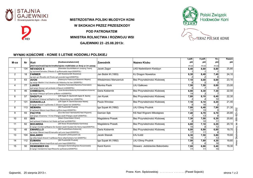 MISTRZOSTWA POLSKI MŁODYCH KONI W SKOKACH PRZEZ PRZESZKODY POD PATRONATEM MINISTRA ROLNICTWA I ROZWOJU WSI GAJEWNIKI 23 -25.08.2013r. WYNIKI KOŃCOWE - KONIE 5 LETNIE HODOWLI POLSKIEJ Nr Koń Zawodnik Nazwa Klubu płeć\rasa\maść\ojciec\matka/ojciec matki\data ur.\kraj ur.\nr paszp. 1 2 3 4 134 [Stanisław Szurik\Makrum Jumping Team] Jacek Zagor LKS Nadwiślanin Kwidzyn 18 og.\sp\siwa\Calvados Z\Nestia S sp/Romualdo kwpn\2008\POL\ [SK Nowielice\SK Nowielice] FARMER Jan Bobik M (1993) KJ Dragon Nowielice 63 og.\sp\c.gn.\Rovetto old.\Feola sp/Lavendel kwpn\2008\POL\ [Katarzyna Pawluczuk\Sławomir Miąsko] AVON Włodzimierz Marszeniuk Bez Przynależności Klubowej 77 og.\sp\gn.\Baldini II hol.\Aneline old./Adlantus As han.\2008\POL\ [Karolina Ferenstein\Karolina Ferenstein] LUKIER Monika Pasik LKJ Gałkowo NEVADOS S wał.\sp\gn.\Iloczyn sp\Lambada m/Hipovit m\2008\POL\ 5 6 7 8 9 10 11 12 13 14 15 [Jacek Bondaruk\Bartłomiej Woźniak&Daria Kobiernik] 46 CHIMEQUYL Daria Kobiernik Bez Przynależności Klubowej 57 og.\sp\gn.\Imequyl sp\Czana sp/Balon m\2008\POL\ [GR Dąbki R. Barlik\GR Dąbki R. Barlik] SAQUYLA Jan Kurek Bez Przynależności Klubowej 131 kl.\sp\kaszt.\Imequyl sp\Saphira han./Stolzenberg han.\2008\POL\ [GR Dąbki R. Barlik\Stanisław Malek] DORAVELLA Paula Wincław Bez Przynależności Klubowej 113 kl.\sp\gn.\Aravel II sp\Doretta Z Z/Dutch Capitol hol.\2008\POL\ [SK Prudnik\SK Prudnik] NEMARA Iga Szpak M (1992) LKJ Olimp Prudnik 93 kl.\sp\kaszt.\Maram kwpn\Newis sp/Elvis kwpn\2008\POL\ [Eco-Abi Ewa Fabińska\KS Nad Wigrami] PACYFIK Damian Sęk KS Nad Wigrami Mikołajewo 83 wał.\sp\gn.\Charisma 115 hol.\Palegra westf./Palegro westf.\2008\POL\ [Adam Omen\Adam Omen] IBIS Magdalena Prasek Bez Przynależności Klubowej 82 wał.\sp\kaszt.\Calderon hol.\Iliada sp/Czad sp\2008\POL\ [SK Nowa Wioska\Natalia Kamińska] BOCARDIA Magdalena Prasek Bez Przynależności Klubowej 48 kl.\sp\gn.\Cordial sp\Bojana De Guidam westf./Guidam De Henry bwp\2008\POL\ [SK Prudnik\Daria Kobiernik] EMARELLO Daria Kobiernik Bez Przynależności Klubowej 104 og.\sp\gn.\Maram kwpn\Emanuelle sp/Luron kwpn\2008\POL\ [Krzysztof Lik\Krzysztof Lik] BAILANDO Jacek Stasiak ŁKJ Łódź 112 og.\wlkp.\kaszt.\Aravel II sp\Bossa Nova wlkp/Carbano hol.\2008\POL\ [SK Prudnik\SK Prudnik] EUMARA Iga Szpak M (1992) LKJ Olimp Prudnik kl.\sp\kaszt.\Maram kwpn\Eula sp/Luron kwpn\2008\POL\ [Grzegorz Komin\Zbigniew Koczorowski] REMEMBER KG Karol Komin Stowarz. Jeździeckie Baborówko 50 kl.\sp\gn.\Vandamme kwpn\Rosocha sp/Dularus\2008\POL\ Gajewniki, 25 sierpnia 2013 r. I półf. II półf. fin. Razem pkt pkt pkt pkt m-ce m-ce m-ce 8,40 1 8,30 2 7,10 9 7,50 5 6,90 14 7,80 3 7,10 9 7,00 11 7,40 7 7,30 8 6,80 15 6,00 17 6,30 16 7,50 5 7,00 11 8,60 1 8,40 2 8,00 5 7,50 7 8,30 3 8,10 4 6,10 16 6,40 15 6,70 13 7,00 10 7,10 9 6,90 11 7,50 7 7,80 6 6,90 11 8,80 1 7,40 6 8,00 3 8,00 3 7,30 7 6,40 10 8,20 2 7,90 5 6,70 9 6,30 11 6,20 12 6,80 8 5,80 13 4,30 16 5,40 15 Przew. Kom. Sędziowskiej: . . . . . . . . . . . . . . . . (Paweł Sojecki) 25,80 24,10 23,10 23,00 22,50 22,30 21,40 21,30 20,80 20,60 20,10 19,70 19,60 19,60 19,30 Anna Głoskowska, tel. 695-923-252 M-ce [hodowca\właściciel] strona 1 z 2 M-ce Nr Koń [hodowca\właściciel] Zawodnik płeć\rasa\maść\ojciec\matka/ojciec matki\data ur.\kraj ur.\nr paszp. 16 - [SK Prudnik\Zbigniew Kruk] 73 JAKMARA 16 kl.\sp\kaszt.\Maram kwpn\Jakla sp/Luron kwpn\2008\POL\ [Eco-Abi Ewa Fabińska\KS Nad Wigrami] LA CUMPARSITA Marcin Murdzia KJ Zbyszko Nowosolna Katarzyna Bobrowska M (1993) KS Nad Wigrami Mikołajewo kl.\sp\siwa\Corland hol.\La Jana old./Landadel hol.\2008\POL\ Gospodarz toru: Łukasz Jankowski Komisja orzekająca: Paweł Sojecki, Wojciech Frankowski, Bogusława Długosz, Agnieszka Kowalska-Stasiak I półf. II półf. fin. Razem pkt pkt pkt pkt m-ce m-ce m-ce 7,00 11 7,80 3 6,50 14 4,10 17 5,60 14 wycof. Nazwa Klubu 19,10 Anna Głoskowska, tel. 695-92 WYNIKI KOŃCOWE - KONIE 5 LETNIE HODOWLI POLSKIEJ Przewodniczący Komisji Sędziowskiej ............................ Paweł Sojecki Gajewniki, 25 sierpnia 2013 r. strona 2 z 2 MISTRZOSTWA POLSKI MŁODYCH KONI W SKOKACH PRZEZ PRZESZKODY POD PATRONATEM MINISTRA ROLNICTWA I ROZWOJU WSI GAJEWNIKI 23 -25.08.2013r. WYNIKI KOēCOWE - KONIE 5 LETNIE HODOWLI ZAGRANICZNEJ Nr KoĔ Zawodnik Nazwa Klubu płeü\rasa\maĞü\ojciec\matka/ojciec matki\data ur.\kraj ur.\nr paszp. 1 2 3 4 5 6 7 8 9 10 11 12 13 14 15 16 81 [Holandia\Leszek Sasinowski] Krzysztof Prasek Bez PrzynaleĪnoĞci Klubowej og.\kwpn\gn.\Vincenzo kwpn\Valanita kwpn/Placido kwpn\2008\NED\ [Niemcy\Piotr Strzałkowski] LAPIS G-T Antoni Strzałkowski M (1993) KJ Strzała Krubiczew og.\han.\gn.\Stakkakto Gold han.\Lady Larissa han./Landadel hol.\2008\GER\ [Niemcy\Roman Siwek] CONTENDROS Jacek Bobik KJ Dragon Nowielice og.\hol.\gn.\Contender hol.\Libertina hol./Libertino hol.\2008\GER\ [Niemcy\Jan Ludwiczak] ROMINA L Marcin BĊtkowski KJ Agro-Handel ĝrem kl.\westf.\siwa\Potential old.\Romira westf./Grossadmiral westf.\2008\GER\ [Holandia\Kazimiera Siewior] DURANO G Michał ZiĊbicki KJK Szary Michałowice og.\kwpn\siwa\Canturano hol.\Zienna G kwpn/Indorado hol.\2008\NED\ [Małgorzata Siergiej\Jacek Muraczewski] CURACAO Joanna Rosicka JKS Rafi Gorzów Wlkp. og.\old.\siwa\Cola hol.\Bavaria sp/Castilio hol.\2008\GER\ [ElĪbieta Mallert\ElĪbieta Mallert] CONTENDRO LADY Beniamin Tomaszewski KJ LeĞna Podkowa Damaszka 27 kl.\westf.\sk.gn.\Contendro I hol.\Rubin Lady han./Rotspon han.\2008\GER\ [Holandia\KS Nad Wigrami] DJARVI B Agnieszka Cichanowicz J (1995) KS Nad Wigrami Mikołajewo 28 kl.\kwpn\kara\Zento kwpn\Passe Partout B kwpn/Karlstad kwpn\2008\NED\ [M. i T. Siergiej\Marta Emirsajłow] CASTELLO BRANCO Marta Emirsajłow M (1993) JKS Tornado Szczecin og.\old.\gn. w siw.\Cassin hol.\Politesse d'Ete sf/Italic des Salines sf\2008\GER\ [Niemcy\Wechta Sp. z o.o.] LIMTENDER Marek Wacławik KJ Wechta Rosnówko og.\hol.\sk.gn.\Limbus hol.\Tyrah hol./Contender hol.\2008\GER\ [Niemcy\Wecht