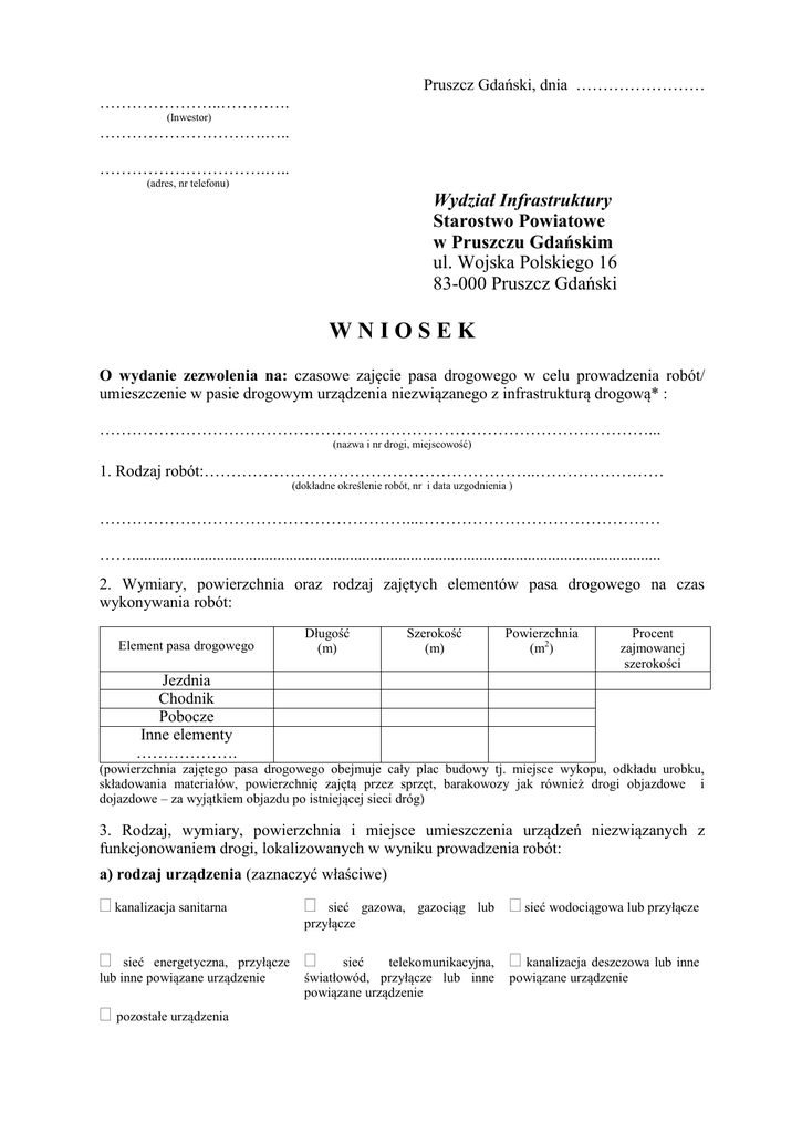 Pruszcz Gdański, dnia …………………… …………………..…………. (Inwestor) ………………………….….. ………………………….….. (adres, nr telefonu) Wydział Infrastruktury Starostwo Powiatowe w Pruszczu Gdańskim ul. Wojska Polskiego 16 83-000 Pruszcz Gdański WNIOSEK O wydanie zezwolenia na: czasowe zajęcie pasa drogowego w celu prowadzenia robót/ umieszczenie w pasie drogowym urządzenia niezwiązanego z infrastrukturą drogową* : …………………………………………………………………………………………... (nazwa i nr drogi, miejscowość) 1. Rodzaj robót:……………………………………………………..…………………… (dokładne określenie robót, nr i data uzgodnienia ) …………………………………………………...……………………………………… ……................................................................................................................................... 2. Wymiary, powierzchnia oraz rodzaj zajętych elementów pasa drogowego na czas wykonywania robót: Element pasa drogowego Długość (m) Szerokość (m) Powierzchnia (m2) Procent zajmowanej szerokości Jezdnia Chodnik Pobocze Inne elementy ………………. (powierzchnia zajętego pasa drogowego obejmuje cały plac budowy tj. miejsce wykopu, odkładu urobku, składowania materiałów, powierzchnię zajętą przez sprzęt, barakowozy jak również drogi objazdowe i dojazdowe – za wyjątkiem objazdu po istniejącej sieci dróg) 3. Rodzaj, wymiary, powierzchnia i miejsce umieszczenia urządzeń niezwiązanych z funkcjonowaniem drogi, lokalizowanych w wyniku prowadzenia robót: a) rodzaj urządzenia (zaznaczyć właściwe) kanalizacja sanitarna sieć wodociągowa lub przyłącze kanalizacja deszczowa lub inne sieć energetyczna, przyłącze lub inne powiązane urządzenie pozostałe urządzenia sieć gazowa, gazociąg lub przyłącze sieć telekomunikacyjna, światłowód, przyłącze lub inne powiązane urządzenie powiązane urządzenie b) powierzchnia i miejsce umieszczenia Powierzchnia zajmowana przez rzut poziomy urządzenia (m2) w jezdni lub chodniku na drogowym inżynierskim obiekcie w pozostałych elementach pasa drogowego ………………………………………………………………….………………………. ………………………………………………………………….………………………. ………………………………………………………………….………………………. 4. Generalnym wykonawcą robót będzie: ………………………………………………………………….………………………. ………………………………………………………………….………………………. (Nazwa, adres, nr telefonu) 5. Osoba nadzorująca roboty związane z zajęciem pasa drogowego; odpowiedzialna za ich prawidłową realizację, zgodnie z obowiązującymi przepisami dotyczącymi dróg publicznych: ………………………………………………………………………………………………… (Imię, nazwisko, adres, nr telefonu) ………………………………………………………………………………………………… 6. Okres zajęcia pasa drogowego planuje się: Od dnia…………………………….…..do dnia…………………………………………… (za okres końcowy zajęcia uważa się dzień zakończenia robót i doprowadzenia pasa drogowego do stanu zgodnego z wydaną decyzją oraz przekazania go protokółem odbioru przez przedstawiciela Starostwa Powiatowego w Pruszczu Gdańskim). Uwaga: Jeżeli roboty będą prowadzone bez wymaganej opłaconej decyzji, zarządca drogi zgodnie z art. 40 ust. 12 ustawy z dnia 21 marca 1985 r. o drogach publicznych (tekst jednolity Dz. U. z 2013 r., poz. 260 ze zm.) naliczy stosowną karę pieniężną z tytułu samowolnego zajęcia pasa drogowego. ……………………………….. Podpis Inwestora Do wniosku dołącza się*: 1. plan sytuacyjny z domiarami i zajętą powierzchnią pasa drogowego zakreśloną kolorem czerwonym, 2. przekrój poprzeczny zajętego pasa drogowego z naniesionymi urządzeniami umieszczonymi w pasie drogowym, 3. harmonogram robót w przypadku długotrwałego zajęcia pasa, 4. zobowiązanie Inwestora wymagane w decyzji, 5. projekt organizacji ruchu zatwierdzony przez właściwy organ zarządzający ruchem, 6. uzgodnienie dokumentacji – kserokopia. * / niepotrzebne skreślić