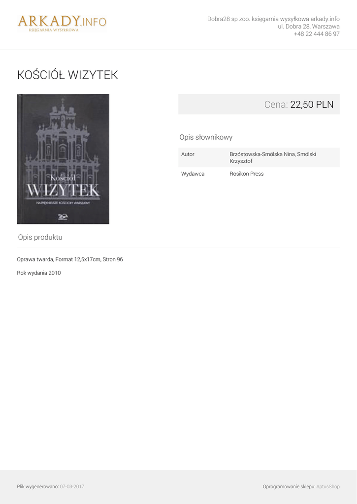 Dobra28 sp zoo. księgarnia wysyłkowa arkady.info ul. Dobra 28, Warszawa +48 22 444 86 97 KOŚCIÓŁ WIZYTEK Cena: 22,50 PLN Opis słownikowy Autor Brzóstowska-Smólska Nina, Smólski Krzysztof Wydawca Rosikon Press Opis produktu Oprawa twarda, Format 12,5x17cm, Stron 96 Rok wydania 2010 Plik wygenerowano: 07-03-2017 Powered by TCPDF (www.tcpdf.org) Oprogramowanie sklepu: AptusShop