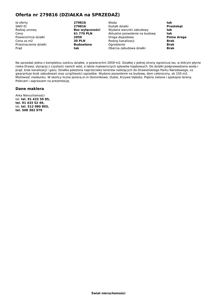 Oferta nr 279816 (DZIAŁKA na SPRZEDAŻ) Id oferty SWO ID Rodzaj umowy Cena Powierzchnia działki Cena za m2 Przeznaczenie działki Prąd 279816 279816 Bez wyłączności 61 770 PLN 2059 30 PLN Budowlana tak Woda Kształt działki Wydane warunki zabudowy Aktualne pozwolenie na budowę Droga dojazdowa Rodzaj kanalizacji Ogrodzenie Obecna zabudowa działki tak Prostokąt tak tak Polna droga Brak Brak Brak Na sprzedaż jedna z kompleksu sześciu działek, o powierzchni 2059 m2. Działkę z jednej strony ogranicza las, w którym płynie rzeka Drawa, słynącej z czystości swoich wód, a także malowniczych spływów kajakowych. Do działki podprowadzona woda i prąd, brak kanalizacji i gazu. Działka położona naprzeciwko terenów należących do Drawieńskiego Parku Narodowego, co gwarantuje brak zabudowań oraz uciążliwości sąsiadów. Wydano pozwolenie na budowę, dom całoroczny, ok 150 m2. Możliwość meldunku. W okolicy liczne jeziora,m.in Dominikowo, Dubie, Krzywe Dębsko. Piękne zielone i spokojne tereny. Polecam i zapraszam na prezentację. Dane maklera Arka Nieruchomości tel. tel. 91 433 59 85, tel. 91 433 52 49, tel. tel. 512 080 803, tel. 508 382 979 Świat nieruchomości Powered by TCPDF (www.tcpdf.org)