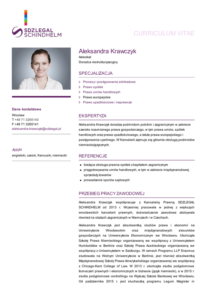 CURRICULUM VITAE Aleksandra Krawczyk Adwokat Doradca restrukturyzacyjny SPECJALIZACJA Procesy i postępowania arbitrażowe Prawo spółek Prawo umów handlowych Prawo europejskie Prawo upadłościowe i naprawcze Dane kontaktowe Wroclaw T +48 71 3265140 F +48 71 3265141 [email protected] EKSPERTYZA Aleksandra Krawczyk doradza podmiotom polskim i zagranicznym w zakresie szeroko rozumianego prawa gospodarczego, w tym prawa umów, spółek handlowych oraz prawa upadłościowego, a także prawa europejskiego i postępowania cywilnego. W Kancelarii zajmuje się głównie obsługą podmiotów niemieckojęzycznych. Języki angielski, czeski, francuski, niemiecki REFERENCJE bieżąca obsługa prawna spółek z kapitałem zagranicznym przygotowywanie umów handlowych, w tym w zakresie międzynarodowej sprzedaży towarów prowadzenie sporów sądowych PRZEBIEG PRACY ZAWODOWEJ Aleksandra Krawczyk współpracuje z Kancelarią Prawną SDZLEGAL SCHINDHELM od 2013 r. Wcześniej pracowała w jednej z większych wrocławskich kancelarii prawnych, doświadczenie zawodowe zdobywała również na stażach zagranicznych w Niemczech i w Czechach. Aleksandra Krawczyk jest absolwentką studiów prawa i ekonomii na Uniwersytecie Wrocławskim oraz międzynarodowych stosunków gospodarczych na Uniwersytecie Ekonomicznym we Wrocławiu. Ukończyła Szkołę Prawa Niemieckiego organizowaną we współpracy z Uniwersytetem Humboldtów w Berlinie oraz Szkołę Prawa Austriackiego organizowaną we współpracy z Uniwersytetem w Salzburgu. W ramach Programu LLP Erasmus studiowała na Wolnym Uniwersytecie w Berlinie, jest również absolwentką Międzynarodowej Szkoły Prawa Amerykańskiego organizowanej we współpracy z Chicago-Kent College of Law. W 2013 r. ukończyła studia podyplomowe tłumaczeń prawnych i ekonomicznych w biznesie (język niemiecki), a w 2015 r. studia podyplomowe controllingu na Wyższej Szkole Bankowej we Wrocławiu. Od października 2015 r. jest słuchaczką programu Legum Magister in Unternehmensrestrukturierung (LL.M. corp. restruc.) na Uniwersytecie Ruprechta-Karola w Heidelbergu. Jest laureatką konkursów typu moot court oraz autorką wielu artykułów z zakresu prawa spółek i prawa upadłościowego. Od czerwca 2015 roku wpisana na listę adwokatów przy Okręgowej Radzie Adwokackiej we Wrocławiu, a od stycznia 2017 roku na listę osób posiadających licencję doradcy restrukturyzacyjnego.