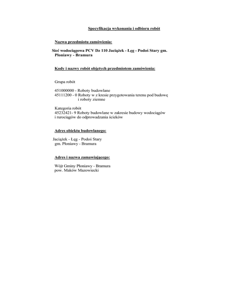 Specyfikacja wykonania i odbioru robót Nazwa przedmiotu zamówienia: Sieć wodociągowa PCV Dz 110 JaciąŜek - Łęg - Podoś Stary gm. Płoniawy - Bramura Kody i nazwy robót objętych przedmiotem zamówienia: Grupa robót 451000000 - Roboty budowlane 45111200 - 0 Roboty w z kresie przygotowania terenu pod budowę i roboty ziemne Kategoria robót 45232421- 9 Roboty budowlane w zakresie budowy wodociągów i rurociągów do odprowadzania ścieków Adres obiektu budowlanego: JaciąŜek - Łęg - Podoś Stary gm. Płoniawy - Bramura Adres i nazwa zamawiającego: Wójt Gminy Płoniawy - Bramura pow. Maków Mazowiecki Zawartość opracowania Specyfikacja Techniczna wykonania i odbioru robót Sieć wodociągowa PCV Dz 110 JaciąŜek - Łęg - Podoś Stary gm. Płoniawy - Bramura 1. Przedmiot specyfikacji technicznej 2. Zakres stosowania specyfikacji 3. Zakres robót objętych specyfikacją 4. Określenia podstawowe 5. Ogólne wymagania dotyczące robót 6. Prace przygotowawcze 7. Materiały 7.1. Materiał - przewód wodociągowy 7.2. Materiał - przyłącza wodociągowe. 7.3. Transport i składowanie rur z tworzyw sztucznych 8. Sprzęt 9. Roboty ziemne 9.1. Podsypka 9.2. Zasypka i zgęszczanie gruntu 10. Roboty montaŜowe 11. Łączenie kielichowych rur PCV i PE 12. Rury ochronne stalowe i PE 13. Przejścia pod przeszkodami 14. Kontrola jakości robót 15. Próby szczelności 16. Płukanie i dezynfekcja 16.1. Przewód wodociągowy 17. Odbiór robót 17.1. Odbiór częściowy 17.2. Odbiór techniczny końcowy 18. Podstawa płatności 18.1. Ustalenia ogólne 18.2. Obsługa geodezyjna 18.3. Dokumentacja powykonawcza i projekty organizacji ruchu 18.4 Zabezpieczenie terenu budowy 18.5. Koszty zajęcia pasa drogowego. 19. Przepisy związane 2 Specyfikacja Techniczna Sieć wodociągowa PCV Dz 110 JaciąŜek - Łęg - Stary Podoś Gmina Płoniawy - Bramura 1. Przedmiot specyfikacji technicznej Przedmiotem niniejszej specyfikacji technicznej są wymagania dotyczące wykonania i odbioru robót dotyczących budowy sieci wodociągowej PCV i PE Dz 110 JaciąŜek - Łęg - Podoś Stary gm. Płoniawy - Bramura 2. Zakres stosowania specyfikacji Specyfikacja techniczna stosowana jest jako dokument przetargowy i kontraktowy przy zlecaniu i realizacji robót wymienionych w punkcie 1. 3. Zakres robót objętych specyfikacją Roboty których dotyczy specyfikacja, obejmują wszystkie czynności umoŜliwiające i mające na celu budowę sieci wodociągowej wraz z przyłączem. Niniejsza specyfikacja techniczna związana jest z wykonaniem n/w robót: • Budowa sieci wodociągowej z rur PCV Dz 110 • Budowa sieci wodociągowej z rur PE Dz 110 • MontaŜ hydrantów nadziemnych Dn 80 mm 4. Określenia podstawowe • • • • • • Przewód wodociągowy - rurociąg wraz z niezbędnym uzbrojeniem słuŜący do transportu wody przeznaczonej do spoŜycia przez ludzi i przeznaczony do rozprowadzania wody do przyłączy wodociągowych. Przyłącze wodociągowe - przewód przeznaczony do doprowadzenia wody do instalacji wodociągowej wraz urządzeniem pomiarowym zuŜycia wody i kompletem armatury odcinającej Uzbrojenie przewodu - armatura i urządzenia pomiarowe zapewniające działanie i eksploatację przewodów wodociągowych. obciąŜeń zewnętrznych i do zabezpieczenia rurociągu przy przej ściu pod przeszkodą terenową. Odbiór techniczny częściowy - odbiór przeprowadzany w stosunku do faz zanikających lub elementów, które podlegają zakryciu Odbiór techniczny końcowy - odbiór całkowicie wykonanej instalacji lub sieci przed przekazaniem do eksploatacji. 5. Ogólne wymagania dotyczące robót Budowa sieci wodociągowej winna być prowadzona zgodnie z zatwierdzoną dokumentacją projektową sporządzoną w oparciu o obowiązujące normy i przepisy, z materiałów zapewniających prawidłowe jej wykonanie i eksploatację. 6. Prace przygotowawcze Przed przystąpieniem do budowy wykonawca winien: • wyznaczyć miejsce usytuowania zaplecza budowy • wyznaczyć miejsca składowania materiałów, drogę dojazdową do strefy montaŜowej • wyznaczyć w terenie trasę przewodu wodociągowego 7. Materiały Przy budowie przewodu wodociągowego mogą być stosowane wyroby producentów krajowych i zagranicznych posiadające aprobaty techniczne wydane przez odpowiednie Instytuty Badawcze. Przed zastosowaniem wyrobu wykonawca uzyska akceptację Inspektora Nadzoru. Wszystkie elementy składowe przewodu wodociągowego ( rury, kształtki, uszczelki, armatura itp.) powinny pod względem jakości spełniać wymagania określone odpo- wiednimi normami, aprobatami i przepisami. 7.1. Materiał - przewód wodociągowy Przewód wodociągowy wykonać z rur i kształtek wodociągowych PCV z kielichem i uszczelką wargową PN 10, rur i kształtek wodociągowych PE SDR17 PE100, kształtek Ŝeliwnych kołnierzowych i armatury Ŝeliwnej kołnierzowej na ciśnienie 1,00 MPa. Rury i kształtki winny posiadać atesty PZH. 7.2. Materiał - przyłącza wodociągowe. Przyłącze wodociągowe wykonane zostanie z rur ciśnieniowych PCV PN 10 kielichowych łączonych na uszczelkę. Podłączenie do sieci wykonać za pomocą opaski z nawiertką. Na podejściu wodomierzowym oprócz zaworów odcinających zamontować od strony instalacji wewnętrznej budynku zawór antyskaŜeniowy typu EA. Wodomierze montować zgodnie z PN-B-10720, PN - ISO 4064-2 + Adl, PN-EN-1717:2003. Przejścia rurociągu przyłącza wodociągowego przez ściany budowli wykonać w tulei ochronnej z rury PCV. Końcówki tulei naleŜy uszczelnić materiałem elastycznym nie agresywnym w stosunku do PCV. Wodomierz montować w miejscach suchych i ciepłych w sposób umoŜliwiający swobodny dostęp do dokonywania odczytu. 7.3. Transport i składowanie rur z tworzyw sztucznych Transport i składowanie rur i kształtek z tworzyw sztucznych musza być przeprowadzane przy ciągłej obserwacji właściwości tworzyw sztucznych i zewnętrznych warunków panujących podczas pro