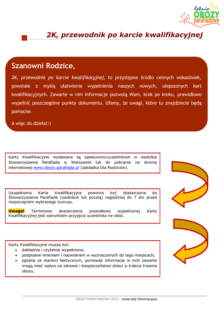 2K, przewodnik po karcie kwalifikacyjnej Szanowni Rodzice, 2K, przewodnik po karcie kwalifikacyjnej, to przystępne źródło cennych wskazówek, powstałe z myślą ułatwienia wypełnienia naszych nowych, ulepszonych kart kwalifikacyjnych. Zawarte w nim informacje pozwolą Wam, krok po kroku, prawidłowo wypełnić poszczególne punkty dokumentu. Ufamy, że uwagi, które tu znajdziecie będą pomocne. A więc do dzieła!:) Karty Kwalifikacyjne wydawane są opiekunom/uczestnikom w siedzibie Stowarzyszenia Parafiada w Warszawie lub do pobrania na stronie internetowej www.obozy.parafiada.pl (zakładka Dla Rodziców). Uzupełniona Karta Kwalifikacyjna powinna być dostarczona do Stowarzyszenia Parafiada (osobiście lub pocztą) najpóźniej do 7 dni przed rozpoczęciem wybranego turnusu. Uwaga! Terminowe dostarczenie prawidłowo wypełnionej Kwalifikacyjnej jest warunkiem przyjęcia uczestnika na obóz. Karty Karty Kwalifikacyjne muszą być: dokładnie i czytelnie wypełnione; podpisane imieniem i nazwiskiem w wyznaczonych do tego miejscach; zgodne ze stanem faktycznym, ponieważ informacje w nich zawarte mogą mieć wpływ na zdrowie i bezpieczeństwo dzieci w trakcie trwania obozu. OBOZY PARAFIADOWE 2013 – materiały informacyjne Poniżej zamieszczamy VADEMECUM 2K, czyli na co zwrócić uwagę przy wypełnianiu poszczególnych punktów Karty Kwalifikacyjnej. Pamiętajcie, że ponosicie całkowitą odpowiedzialność za podanie niepełnych lub nieprawdziwych informacji o swoich dzieciach. Ad. I. INFORMACJA ORGANIZATORA PLACÓWKI WYPOCZYNKU Informacje wpisuje Organizator. Zalecamy, aby przed oddaniem Karty do siedziby Stowarzyszenia zanotować sobie dane kontaktowe do ośrodka. Ad. II. WNIOSEK RODZICÓW/OPIEKUNÓW O SKIEROWANIE DZIECKA NA PLACÓWKĘ WYPOCZYNKU W celu zapewnienia bezpieczeństwa uczestników wypoczynku oraz usprawnienia komunikacji między Organizatorem/kadrą pedagogiczną a rodzicami/opiekunami prosimy o czytelne wypełnienie punktów 1-7. Zwracamy również uwagę o konieczność podania zarówno numerów kontaktowych (najlepiej komórkowych do obojga rodziców) oraz adresu rodziców/opiekunów podczas przebywania dziecka na wypoczynku. Przypominamy również, że do uzyskania świadczeń lekarskich konieczne jest podanie numeru PESEL (dobrą praktyka jest zapisanie dzieciom w notesie lub pamięci telefonu komórkowego, w razie nagłych wypadków). Ad. III. INFORMACJA RODZICÓW/OPIEKUNÓW O STANIE ZDROWIA DZIECKA Prosimy o zamieszczenie ogólnych informacji o zdrowiu dziecka, dolegliwościach, które występowały w ostatnim roku, a także innych istotnych informacji o zdrowiu i kondycji uczestnika (np. zwolnienie z zajęć WF z podaniem powodu, zdiagnozowane ADHD, zaburzenia na tle nerwowym itp.) i ewentualnie zaleceń w tym zakresie dla wychowawców. Jeśli dziecko źle znosi jazdę samochodem, to prosimy o zaopatrzenie go np. w aviomarin lub inny lek uzgodniony z lekarzem. Jeśli dziecko przyjmuje leki, to prosimy o zaopatrzenie uczestnika w ich odpowiednią ilość oraz wpisanie w Karcie sposobu dawkowania. Ad. IV. INFORMACJA O SZCZEPIENIACH Należy wpisać daty szczepień. Zalecane jest również zabranie na obóz książeczki zdrowia dziecka z wpisanymi szczepieniami. Ad. V. INFORMACJA WYCHOWAWCY KLASY O DZIECKU W tym punkcie wychowawca klasy (w przypadku braku możliwości uzyskania opinii wychowawcy klasy - wypełnia rodzic lub opiekun) podaje informacje dotyczące charakteru, zachowania i zainteresowań uczestnika, które mogą być istotne dla wychowawców podczas trwania obozu. Prosimy nie bać się podawać OBOZY PARAFIADOWE 2013 – materiały informacyjne Ad. VI. DEKLARACJA UCZESTNIKA OBOZU Uczestnik obozu zobowiązany jest do złożenia podpisu pod deklaracją. Tym samym zobowiązuje się do przestrzegania regulaminów obozów (podanych również na stronie www.obozy.parafiada.pl) oraz aktywnego uczestnictwa w zajęciach. Pamiętajmy również, że organizowane przez Stowarzyszenie Parafiada Letnie Obozy to nie tylko czas aktywnego, obfitego w zabawy odpoczynku. Zgodnie z ideą Stowarzyszenia w programie przewidziane są także zajęcia formacyjne. Ad. VII. DECYZJA O KWALIFIKACJI UCZESTNIKA Ten punkt wypełnia Koordynator wydelegowany ze strony Stowarzyszenia. Ad. VIII. POTWIERDZENIE POBYTU DZIECKA W PLACÓWCE WYPOCZYNKU Ad. IX. INFORMACJA O STANIE ZDROWIA DZIECKA W CZASIE POBYTU NA PLACÓWCE WYPOCZYNKU (dane o zachorowaniach, urazach, leczenia itp.) Ad. X. UWAGI I SPOSTRZEŻENIA WYCHOWAWCY O UCZESTNIKU PODCZAS POBYTU W PLACÓWCE WYPOCZYNKU Poszczególne punkty wychowawca. wypełniają kolejno kierownik placówki/pielęgniarka OBOZY PARAFIADOWE 2013 – materiały informacyjne lub lekarz/