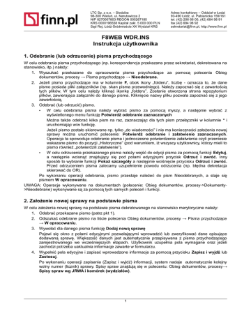 LTC Sp. z o.o. – Siedziba 98-300 Wieluń, ul. Narutowicza 2 NIP 8270007803 REGON 005267185 KRS 0000196558 Kapitał zakł. 5 000 000 PLN Sąd Rej. Łódź-Śródmieście XX Wydział KRS Adres kontaktowy – Oddział w Łodzi 93-490 Łódź, ul. Pabianicka 159/161 tel. (42) 206 66 00, (42) 684 98 91 fax (42) 684 98 92 [email protected], http://www.finn.pl F8WEB WDR.INS Instrukcja użytkownika 1. Odebranie (lub odrzucenie) pisma przychodzącego W celu odebrania pisma przychodzącego (np. korespondencja przekazana przez sekretariat, dekretowana na stanowisko, itp.) należy: 1. Wyszukać przekazane do opracowania pisma przychodzące za pomocą polecenia Obieg dokumentów, procesy → Pisma przychodzące → Nieodebrane. 2. Jeżeli pismo przychodzące ma w kolumnie F, obok ikony „folderu”, liczbę - oznacza to, że dane pismo posiada pliki załączników (np. skan pisma przewodniego). Należy zapoznać się z zawartością tych plików. W tym celu należy kliknąć ikonkę „folderu”. Zostanie otworzona strona repozytorium plików, zawierająca załączniki do danego pisma. Kliknięcie nazwy pliku pozwala zapoznać się z jego zawartością. 3. Odebrać (lub odrzucić) pismo. • W celu odebrania pisma należy wybrać pismo za pomocą myszy, a następnie wybrać z wyświetlonego menu funkcję Potwierdź odebranie zaznaczonych Można także odebrać kilka pism na raz, zaznaczając dla tych pism przełączniki w kolumnie * i uruchomiając w/w funkcję. Jeżeli pismo zostało skierowane np. tylko „do wiadomości” i nie ma konieczności założenia nowej sprawy można uruchomić polecenie: Potwierdź odebranie i załatwienie zaznaczonych. Operacja ta spowoduje odebranie pisma i jednoczesne potwierdzenie załatwienia czyli przeniesie wskazane pismo do pozycji „Historyczne” (pod warunkiem, iż wszyscy użytkownicy, którzy mieli to pismo również „potwierdzili załatwienie”). • W celu odrzucenia przekazanego pisma należy wejść do edycji pisma za pomocą funkcji Edytuj, a następnie wcisnąć znajdujący się pod polami edycyjnymi przycisk Odrzuć i zwróć. Inny sposób to wybranie funkcji Pokaż szczegóły a następnie wciśnięcie przycisku Odrzuć i zwróć. Przed odrzuceniem pisma zalecamy uzupełnienie powodu odrzucenia (np. błędna dekretacja skierować do OR). Po wykonaniu operacji odebrania, pismo przestaje należeć do pism Nieodebranych, a staje się pismem W opracowaniu. UWAGA: Operacje wykonywane na dokumentach (polecenie: Obieg dokumentów, procesy->Dokumenty>Nieodebrane) wykonywane są za pomocą tych samych poleceń i funkcji. 2. Założenie nowej sprawy na podstawie pisma W celu założenia nowej sprawy na podstawie pisma dekretowanego na stanowisko merytoryczne należy: 1. Odebrać przekazane pismo (patrz pkt 1). 2. Odszukać odebrane pismo na liście polecenia Obieg dokumentów, procesy → Pisma przychodzące → W opracowaniu. 3. Wywołać dla danego pisma funkcję Dodaj nową sprawę Pojawi się okno z polami edycyjnymi pozwalającymi wprowadzić lub zweryfikować dane opisujące dodawaną sprawę. Większość danych jest automatycznie przepisywana z pisma przychodzącego zarejestrowanego we wcześniejszych etapach. Użytkownik uzupełnia pola wymagane oraz jeżeli zachodzi potrzeba uaktualnia informacje zawarte w formularzu. 4. Wypełnić pola edycyjne i zapisać wprowadzone informacje za pomocą przycisku Zapisz i wyjdź lub Zastosuj. Po wykonaniu operacji zapisania (Zapisz i wyjdź) informacji, system nadaje automatycznie kolejny wolny numer (licznik) sprawy. Spisy spraw znajdują się w poleceniu: Obieg dokumentów, procesy→ Spisy spraw wg JRWA i komórek (wydziałów). 1 3. Przyłączenie pisma przychodzącego do istniejącej sprawy W przypadku kontynuacji korespondencji w danej sprawie nadawcy z Urzędem, w sytuacji otrzymania kolejnego pisma zarejestrowanego w kancelarii i przekazanego w drodze dekretacji należy: 1. Odebrać przekazane pismo (patrz pkt 1). 2. Odszukać odebrane pismo na liście polecenia Obieg dokumentów, procesy → Pisma przychodzące → W opracowaniu. 3. Wywołać dla danego pisma funkcję Przyłącz do istniejącej sprawy. Pojawi się okno z listą wszystkich spraw. 4. Należy wyszukać odpowiednią sprawę (np. za pomocą filtru komórka lub wg znaku sprawy), a następnie wybrać dla niej funkcję Przyłącz dostępną w menu kontekstowym (lewy przycisk myszy). 4. Przygotowanie pisma wychodzącego W celu przygotowania odpowiedzi w danej sprawie (np. wezwania do uzupełnienia danych we wniosku, decyzji, itd.) należy: 1. Przygotować pismo wychodzące za pomocą dowolnego edytora tekstu i zapisać w pliku na dysku. 2. Uruchomić polecenie Obieg dokumentów, procesy → Spisy spraw wg JRWA i komórek (wydziałów). 3. Wyszukać sprawę związaną z przygotowanym pismem i uruchomić dla niej funkcję Dodaj nowe pismo wychodzące. Zostanie wyświetlone okno z polami edycyjnymi przeznaczonymi na informacje definiujące dodawane pismo wychodzące. 4. Wypełnić pola edycyjne (np. temat, sposób wysłania) i wstępnie zapisać wprowadzone informacje za pomocą przycisku Zastosuj. 5. Po wykonaniu operacji wstępnego zapisu w prawym górnym rogu edytowanego formularza dostęne będzie folder dokumentu. Należy kliknąć ikonę „folderu”, wówczas uruchomione zostanie tzw. „repozytorium plików”. 6. W nowo otworzonym oknie należy kliknąć przycisk Przeglądaj. 7. Wybrać plik na dysku i wcisnąć przycisk Otwórz. 8. Wcisnąć przycisk Wyślij. Wczytany plik pojawi się na liście repozytorium. 9. Zamknąć zakładkę repozytorium. Nastąpi powrót do okna z polami edycyjnymi pisma wychodzącego. Tak stworzony wpis w systemie został automatycznie zarejestrowany pod danym znakiem sprawy. Lista wszystkich nowo stworzonych dokumentów przez danego użytkownika dostępna jest również w poleceniu: Obieg dokumentów → Dokumenty → W opracowaniu. Dokument taki może zostać następnie przekazany w celu akceptacji do 