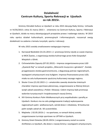 Działalność Centrum Kultury, Sportu Rekreacji w Ujsołach za rok 2015r. Gminny Ośrodek Kultury w Ujsołach w roku 2015 decyzją Rady Gminy- Uchwała nr IV/35/2015 z dnia 31 marca 2015 r. zmieniono na Centrum Kultury, Sportu i Rekreacji w Ujsołach, działa na mocy obowiązujących przepisów prawa i nadanego statutu. W 2015 roku oprócz działań kulturalnych, promocyjnych i informacyjnych, rozszerzył swoją działalność na zadania z tematu turystyki, sportu i rekreacji. W roku 2015 zostały zrealizowane następujące imprezy: 1. Karnawał Beskidzki (31.01.2015 r.)– promocja Gminy Ujsoły w czasie imprezy w MCK Żywiec, z organizacją stoiska kulinarnego przez Koło Gospodyń Wiejskich z Glinki. 2. Cichowiańskie Zapusty (07.02.2015) – impreza zorganizowana przez LGD „Żywiecki Raj” w ramach projektu „Wieczorki muzyczne z góralami”. Zostały przygotowane stoiska gastronomiczne, z degustacją potraw regionalnych, występami artystycznymi oraz kuligiem. Impreza finansowana przez LGD, miała na celu kultywowanie spuścizny kulturowej naszego regionu. 3. Skuter Cross (21.02.2015 r.) – amatorskie zawody skuterów śnieżnych charakter imprezy sportowo-plenerowy, zorganizowane w Złatnej którym wzięli udział zawodnicy z Polski i Słowacji. Celem imprezy była promocja walorów turystycznych i krajobrazowych naszej Gminy. 4. XIV Gminny Konkurs Palm Wielkanocnych przy współudziale z parafią w Ujsołach. Konkurs ma na celu pielęgnowanie tradycji wykonywania regionalnych palm wielkanocnych, wśród dzieci i młodzieży. W konkursie palm wzięło udział ok. 50 uczestników. 5. Majówka ( 02.05.2015r.) - na sportowo, w ramach której zostały zorganizowane turnieje sportowe na UPTAiR w Ujsołach. 6. Gminny Dzień Dziecka (30.05.2015r.) zorganizowany został na scenie Amfitetaru w Ujsołach, dla dzieci z naszej Gminy z występami artystycznymi, atrakcjami malowania twarzy, poczęstunkiem, oraz dmuchanymi atrakcjami z których dzieci korzystały nieodpłatnie. 7. VII Zwyk Bacowski (07.06.2015r.) – cykliczna impreza pasterska o charakterze plenerowym w Soblówce na Polanie. W czasie imprezy miały miejsce obrzędy związane z wypędzaniem owiec na letni wypas (poświęcenie stada i juhasów, mieszanie i dojenie owiec i wyrób sera bunca). Ponadto występy artystyczne zespołów i kapel regionalnych z naszego regionu. 8. XVI Turniej Piłki Kamieńcowej o Puchar Wójta Gminy Ujsoły - impreza sportowa, plenerowa. Udział biorą drużyny sportowe piłki nożnej seniorów, mecze rozgrywają się na boisku Orlika na UPTAiR, w tegorocznym turnieju wzięło udział 7 drużyn po 10 zawodników w każdej, z terenu gminy Ujsoły oraz okolic. 9. VI Koncertowe Lato (18.07.2015)– Koncert Patrycji Markowskiej, oraz 4 supportów zespołów rockowych w tym dwóch rodzimych. Impreza miała charakter masowy i skupiała widownię w każdym wieku w ilości ok. 1500 osób. 10. Wawrzyńcowe Hudy – 2-dniowa impreza o charakterze regionalnym, odbywa się w ramach Tygodnia Kultury Beskidzkiej. W czasie tej imprezy przekazujemy i promujemy spuściznę kulturową Gminy Ujsoły poprzez palenie hudy wawrzyńcowej (ogniska wysokiego na ok. 30 m), a także stwarzamy możliwość podziwiania przez mieszkańców oraz turystów zespołów regionalnych - przedstawicieli folkloru polskiego i zagranicznego. Impreza ta gromadzi widownię zarówno miejscową jak i turystów z całej Polski i Słowacji, mających okazję na stoiskach gastronomicznych zakosztować regionalnej kuchni przygotowanie przez Koła Gospodyń Wiejskich z Gminy Ujsoły oraz zakupić lokalne rękodzieło. W drugim dniu imprezy gościliśmy zespół Future Folk, z repertuarem popfolk, który wzbudził ogromne zainteresowanie wśród zgromadzonej publiczności. 11. Dni Powiatu wraz z konkursem pn „Próbowacka Jodła Góralskiego” (08.08.2015r), Amfiteatr „Pod Grojcem” w Żywcu. Promocja Gminy Ujsoły, na szczeblu powiatowym, zorganizowanie stoiska kulinarno – artystycznego, przez KGW Złatna. W tym roku Gospodynie ze Złatnej zajęły I miejsce w „Próbowacce” w kategorii „potrawy inne” za danie pn. kluski ziemniaczane „cikowki ze skwarkami”. 12. Turniej Piłki Plażowej (16.08.2015), zorganizowany na boisku plażowym w Geo-Parku Glinka, popularyzujący amatorskie rozgrywki w piłkę siatkową. Impreza o charakterze międzynarodowym zorganizowana przy współpracy z Radą Sołecką Glinka. 13. IX Turystyczny Przegląd Piosenki Studenckiej- Danielka 2015 ( 28-30.08.2015 r.) - konkurs promujący walory turystyczne i krajoznawcze Gminy Ujsoły. Był to już trzeci przegląd od czasu reaktywacji Danielki w roku 2013. Poprzednio festiwale w Chałupie Chemików odbywały się w latach 1986 - 1991.Zorganizowany w Ujsołach ul. Danielki przy schronisku Chałupa Chemików przez Stowarzyszenie „Chałupa Chemików” z Katowic z pomocą CKSiR w Ujsołach. W imprezie wzięło udział ok. 1200 osób. 14. II Dożynki Gminne – (13.09.2015) w Soblówce. Celem imprezy jest pielęgnowanie i przekazywanie tradycji regionalnych w temacie dziękczynienia za plony, jest to również promocja Gminy Ujsoły. W programie miały miejsce: korowód barwnych wozów dożynkowych, które przywiozły na miejsce dostojnych Gości oraz delegacje z poszczególnych sołectw, uroczysta Msza św dziękczynna w Kościele Parafialnym w Soblówce, pokaz najpiękniejszy wieniec dożynkowy, poczęstunek dla gości przygotowany przez Gospodynie z KGW z Gminy Ujsoły, występy kapel oraz zespołów regionalnych, stoisko z pamiątkami regionalnymi. 15. Dzień Niepodległości – (11.11.2015r) Koncert pieśni Patriotycznych w wykonaniu zespołu Młode Juhasy w Kościele Parafialnym w Ujsołach. 16. Mikołajki – (4-5.12.2015r.) Obdarowano ok. 150 dzieci upominkami – podopiecznych świetlic z Ujsół, Glinki, Soblówki i Złatnej. 17. Sylwester pod gwiazdami (31.12.2015r) w Geoparku Glinka - na góralską nutę z DJ- em, smakowitymi daniami i napitkami 