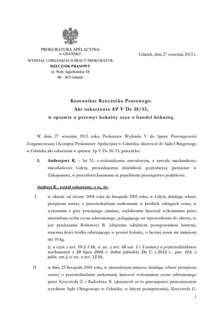 PROKURATURA APELACYJNA w GDAŃSKU Gdańsk, dnia 27 września 2013 r. WYDZIAŁ I ORGANIZACJI PRACY PROKURATUR RZECZNIK PRASOWY ul. Wały Jagiellońskie 38 80 – 853 Gdańsk Komunikat Rzecznika Prasowego. Akt oskarżenia AP V Ds 38/13, w sprawie o przemyt kokainy oraz o handel kokainą. W dniu 27 września 2013 roku, Prokurator Wydziału V do Spraw Przestępczości Zorganizowanej i Korupcji Prokuratury Apelacyjnej w Gdańsku, skierował do Sądu Okręgowego w Gdańsku akt oskarżenia w sprawie Ap V Ds 38/13, przeciwko: 1. Andrzejowi K. – lat 33, o wykształceniu zawodowym, z zawodu mechanikowi, mieszkańcowi Gdyni, prowadzącemu działalność gospodarczą (pensjonat w Zakopanem), w przeszłości karanemu za popełnienie przestępstwo podatkowe. Andrzej K., został oskarżony, o to, że: I. w okresie od wiosny 2004 roku do listopada 2005 roku, w Gdyni, działając wbrew przepisom ustawy o przeciwdziałaniu narkomanii, w krótkich odstępach czasu, w wykonaniu z góry powziętego zamiaru, wielokrotnie kierował wykonaniem przez nieustaloną osobę czynu zabronionego, polegającego na wprowadzeniu do obrotu, to jest przekazaniu Robertowi B. (objętemu odrębnym postępowaniem karnym), znacznej ilości środka odurzającego w postaci kokainy, o łącznej masie nie mniejszej niż 10 kg, tj. o czyn z art. 18 § 1 kk, w zw. z art. 56 ust. 1 i 3 ustawy o przeciwdziałaniu narkomanii z 29 lipca 2005 r. (tekst jednolity Dz. U. z 2012 r., poz. 124, z późn. zm.), w zw. z art. 12 kk, II. w dniu 23 listopada 2004 roku, w nieustalonym miejscu, działając wbrew przepisom ustawy o przeciwdziałaniu narkomanii, kierował wykonaniem czynu zabronionego przez Krzysztofa Ż. i Radosława B. (skazanych za to przestępstwo prawomocnym wyrokiem Sądu Okręgowego w Gdańsku, w innym postępowaniu), Krzysztofa G. 1 (skazanego za to przestępstwo prawomocnym wyrokiem Sądu Okręgowego w Gdańsku, w innym postępowaniu) i Jerzego G. (skazanego za to przestępstwo prawomocnym wyrokiem Sądu Okręgowego w Gdańsku, w innym postępowaniu), polegającego na przywiezieniu z Holandii do Polski (przez przejście graniczne pomiędzy Polską, a Niemcami w Kołbaskowie) znacznej ilości środka odurzającego w postaci kokainy, o łącznej masie 995 gramów, tj. o czyn z art. 18 § 1 kk, w zw. z art. 55 ust. 1 i 3 ustawy o przeciwdziałaniu narkomanii z 29 lipca 2005 r. (tekst jednolity Dz. U. z 2012 r., poz. 124, z późn. zm.), III. w grudniu 2004 r., w Gdyni, działając wbrew przepisom ustawy o przeciwdziałaniu narkomanii, kierował wykonaniem w Tczewie, przez Roberta S. (zmarł przed wydaniem prawomocnego wyroku Sądu Okręgowego w Gdańsku, w jego sprawie), czynu zabronionego, to jest wprowadzeniem do obrotu przez przekazanie Krzysztofowi G. (skazanemu za to przestępstwo prawomocnym wyrokiem Sądu Okręgowego w Gdańsku, w innym postępowaniu), znacznej ilości środka odurzającego w postaci kokainy o łącznej masie nie mniejszej niż 500 gramów, tj. o czyn z art. 18 § 1 kk, w zw. z art. 56 ust. 1 i 3 ustawy o przeciwdziałaniu narkomanii z 29 lipca 2005 r. (tekst jednolity Dz. U. z 2012 r., poz. 124, z późn. zm.), IV. w grudniu 2004 r., w Gdyni, działając wbrew przepisom ustawy o przeciwdziałaniu narkomanii, kierował wykonaniem przez Roberta S. (zmarł przed wydaniem prawomocnego wyroku Sądu Okręgowego w Gdańsku, w jego sprawie), czynu zabronionego, to jest wprowadzeniem do obrotu przez przekazanie Krzysztofowi G. (skazanemu za to przestępstwo prawomocnym wyrokiem Sądu Okręgowego w Gdańsku, w innym postępowaniu), znacznej ilości środka odurzającego w postaci kokainy o łącznej masie nie mniejszej niż 500 gramów, tj. o czyn z art. 18 § 1 kk, w zw. z art. 56 ust. 1 i 3 ustawy o przeciwdziałaniu narkomanii z 29 lipca 2005 r. (tekst jednolity Dz. U. z 2012 r., poz. 124, z późn. zm.), Postępowanie w tej sprawie było kontynuacją śledztwa wszczętego 08 lutego 2006 roku, w rezultacie, którego do różnych sądów na terenie kraju skierowano łącznie szesnaście aktów oskarżenia, przeciwko czterdziestu jeden osobom, mieszkańcom Trójmiasta, którzy (w różnych konfiguracjach osobowych) zostali oskarżeni o popełnienie przestępstw: a/ wywozu za granicę i przywozu zza granicy znacznych ilości środków odurzających i substancji psychotropowych, b/ uczestniczenie w obrocie znacznymi ilościami środków odurzających i substancji psychotropowych, c/puszczanie w obieg podrobionych dolarów USA, i inne. Wyżej wskazane postępowania w większości zakończyły się już prawomocnymi wyrokami skazującymi. 2 Rozdrobnienie ilościowe i osobowe spraw było spowodowane tym, że sprawcy przestępstw ukrywali się przed organami ścigania. Konsekwentna praca śledcza i poszukiwania prowadzone przez funkcjonariuszy gdańskiego Zarządu CBŚ KGP, a także skuteczny nadzór prokuratora Prokuratury Apelacyjnej w Gdańsku, doprowadziły do ujęcia wszystkich poszukiwanych podejrzanych. W większości ukrywający się podejrzani zostali ujęci na terenie Polski. Podejrzani ukrywający się za granicą, po ustaleniu miejsc ich pobytu, zostali wydani do Polski przez państwa obce. Wydania podejrzanych były realizowane w tej sprawie: z USA, z Republiki Peru i dwukrotnie z Królestwa Hiszpanii. Z Królestwa Hiszpanii, w wykonaniu europejskiego nakazu aresztowania, został między innymi wydany oskarżony w niniejszej sprawie Andrzej K., wobec którego nadal jest stosowane tymczasowe aresztowanie. Na wydanie, i na proces karny w Polsce, czeka ostatni poszukiwany, podejrzany Robert B., który w zakładzie karnym w Niemczech odbywa karę 7 lat i 10 miesięcy pozbawienia wolności, orzeczoną przez Sąd Krajowy w Hamburgu, za handel narkotykami na terenie Niemiec. Podejrzany został ujęty na terenie Holandii. Organ sądowy Królestwa Holandii wyraził już zgodę na jego wydanie do Polski, i zostanie wydany, jednak dopiero po odbyciu kary w Niemczech. Andrzejowi K., oskarżonemu w sprawie AP V Ds 38/1
