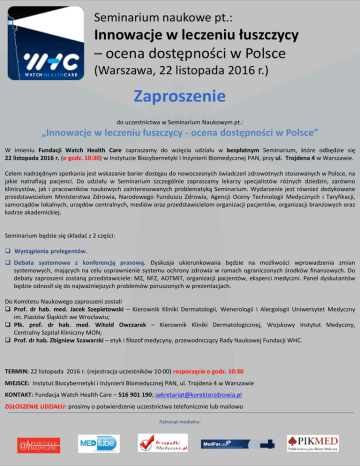 Seminarium naukowe pt.: Innowacje w leczeniu łuszczycy – ocena dostępności w Polsce (Warszawa, 22 listopada 2016 r.) Zaproszenie do uczestnictwa w Seminarium Naukowym pt.: „Innowacje w leczeniu łuszczycy - ocena dostępności w Polsce” W imieniu Fundacji Watch Health Care zapraszamy do wzięcia udziału w bezpłatnym Seminarium, które odbędzie się 22 listopada 2016 r. (o godz. 10:30) w Instytucie Biocybernetyki i Inżynierii Biomedycznej PAN, przy ul. Trojdena 4 w Warszawie. Celem nadrzędnym spotkania jest wskazanie barier dostępu do nowoczesnych świadczeń zdrowotnych stosowanych w Polsce, na jakie natrafiają pacjenci. Do udziału w Seminarium szczególnie zapraszamy lekarzy specjalistów różnych dziedzin, zarówno klinicystów, jak i pracowników naukowych zainteresowanych problematyką Seminarium. Wydarzenie jest również dedykowane przedstawicielom Ministerstwa Zdrowia, Narodowego Funduszu Zdrowia, Agencji Oceny Technologii Medycznych i Taryfikacji, samorządów lokalnych, urzędów centralnych, mediów oraz przedstawicielom organizacji pacjentów, organizacji branżowych oraz kadrze akademickiej. Seminarium będzie się składać z 2 części: Wystąpienia prelegentów. Debata systemowa z konferencją prasową. Dyskusja ukierunkowana będzie na możliwości wprowadzenia zmian systemowych, mających na celu usprawnienie systemu ochrony zdrowia w ramach ograniczonych środków finansowych. Do debaty zaproszeni zostaną przedstawiciele: MZ, NFZ, AOTMiT, organizacji pacjentów, eksperci medyczni. Panel dyskutantów będzie odnosił się do najważniejszych problemów poruszonych w prezentacjach. Do Komitetu Naukowego zaproszeni zostali Prof. dr hab. med. Jacek Szepietowski – Kierownik Kliniki Dermatologii, Wenerologii i Alergologii Uniwersytet Medyczny im. Piastów Śląskich we Wrocławiu; Płk. prof. dr hab. med. Witold Owczarek – Kierownik Kliniki Dermatologicznej, Wojskowy Instytut Medyczny, Centralny Szpital Kliniczny MON; Prof. dr hab. Zbigniew Szawarski – etyk i filozof medycyny, przewodniczący Rady Naukowej Fundacji WHC. TERMIN: 22 listopada 2016 r. (rejestracja uczestników 10:00) rozpoczęcie o godz. 10:30 MIEJSCE: Instytut Biocybernetyki i Inżynierii Biomedycznej PAN, ul. Trojdena 4 w Warszawie KONTAKT: Fundacja Watch Health Care – 516 901 190; [email protected] ZGŁOSZENIE UDZIAŁU: prosimy o potwierdzenie uczestnictwa telefonicznie lub mailowo Patronat medialny: Seminarium naukowe pt.: Innowacje w leczeniu łuszczycy – ocena dostępności w Polsce (Warszawa, 22 listopada 2016 r.) PROGRAM SEMINARIUM 10:00-10:30 Rejestracja uczestników 10:30-10:35 Otwarcie: przedstawienie Komitetu Naukowego oraz uczestników debaty, powitanie gości 10:35-10:45 Monitorowanie sprawności zarządzania koszykiem świadczeń gwarantowanych w Polsce; Działalność Fundacji Watch Health Care 10:45-11:00 Przedstawiciel AOTMiT* - Podejście AOTMiT do rekomendacji dla leków stosowanych w łuszczycy* 11:00-11:15 Prof. dr hab. med. Joanna Maj* – Terapia łuszczycy - potrzeby systemu opieki zdrowotnej w Polsce* 11:15-11:30 Prof. dr hab. med. Jacek Szepietowski – Łuszczyca – choroba duszy i ciała – nowe spojrzenie na chorobę 11:30-11:45 Prof. dr hab. med. Witold Owczarek - Dostępność do innowacyjnych terapii leków biologicznych stosowanych w Polsce i innych krajach 11:45-12:05 Przerwa kawowa 12:05-12:20 Prof. dr hab. med. Joanna Narbutt - Jak rozmawiać z pacjentem chorym na łuszczycę, żeby chciał się leczyć? Dylemat dermatologa praktyka 12:20-12:35 Dagmara Samselska - Leczenie łuszczycy - perspektywa pacjenta 12:35-12:50 Dr n med. Jakub Gierczyński, MBA – Systemowe aspekty leczenia chorób skóry w Polsce 12:50-13:50 Dyskusja z konferencją prasową, dotycząca możliwości poprawy dostępu do leczenia łuszczycy w Polsce (prowadzenie dyskusji: Renata Furman) 13:50-14:15 Poczęstunek i dyskusje nieformalne w foyer * W oczekiwaniu na potwierdzenie wystąpienia/tytułu wystąpienia TERMIN: 22 listopada 2016 r. (rejestracja uczestników 10:00) rozpoczęcie o godz. 10:30 MIEJSCE: Instytut Biocybernetyki i Inżynierii Biomedycznej PAN, ul. Trojdena 4 w Warszawie KONTAKT: Fundacja Watch Health Care – 516 901 190; [email protected] ZGŁOSZENIE UDZIAŁU: prosimy o potwierdzenie uczestnictwa telefonicznie lub mailowo Patronat medialny: