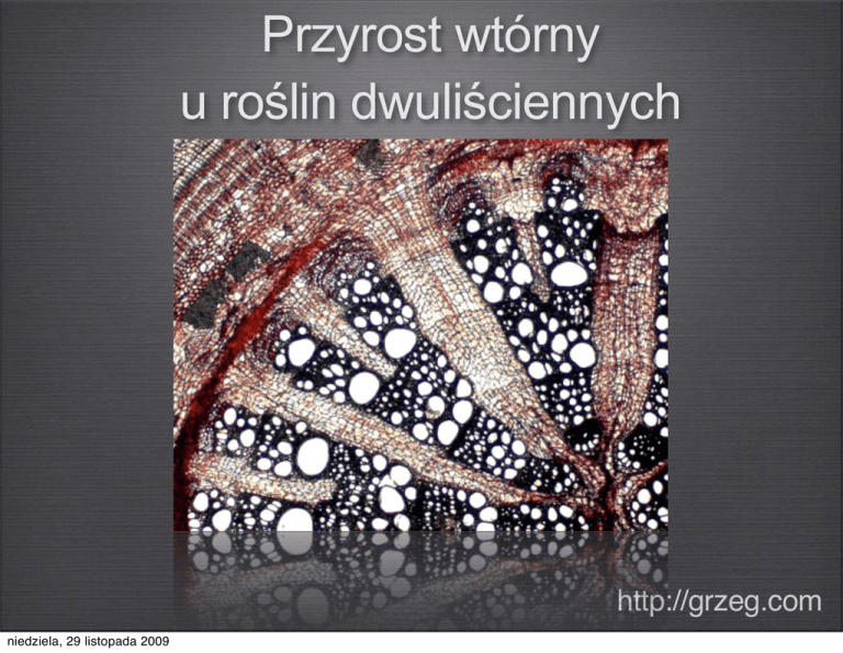 Przyrost wtórny u roślin dwuliściennych http://grzeg.com niedziela, 29 listopada 2009 Dwuliścienne – typy przyrostu wtórnego floem pierwotny Tilia floem pierwotny floem wtórny kambium kambium ksylem wtórny ksylem pierwotny floem pierwotny ksylem pierwotny Aristolochia floem pierwotny floem wtórny kambium kambium ksylem wtórny ksylem pierwotny ksylem pierwotny floem pierwotny kambium ksylem pierwotny Helianthus floem pierwotny floem wtórny kambium ksylem wtórny ksylem pierwotny niedziela, 29 listopada 2009 Aristolochia sipho – budowa pierwotna i przyrost wtórny łodygi niedziela, 29 listopada 2009 Aristolochia sipho – budowa pierwotna łodygi niedziela, 29 listopada 2009 Aristolochia sipho – budowa pierwotna łodygi epiderma kolenchyma mi kisz kory pierwotnej endoderma sklerenchyma perycyklu mi kisz perycyklu niedziela, 29 listopada 2009 Aristolochia sipho – budowa pierwotna łodygi kolenchyma kambium mi kisz metaksylemu naczynie metaksylemu protoksylem mi kisz rdzenia niedziela, 29 listopada 2009 Aristolochia sipho – budowa pierwotna łodygi Kambium mi dzywi zkowe niedziela, 29 listopada 2009 Aristolochia sipho – przyrost wtórny łodygi niedziela, 29 listopada 2009 Aristolochia sipho – przyrost wtórny łodygi fellem peryderma fellogen felloderma fragment rozerwanego pier cienia kolenchymy fragment rozerwanego pier cienia sklerenchymy niedziela, 29 listopada 2009 Aristolochia sipho – przyrost wtórny łodygi floem kambium ksylem niedziela, 29 listopada 2009 Aristolochia sipho – przyrost wtórny łodygi floem kambium ksylem (ostatniego roku) granica przyrostu rocznego promie rdzeniowy wtórny ksylem (2 lata starszy) promie rdzeniowy pierwotny ksylem pierwotny mi kisz rdzenia niedziela, 29 listopada 2009 Tilia – budowa pierwotna i przyrost wtórny łodygi niedziela, 29 listopada 2009 Tilia cordata – przekrój poprzeczny przez łodygę o budowie pierwotnej niedziela, 29 listopada 2009 Tilia – przekrój poprzeczny przez łodygę o budowie pierwotnej 1 3 2 4 1 epiderma 2 komórki luzowe 3 kolenchyma 4 mi kisz kory pierwotnej 5 floem 6 ksylem 7 kanał luzowy 8 kambium 5 6 niedziela, 29 listopada 2009 7 8 Tilia – przekrój poprzeczny przez łodygę z przyrostem wtórnym niedziela, 29 listopada 2009 niedziela, 29 listopada 2009 Tilia – przekrój poprzeczny przez łodygę z przyrostem wtórnym niedziela, 29 listopada 2009 niedziela, 29 listopada 2009 Tilia – przekrój poprzeczny przez łodygę z przyrostem wtórnym niedziela, 29 listopada 2009 Robinia pseudoacacia niedziela, 29 listopada 2009 Do przygotowania na w. 9 Tematyka: Pierwotna budowa łodygi u ro lin jednoli ciennych. Przyrost wtórny u jednoli ciennych Pierwotna budowa łodygi u ro lin jednoli ciennych Botanika ‒ Morfologia (A. Szwejkowska...) str: 183 (powtórzy ) Praktikum z anatomii ro lin (W. Braune.....) str: 112 ‒ 113 Przyrost wtórny u jednoli ciennych Botanika ‒ Morfologia (A. Szwejkowska...) str: 191 Anatomia i histogeneza... (Z. Hejnowicz) str: 671 ‒ 672 Praktikum z anatomii ro lin (W. Braune.....) str: 168 niedziela, 29 listopada 2009