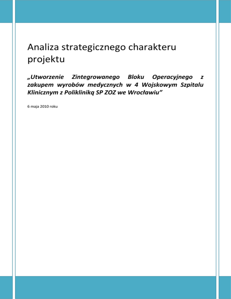 Analiza strategicznego charakteru projektu „Utworzenie Zintegrowanego Bloku Operacyjnego z zakupem wyrobów medycznych w 4 Wojskowym Szpitalu Klinicznym z Polikliniką SP ZOZ we Wrocławiu” 6 maja 2010 roku Spis treści WPROWADZENIE 4 ROZDZIAŁ 1. STRATEGICZNY CHARAKTER PROJEKTU 8 1.1 Udzielanie świadczeń zdrowotnych w określonych dziedzinach medycyny 9 1.2 Działalność dydaktyczna w zakresie kształcenia specjalizacyjnego lekarzy 19 1.3 Działalność badawczo-naukowa zakładu opieki zdrowotnej 20 1.4 Zakres (ponadregionalność) udzielanych świadczeń zdrowotnych 23 1.5 Współczynnik wykorzystania łóżek 23 1.6 Sytuacja finansowa zakładu opieki zdrowotnej i wskaźnik rentowności 24 1.7 Adekwatność inwestycji do założonego celu projektu 24 1.8 Racjonalność i kompletność harmonogramu działań 24 1.9 Doświadczenie Beneficjenta w zarządzaniu projektami finansowanymi przy udziale środków zagranicznych 25 1.10 Kompleksowość projektu 26 1.11 Efektywność techniczna, technologiczna i energetyczna projektu 26 1.12 Stan techniczny wymienianej aparatury medycznej 27 1.13 Zasoby kadrowe zakładu opieki zdrowotnej 28 1.14 Znaczenie projektu w kontekście potrzeb pacjentów, w szczególności osób niepełnosprawnych 29 ROZDZIAŁ 2. KWALIFIKOWALNOŚĆ PROJEKTU ORAZ BENEFICJENTA 32 2.1 Kwalifikowalność projektu 32 2.2 Kwalifikowalność Beneficjenta 33 ROZDZIAŁ 3. ZGODNOŚĆ PROJEKTU Z DOKUMENTAMI STRATEGICZNYMI 39 3.1 Zgodność projektu z celami Strategii Rozwoju Kraju (SRK), Narodowych Strategicznych Ram Odniesienia na lata 2007-2013 (NSRO), PO IiŚ oraz strategiami wojewódzkimi i strategiami sektorowymi 39 2|S t r o n a 3.2 Skala oddziaływania projektu (ponadregionalna i krajowa) 42 3.3 Stopień wpływu projektu na osiągnięcie wskaźników SRK, NSRO oraz PO IiŚ 43 ROZDZIAŁ 4. CEL PROJEKTU 45 ROZDZIAŁ 5. ZAKRES RZECZOWY PROJEKTU 47 5.1. Zadania kwalifikowane w ramach projektu 47 5.2. Finansowy stan zaawansowania projektu 52 5.3. Harmonogram realizacji projektu 53 6. ANALIZA SYTUACJI W ZAKRESIE LECZNICTWA SCHORZEŃ I ŚWIADCZEŃ MEDYCZNYCH UDZIELANYCH PRZEZ 4 WOJSKOWY SZPITALA KLINICZNY Z POLIKLINIKĄ SPZOZ WE WROCŁAWIU W KONTEKŚCIE REALIZACJI PROJEKTU PN. „UTWORZENIE ZINTEGROWANEGO BLOKU OPERACYJNEGO Z ZAKUPEM WYROBÓW MEDYCZNYCH W 4 WOJSKOWYM SZPITALU KLINICZNYM Z POLIKLINIKĄ SP ZOZ WE WROCŁAWIU” 54 6.1 Zapotrzebowanie na świadczenia zdrowotne udzielane przez 4 Wojskowy Szpital Kliniczny z Polikliniką SPZOZ we Wrocławiu 54 6.2 Charakterystyka trendów w zakresie organizacji stacjonarnej opieki medycznej 59 6.3 Priorytety w zakresie diagnostyki i terapii 4 Wojskowego Szpitala Klinicznego z Polikliniką SPZOZ we Wrocławiu 60 3|S t r o n a Wprowadzenie Przedmiotowy projekt polega na utworzeniu Zintegrowanego Bloku Operacyjnego wraz z zakupem wyrobów medycznych w ramach 4 Wojskowego Szpitala Klinicznego z Polikliniką SP ZOZ we Wrocławiu. Planowana w wyniku projektu działalność Szpitala z wykorzystaniem nowoczesnego Zintegrowanego Bloku Operacyjnego oraz z występującymi w nim innowacyjnymi rozwiązaniami technicznymi zapewni zgromadzenie w obrębie jednej lokalizacji specjalistycznej kadry, sprzętu i aparatury medycznej. W ten sposób projekt gwarantować będzie wysoką jakość usług świadczonych przez ZBO, spełniający wymogi stawiane nowoczesnym obiektom medycznym z komfortem pacjentów i pracy personelu, zlokalizowanym w kluczowym punkcie południowej części stolicy Dolnego Śląska. Projekt będzie przyczyniał sie do wzrostu jakości świadczonych usług szpitalnych, bezpieczeństwa oraz konkurencyjności regionu i kraju. Analiza uwarunkowań realizacyjnych projektu pozwoliła na zidentyfikowanie szeregu problemów, które zostaną rozwiązane w wyniku planowanej inwestycji: Konieczność spełnienia wymogów Rozporządzenia Ministra Zdrowia w sprawie wymagań, jakim powinny odpowiadać pod względem fachowym i sanitarnym pomieszczenia i urządzenia zakładu opieki zdrowotnej z dnia 10 listopada 2006 r. (Dz. U. z dnia 24 listopada 2006r. Nr 213, poz. 1568) zgodnie z zatwierdzonym Programem Dostosowawczym Szpitala zapewniając: a) bezpieczeństwo operowanego pacjenta poprzez stworzenie właściwych, higienicznych warunków podczas przygotowania do operacji, w czasie jej trwania oraz w trakcie uzyskania przez niego sprawności pooperacyjnej, b) bezpieczeństwo, właściwe warunki higieniczne i komfort pracy zespołom operacyjnym, c) właściwą technologię sterylizacji, dezynfekcji i dekontaminacji narzędzi, materiałów i sprzętu szpitalnego, d) bezpieczeństwo i właściwe warunki pacjentom wymagającym intensywistycznej terapii lub intensywnego nadzoru 4 WSK z Polikliniką SP ZOZ we Wrocławiu mieści się w kompleksie budynków szpitalnych zrealizowanych i oddanych do użytkowania w 1942 r. Obecny stan techniczny i funkcjonalnoprzestrzenny budynków nie spełnia obowiązujących wymogów prawnych w tym zakresie. Zdekapitalizowana tkanka urbanistyczna obiektów szpitalnych oraz brak dostosowania jej do 4|S t r o n a powszechnie obowiązujących, aktualnych standardów powoduje obniżenie poziomu sanitarnego tych elementów szpitala, które winny być najbardziej sterylne. Taki stan stanowi zagrożenie epidemiologiczne, a w konsekwencji zagrożenie życia pacjentów i pracowników. Brak spełnienia podstawowych wymogów technologicznych i funkcjonalnych, brak skutecznej wentylacji i klimatyzacji obniża z jednej strony pracę i percepcję zespołu operacyjnego oraz wydajność aparatury, zaś z drugiej strony generuje wysokie koszty funkcjonowania tych obiektów. Konstrukcja i architektura budynków szpitala uniemożliwia także wydzielenie ciągu czystego i brudnego w obrębie aktualnie istniejących bloków operacyjnych, powoduje brak możliwości spełnienia warunków wysokości obowiązujących pomieszczeń powyżej 3,3 m, brak możliwości wydzielenia nowych dźwigów szpitalnych z rozdziałem na czyste i brudne, brak mo