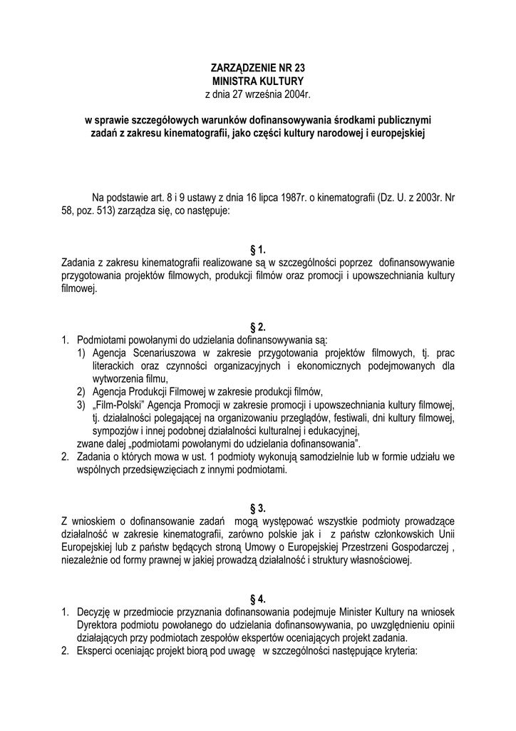 ZARZĄDZENIE NR 23 MINISTRA KULTURY z dnia 27 września 2004r. w sprawie szczegółowych warunków dofinansowywania środkami publicznymi zadań z zakresu kinematografii, jako części kultury narodowej i europejskiej Na podstawie art. 8 i 9 ustawy z dnia 16 lipca 1987r. o kinematografii (Dz. U. z 2003r. Nr 58, poz. 513) zarządza się, co następuje: § 1. Zadania z zakresu kinematografii realizowane są w szczególności poprzez dofinansowywanie przygotowania projektów filmowych, produkcji filmów oraz promocji i upowszechniania kultury filmowej. § 2. 1. Podmiotami powołanymi do udzielania dofinansowywania są: 1) Agencja Scenariuszowa w zakresie przygotowania projektów filmowych, tj. prac literackich oraz czynności organizacyjnych i ekonomicznych podejmowanych dla wytworzenia filmu, 2) Agencja Produkcji Filmowej w zakresie produkcji filmów, 3) „Film-Polski” Agencja Promocji w zakresie promocji i upowszechniania kultury filmowej, tj. działalności polegającej na organizowaniu przeglądów, festiwali, dni kultury filmowej, sympozjów i innej podobnej działalności kulturalnej i edukacyjnej, zwane dalej „podmiotami powołanymi do udzielania dofinansowania”. 2. Zadania o których mowa w ust. 1 podmioty wykonują samodzielnie lub w formie udziału we wspólnych przedsięwzięciach z innymi podmiotami. § 3. Z wnioskiem o dofinansowanie zadań mogą występować wszystkie podmioty prowadzące działalność w zakresie kinematografii, zarówno polskie jak i z państw członkowskich Unii Europejskiej lub z państw będących stroną Umowy o Europejskiej Przestrzeni Gospodarczej , niezależnie od formy prawnej w jakiej prowadzą działalność i struktury własnościowej. § 4. 1. Decyzję w przedmiocie przyznania dofinansowania podejmuje Minister Kultury na wniosek Dyrektora podmiotu powołanego do udzielania dofinansowywania, po uwzględnieniu opinii działających przy podmiotach zespołów ekspertów oceniających projekt zadania. 2. Eksperci oceniając projekt biorą pod uwagę w szczególności następujące kryteria: walory artystyczne, treściowe i poznawcze, walory humanistyczne, znaczenie dla kultury narodowej i umocnienia tradycji oraz języka narodowego, wzbogacenie europejskiej różnorodności kulturalnej, przewidywane efekty dystrybucji lub promocji bądź upowszechniania, warunki ekonomiczno – finansowe realizacji zadania, rzetelność i terminowość wykonywania i rozliczania przez ubiegającego się o dofinansowanie zadania, na które otrzymał w okresie poprzednim środki od podmiotu powołanego do udzielania dofinansowania. 3. Ekspertami są przedstawiciele środowisk związanych z kinematografią, między innymi twórcy, producenci, dystrybutorzy, prowadzący kina. - § 5. 1. Dofinansowanie odbywa się zgodnie z przepisami ustawy z dnia 26 listopada 1998 roku o finansach publicznych (Dz. U. z 2003 r. Nr 15, poz. 148 z późn. zm.), na podstawie umowy, zawierającej w szczególności określenie zadania, termin jego realizacji, kwotę i zakres dofinansowania oraz sankcje z tytułu nieprawidłowego wykorzystania dofinansowania. 2. Podmioty udzielające dofinansowania zobowiązane są do kontroli rozliczenia przychodów i kosztów dofinansowywanego zadania. 3. Kontroli podlega w szczególności przebieg i sposób realizacji zadania oraz prawidłowość wykorzystania otrzymanego dofinansowania. § 6. Minister Kultury sprawuje nadzór i kontrolę nad gospodarką finansową podmiotów, o których mowa w § 2, W tym celu, nie rzadziej niż raz na kwartał, dokonuje oceny prawidłowości wykorzystania środków finansowych, w tym zrealizowanych zadań. § 7. Maksymalne kwoty dofinansowania w zakresie przygotowania projektów filmowych, tj. prac literackich oraz czynności organizacyjnych i ekonomicznych podejmowanych dla wytworzenia filmu wynoszą do 80% całości kosztów etapu przedprodukcyjnego, z zastrzeżeniem § 9. § 8. 1. Maksymalne kwoty dofinansowania w zakresie produkcji filmów, z zastrzeżeniem § 9, wynoszą: 1) dla filmu fabularnego przeznaczonego do rozpowszechniania w kinach – do 1.000.000zł. 2) dla filmu dokumentalnego i oświatowego – do 100.000zł. 3) w przypadku szczególnie wartościowego długometrażowego filmu dokumentalnego maksymalna kwota dofinansowania może wynosić do 500.000zł. 4) dla filmów animowanych: a) do 150.000zł. dla filmu krótkometrażowego, b) do 350.000zł. dla filmu średniometrażowego, c) do 1.000.000zł. dla filmu pełnometrażowego przeznaczonego do rozpowszechniania w kinach. 2. Kwoty o których mowa w ust. 1, mogą być podwyższone: 1) o 25% na produkcję kolejnego filmu fabularnego, przeznaczonego do rozpowszechniania w kinach w stosunku do kwoty wymienionej w ust. 1 pkt. 1 dla producenta, którego film zdobył nagrodę główną „Złote Lwy” na Festiwalu Polskich Filmów Fabularnych w Gdyni lub który podejmie się realizacji następnego filmu reżysera – laureata nagrody głównej Międzynarodowego Festiwalu Debiutów Filmowych Koszalińskie Spotkania Filmowe „Młodzi i Film”. Podwyższenie takie ma zastosowanie wówczas, gdy w/w laureat posiada obywatelstwo polskie lub innego Państwa Członkowskiego Unii Europejskiej, 2) o 10% na produkcję kolejnego filmu fabularnego, przeznaczonego do rozpowszechniania w kinach w stosunku do kwoty wymienionej w ust. 1 pkt. 1 dla producenta, który podejmie się realizacji następnego filmu reżysera, którego film został nagrodzony jako najlepszy debiut na Festiwalu Polskich Filmów Fabularnych w Gdyni, 3) do 25% kwot, o których mowa w ust. 1 pkt 1 i 4, jeżeli dofinansowywany jest film, którego adresatem jest widownia dziecięca i młodzieżowa, 4) do 25%, jeśli dofinansowywany jest film o szczególnym znaczeniu dla kultury polskiej, 5) zwiększenia, o których mowa w pkt. 1 – 4 mogą być przyznane tylko z jednego tytułu. 3. Producent ma prawo do wydatkowania 20% budżetu filmu w innych Państwach Członkowskich. § 9. 1. Maksymalne kwoty dofin