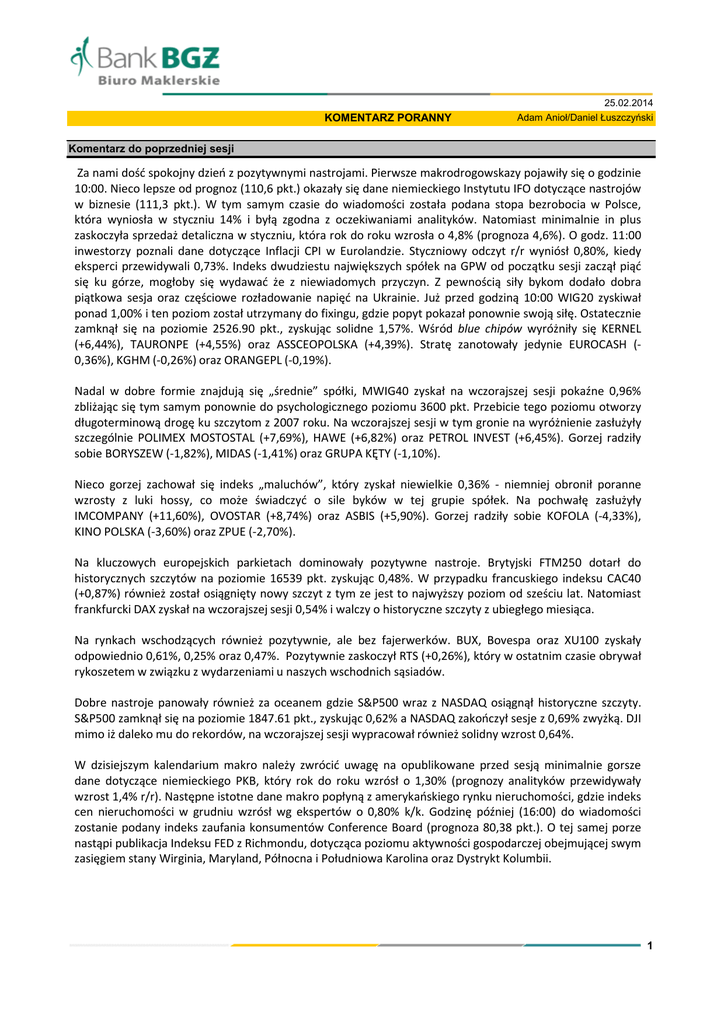 25.02.2014 KOMENTARZ PORANNY Adam Anioł/Daniel Łuszczyński Komentarz do poprzedniej sesji Za nami dość spokojny dzień z pozytywnymi nastrojami. Pierwsze makrodrogowskazy pojawiły się o godzinie 10:00. Nieco lepsze od prognoz (110,6 pkt.) okazały się dane niemieckiego Instytutu IFO dotyczące nastrojów w biznesie (111,3 pkt.). W tym samym czasie do wiadomości została podana stopa bezrobocia w Polsce, która wyniosła w styczniu 14% i byłą zgodna z oczekiwaniami analityków. Natomiast minimalnie in plus zaskoczyła sprzedaż detaliczna w styczniu, która rok do roku wzrosła o 4,8% (prognoza 4,6%). O godz. 11:00 inwestorzy poznali dane dotyczące Inflacji CPI w Eurolandzie. Styczniowy odczyt r/r wyniósł 0,80%, kiedy eksperci przewidywali 0,73%. Indeks dwudziestu największych spółek na GPW od początku sesji zaczął piąć się ku górze, mogłoby się wydawać że z niewiadomych przyczyn. Z pewnością siły bykom dodało dobra piątkowa sesja oraz częściowe rozładowanie napięć na Ukrainie. Już przed godziną 10:00 WIG20 zyskiwał ponad 1,00% i ten poziom został utrzymany do fixingu, gdzie popyt pokazał ponownie swoją siłę. Ostatecznie zamknął się na poziomie 2526.90 pkt., zyskując solidne 1,57%. Wśród blue chipów wyróżniły się KERNEL (+6,44%), TAURONPE (+4,55%) oraz ASSCEOPOLSKA (+4,39%). Stratę zanotowały jedynie EUROCASH (0,36%), KGHM (-0,26%) oraz ORANGEPL (-0,19%). Nadal w dobre formie znajdują się „średnie” spółki, MWIG40 zyskał na wczorajszej sesji pokaźne 0,96% zbliżając się tym samym ponownie do psychologicznego poziomu 3600 pkt. Przebicie tego poziomu otworzy długoterminową drogę ku szczytom z 2007 roku. Na wczorajszej sesji w tym gronie na wyróżnienie zasłużyły szczególnie POLIMEX MOSTOSTAL (+7,69%), HAWE (+6,82%) oraz PETROL INVEST (+6,45%). Gorzej radziły sobie BORYSZEW (-1,82%), MIDAS (-1,41%) oraz GRUPA KĘTY (-1,10%). Nieco gorzej zachował się indeks „maluchów”, który zyskał niewielkie 0,36% - niemniej obronił poranne wzrosty z luki hossy, co może świadczyć o sile byków w tej grupie spółek. Na pochwałę zasłużyły IMCOMPANY (+11,60%), OVOSTAR (+8,74%) oraz ASBIS (+5,90%). Gorzej radziły sobie KOFOLA (-4,33%), KINO POLSKA (-3,60%) oraz ZPUE (-2,70%). Na kluczowych europejskich parkietach dominowały pozytywne nastroje. Brytyjski FTM250 dotarł do historycznych szczytów na poziomie 16539 pkt. zyskując 0,48%. W przypadku francuskiego indeksu CAC40 (+0,87%) również został osiągnięty nowy szczyt z tym ze jest to najwyższy poziom od sześciu lat. Natomiast frankfurcki DAX zyskał na wczorajszej sesji 0,54% i walczy o historyczne szczyty z ubiegłego miesiąca. Na rynkach wschodzących również pozytywnie, ale bez fajerwerków. BUX, Bovespa oraz XU100 zyskały odpowiednio 0,61%, 0,25% oraz 0,47%. Pozytywnie zaskoczył RTS (+0,26%), który w ostatnim czasie obrywał rykoszetem w związku z wydarzeniami u naszych wschodnich sąsiadów. Dobre nastroje panowały również za oceanem gdzie S&P500 wraz z NASDAQ osiągnął historyczne szczyty. S&P500 zamknął się na poziomie 1847.61 pkt., zyskując 0,62% a NASDAQ zakończył sesje z 0,69% zwyżką. DJI mimo iż daleko mu do rekordów, na wczorajszej sesji wypracował również solidny wzrost 0,64%. W dzisiejszym kalendarium makro należy zwrócić uwagę na opublikowane przed sesją minimalnie gorsze dane dotyczące niemieckiego PKB, który rok do roku wzrósł o 1,30% (prognozy analityków przewidywały wzrost 1,4% r/r). Następne istotne dane makro popłyną z amerykańskiego rynku nieruchomości, gdzie indeks cen nieruchomości w grudniu wzrósł wg ekspertów o 0,80% k/k. Godzinę później (16:00) do wiadomości zostanie podany indeks zaufania konsumentów Conference Board (prognoza 80,38 pkt.). O tej samej porze nastąpi publikacja Indeksu FED z Richmondu, dotycząca poziomu aktywności gospodarczej obejmującej swym zasięgiem stany Wirginia, Maryland, Północna i Południowa Karolina oraz Dystrykt Kolumbii. 1 Komentarz poranny 25.02.2014 r. NOTOWANIA z dnia 24.02.2014 r. Indeksy – Polska/Europa Środk. WIG źródło: Bloomberg, stooq.pl, bankier.pl Indeksy – Świat Indeksy – Europa 54063.60 +1.24% EURO STOXX 50 3,157.31 +0.82% DJIA WIG20 2526.90 +1.57% DAX 9708.94 +0.54% S&P500 16207.14 +0.64% 1847.61 +0.62% mWIG40 3590.85 +0.90% FTSE 100 6,865.86 +0.41% NASDAQ 4292.97 +0.69% sWIG80 14659.68 +0.36% CAC40 4419.13 +0.87% Shanghai B-share BUX 18221.94 +0.61% RTS 1318.98 +0.26% Nikkei 225 14837.68 -0.19% PSE 1039.29 -0.65% BIST National 100 Bovespa 47393.50 +0.03% Surowce / Metale 64185.96 +0.47% Waluty (kursy z godziny 8.48) Rentowność obligacji 236.08 -2.06% YTM Ropa Crude $/bbl. 102.84 +0.45% EUR/PLN 4.15905 +0.12% PS0414 100.50 2,36% Miedź $/lb. 323.10 -1.70% USD/PLN 3.02546 +0.02% PS0415 102.85 2,82% Złoto $/t oz. 1336.70 +0.94% CHF/PLN 3.40943 +0.18% PS0416 103.90 3.27% Srebro $/t oz. 2200.000 +0.70% GBP/PLN 5.04529 +0.15% PS0417 103.72 3,53% Platyna $/ozt 1438.35 +0.67% EUR/USD 1.37468 +0.10% DS1023 96.80 4.50% KALENDARIUM źródło: stooq.pl Wtorek, 25 lutego 2014 EKOEXPORT Wprowadzenie do obrotu 215.000 akcji zwykłych na okaziciela serii A spółki. SYGNITY Wprowadzenie do obrotu 77.424 akcji zwykłych na okaziciela serii O spółki. Godz. Kraj Dane Prognoza 8:00 8:00 Niemcy Niemcy PKB K/K PKB R/R 0.40% 1.40% 8:45 Francja Indeks zaufania w biznesie 96.75 10:00 10:00 Włochy Włochy Sprzedaż detaliczna M/M Sprzedaż detaliczna R/R 11:00 Włochy Indeks zaufania konsumentów 12:00 Wielka Brytania CBI Sprzedaż detaliczna 15:00 USA Indeks cen nieruchomości M/M 0.20% 15:00 USA Indeks cen nieruchomości K/K 0.80% 15:00 USA Indeks S&P/Case-Shiller Composite 20 R/R 13.50% 16:00 USA Indeks Conference Board 80.38 16:00 USA Indeks Fed z Richmond 98.50 Środa, 25 lutego 2014 KBDOM Pierwszy dzień zawieszenia obrotu akcjami spółki, w związku ze zmianą ich wartości nominalnej. 2 25.02.2014 ANALIZY I REKOMENDACJE ZDI Cena