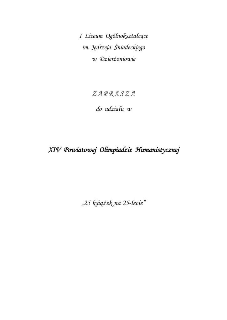 I Liceum Ogólnokształcące im. Jędrzeja Śniadeckiego w Dzierżoniowie ZAPRASZA do udziału w XIV Powiatowej Olimpiadzie Humanistycznej „25 książek na 25-lecie” Zapraszamy Państwa do udziału w XIV Powiatowej Olimpiadzie Humanistycznej tj. do spotkania z literaturą polską oraz historią Polski po 1945 r. (w tym ustrojem politycznym RP po 1989 r. i problematyką ziemi dzierżoniowskiej po 1945 roku). W obecnym roku obowiązywać będzie zmieniona formuła konkursu. Szczegółowe informacje zawarte są w Regulaminie Powiatowej Olimpiady Humanistycznej, dołączonym do dokumentacji. Poszczególne etapy Olimpiady odbędą się w następujących terminach: 13 marca 2015 r. o godz. 9.00 – test wiedzy humanistycznej sprawdzający: a) umiejętności analizy i interpretacji utworu lirycznego z wykorzystaniem kontekstów oraz elementów teorii literatury; b) wiedzę z historii Polski po 1945 roku z zagadnieniami o ustroju politycznym III RP oraz dziejów ziemi dzierżoniowskiej po II wojnie światowej. 21 marca 2015 r. o godz. 9.00 – z języka polskiego odpowiedź na wylosowane do wybranej przez siebie lektury pytanie; z historii odpowiedź na wylosowane pytanie dotyczące historii Polski po 1945 roku z zagadnieniami o ustroju politycznym III RP. Finał Olimpiady odbędzie się 27 marca 2015 r. o godz. 14.00 w I Liceum Ogólnokształcącym w Dzierżoniowie. W tym roku proponujemy jedną z ośmiu pozycji lekturowych, które znalazły się w plebiscycie „25 książek na 25-lecie”: Lista lektur do wyboru: 1. Wiesław Myśliwski, Traktat o łuskaniu fasoli 2. Olga Tokarczuk, Prawiek i inne czasy 3. Antoni Libera, Madame 4. Ryszard Kapuściński, Imperium 5. Mariusz Szczygieł, Gottland 6. Tomek Tryzna, Panna Nikt 7. Włodzimierz Odojewski, Oksana 8. Józef Hen, Mój przyjaciel król Literatura historyczna pomocna w przygotowaniu się do Olimpiady : 1. A. Albert, Najnowsza historia Polski 1914 – 1993, t. I i II, Londyn 1994 (lub wydanie krajowe). 2. B. Bankowicz, Leksykon historii XX wieku, Kraków 1999. 3. J. Carpentier, Historia Europy, Warszawa 1994. 4. Ustrój konstytucyjny Rzeczypospolitej Polskiej, red. R. Mojak, Lublin 2000. 5. J. Eisler, Zarys dziejów politycznych Polski 1944 – 1989, Warszawa 1992. 6. A.Garlicki, Historia 1939 – 2001. Polska i świat, Warszawa 2002. 7. Historia Europy, red. Antoni Mączak, Wrocław 1998. 8. K. Kersten, Historia polityczna Polski 1944 – 1956, Warszawa 1990. 9. Najnowsza historia świata 1945 – 1995, red. Artur Patek, t. I – III, Kraków 1997. 10. A. Paczkowski, Pół wieku dziejów Polski 1939 – 1989, Warszawa 1996. 11. A. Dudek, Historia polityczna Polski 1989-2005, Kraków 2007. 12. L. Garlicki, Polskie prawo konstytucyjne. Zarys wykładu, Warszawa 2005. 13. M. Migalski, Polski system partyjny, Warszawa 2007. 14. K. Wojtaszczyk, Społeczeństwo i polityka, Warszawa 2007. Organizatorzy proszą o życzliwość, zrozumienie i przystąpienie do Olimpiady oraz o przysłanie informacji o uczniach (imię, nazwisko, klasa, nazwiska nauczycieli prowadzących), którzy wezmą w niej udział do dnia 6 marca 2015 r. Wszelkich informacji udzielają Maria Sulewska i Tomasz Roszak. Kontakt telefoniczny : codziennie w godzinach 8.00 – 15.00, tel. 74 831 44 77 .