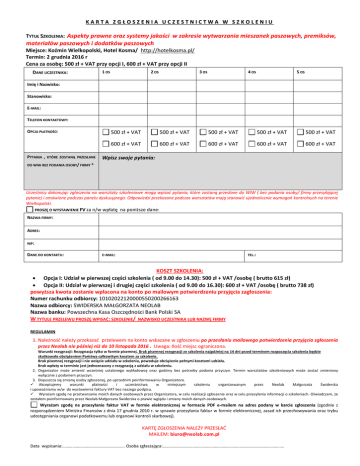 KARTA ZGŁOSZENIA UCZESTNICTWA W SZKOLENIU TYTUŁ SZKOLENIA: Aspekty prawne oraz systemy jakości w zakresie wytwarzania mieszanek paszowych, premiksów, materiałów paszowych i dodatków paszowych Miejsce: Koźmin Wielkopolski, Hotel Kosma/ http://hotelkosma.pl/ Termin: 2 grudnia 2016 r Cena za osobę: 500 zł + VAT przy opcji I, 600 zł + VAT przy opcji II DANE UCZESTNIKA: 1 OS 2 OS 3 OS 4 OS 5 OS Imię i Nazwisko: Stanowisko: E-MAIL: TELEFON KONTAKTOWY: OPCJA PŁATNOŚCI PYTANIA , KTÓRE ZOSTANĄ PRZESŁANE 500 zł + VAT 500 zł + VAT 500 zł + VAT 500 zł + VAT 500 zł + VAT 600 zł + VAT 600 zł + VAT 600 zł + VAT 600 zł + VAT 600 zł + VAT Wpisz swoje pytania: DO WIW BEZ PODANIA OSOBY/ FIRMY * Uczestnicy dokonując zgłoszenia na warsztaty szkoleniowe mogą wpisad pytania, które zostaną przesłane do WIW ( bez podania osoby/ firmy przesyłającej pytanie) i omówione podczas panelu dyskusyjnego. Odpowiedzi przekazane podczas warsztatów mają stanowid ujednolicenie wymagao kontrolnych na terenie Wielkopolski. PROSZĘ O WYSTAWIENIE FV za n/w wpłatę na poniższe dane: NAZWA FIRMY: ADRES: NIP: DANE DO KONTAKTU: E-MAIL: TEL.: KOSZT SZKOLENIA: Opcja I: Udział w pierwszej części szkolenia ( od 9.00 do 14.30): 500 zł + VAT /osobę ( brutto 615 zł) Opcja II: Udział w pierwszej i drugiej części szkolenia ( od 9.00 do 16.30): 600 zł + VAT /osobę ( brutto 738 zł) powyższa kwota zostanie wpłacona na konto po mailowym potwierdzeniu przyjęcia zagłoszenia: Numer rachunku odbiorcy: 10102022120000550200266163 Nazwa odbiorcy: SWIDERSKA MAŁGORZATA NEOLAB Nazwa banku: Powszechna Kasa Oszczędności Bank Polski SA W TYTULE PRZELEWU PROSZĘ WPISAD: SZKOLENIE/ NAZWISKO UCZESTNIKA LUB NAZWĘ FIRMY REGULAMIN 1. Należnośd należy przekazad przelewem na konto wskazane w zgłoszeniu po przesłaniu mailowego potwierdzenia przyjęcia zgłoszenia przez Neolab nie później niż do 10 listopada 2016 . Uwaga: Ilośd miejsc ograniczona. Warunki rezygnacji: Rezygnacja tylko w formie pisemnej. Brak pisemnej rezygnacji ze szkolenia najpóźniej na 14 dni przed terminem rozpoczęcia szkolenia będzie skutkowało obciążeniem Paostwa całkowitym kosztem za szkolenie. Brak pisemnej rezygnacji i nie wzięcie udziału w szkoleniu, powoduje obciążenie pełnymi kosztami udziału. Brak wpłaty w terminie jest jednoznaczny z rezygnacją z udziału w szkoleniu. 2. Organizator może zmienid wcześniej ustalonego wykładowcę oraz godziny bez potrzeby podania przyczyn. Termin warsztatów szkoleniowych może zostad zmieniony wyłącznie z podaniem przyczyn. 3. Dopuszcza się zmianę osoby zgłoszonej, po uprzednim poinformowaniu Organizatora. Akceptujemy warunki płatności i uczestnictwa w niniejszym szkoleniu organizowanym przez Neolab Małgorzata Świderska i upoważniamy w/w do wystawienia faktury VAT bez naszego podpisu. Wyrażam zgodę na przetwarzanie moich danych osobowych przez Organizatora, w celu realizacji zgłoszenia oraz w celu przesyłania informacji o szkoleniach. Oświadczam, że zostałem poinformowany przez Neolab Małgorzata Świderska o prawie wglądu i zmiany moich danych osobowych. Wyrażam zgodę na przesyłanie faktur VAT w formie elektronicznej w formacie PDF e-mailem na adres podany w karcie zgłoszenia (zgodnie z rozporządzeniem Ministra Finansów z dnia 17 grudnia 2010 r. w sprawie przesyłania faktur w formie elektronicznej, zasad ich przechowywania oraz trybu udostępniania organowi podatkowemu lub organowi kontroli skarbowej). KARTĘ ZGŁOSZENIA NALEŻY PRZESŁAĆ MAILEM: [email protected] Data wypisania:……………………………………………….. Osoba zgłaszająca:……………………………………………………………………………………………….