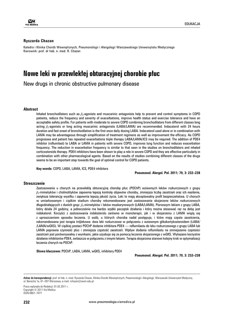 PRACA ORYGINALNA EDUKACJA Ryszarda Chazan Katedra i Klinika Chorób Wewnętrznych, Pneumonologii i Alergologii Warszawskiego Uniwersytetu Medycznego Kierownik: prof. dr hab. n. med. R. Chazan Nowe leki w przewlekłej obturacyjnej chorobie płuc New drugs in chronic obstructive pulmonary disease Abstract Inhaled bronchodilators such as b2-agonists and muscarinic antagonists help to prevent and control symptoms in COPD patients, reduce the frequency and severity of exacerbations, improve health status and exercise tolerance and have an acceptable safety profile. For patients with moderate to severe COPD combining bronchodilators from different classes long acting b2-agonists or long acting muscarinic antagonists (LABA/LAMA) are recommended. Indacaterol with 24 hours duration and fast onset of bronchodilation is the first once daily dosing LABA. Indacaterol used alone or in combination with LAMA may be advantageous through simplification of treatment regimens as well as improvement the efficacy. As COPD progresses and patient has repeated exacerbations triple therapy LABA/LAMA/ICS may be required. The addition of PDE4 inhibitor (roflumilast) to LABA or LAMA in patients with severe COPD, improves lung function and reduces exacerbation frequency. The reduction in exacerbation frequency is similar to that seen in the studies on bronchodilators and inhaled corticosteroids therapy. PDE4 inhibitors have been shown to play a role in severe COPD and they are effective particularly in combination with other pharmacological agents. Based on the results of studies combining different classes of the drugs seems to be an important step towards the goal of optimal control for COPD patients. Key words: COPD, LABA, LAMA, ICS, PDE4 inhibitors Pneumonol. Alergol. Pol. 2011; 79, 3: 232–238 Streszczenie Zastosowanie u chorych na przewlekłą obturacyjną chorobę płuc (POChP) wziewnych leków rozkurczowych z grupy b2-mimetyków i cholinolityków zapewnia lepszą kontrolę objawów choroby, zmniejsza liczbę zaostrzeń oraz ich nasilenie, zwiększa tolerancję wysiłku i zapewnia lepszą jakość życia. Leki te mają akceptowalny profil bezpieczeństwa. U chorych w umiarkowanym i ciężkim stadium choroby rekomendowane jest zastosowanie skojarzone leków rozkurczowych długodziałających z dwóch grup: b2-mimetyków i leków muskarynowych (LABA/LAMA). Pierwszym lekiem z grupy LABA, który działa 24 godziny, a jednocześnie ma bardzo szybki początek działania i który można stosować raz na dobę jest indakaterol. Korzyści z zastosowania indakaterolu zarówno w monoterapii, jak i w skojarzeniu z LAMA wiążą się z uproszczeniem sposobu leczenia. U osób, u których choroba nadal postępuje, i które mają częste zaostrzenia, rekomendowana jest terapia trójlekowa: dwa leki rozkurczowe w połączeniu z wziewnym glikokortykosteroidem (LABA/ /LAMA/wGKS). W ciężkiej postaci POChP dodanie inhibitora PDE4 — roflumilastu do leku rozkurczowego z grupy LABA lub LAMA poprawia czynność płuc i zmniejsza częstość zaostrzeń. Wpływ dodania roflumilastu na zmniejszenie częstości zaostrzeń jest porównywalny z wynikami, jakie uzyskuje się za pomocą leczenia skojarzonego z wGKS. Wykazano korzystne działanie inhibitorów PDE4, zwłaszcza w połączeniu z innymi lekami. Terapia skojarzona stanowi kolejny krok w optymalizacji leczenia chorych na POChP. Słowa kluczowe: POChP, LABA, LAMA, wGKS, inhibitory PDE4 Pneumonol. Alergol. Pol. 2011; 79, 3: 232–238 Adre Adress do korespondencji: prof. dr hab. n. med. Ryszarda Chazan, Klinika Chorób Wewnętrznych, Pneumonologii i Alergologii, Warszawski Uniwersytet Medyczny, ul. Banacha 1a, 01–097 Warszawa, e-mail: [email protected] Praca wpłynęła do Redakcji: 01.02.2011 r. Copyright © 2011 Via Medica ISSN 0867–7077 232 www.pneumonologia.viamedica.pl Ryszarda Chazan, Nowe leki w przewlekłej obturacyjnej chorobie płuc Wstęp Przewlekła obturacyjna choroba płuc (POChP) charakteryzuje się postępującym ograniczeniem przepływu powietrza w drogach oddechowych, które prowadzi do postępującego ograniczenia tolerancji wysiłku i nasilenia duszności. Wytyczne międzynarodowe i krajowe rekomendują zastosowanie w terapii POChP głównie leków rozkurczowych z grupy b-mimetyków i cholinolityków. W łagodnej postaci POChP [I stadium według Global Initiative for Chronic Obstructive Disease (GOLD)] zalecane są leki krótkodziałające, które powinny być podawane tylko w przypadku wystąpienia objawów (on demand). W umiarkowanej postaci (II stadium według GOLD), to znaczy jeśli wartość natężonej objętości wydechowej pierwszosekundowej (FEV1, forced expiratory volume in 1 second) wynosi mniej niż 80%, ale więcej niż 50% wartości należnej, zaleca się przewlekłe stosowanie długodziałających leków rozkurczowych [długodziałających b2-mimetyków (LABA, long-acting b2-agonist) lub długodziałających cholinolityków (LAMA, long-acting muscarinic antagonists)] w monoterapii lub w skojarzeniu (LABA/ /LAMA). Natomiast w stadium III i IV (ciężka i bardzo ciężka postać POChP) oraz u osób z częstymi zaostrzeniami zaleca się leczenie skojarzone: leki długodziałające w połączeniu z glikokortykosteroidami wziewnymi (wGKS) [1]. Obserwacje kliniczne sugerują, że u części chorych na POChP nie udaje się uzyskać dobrej kontroli choroby, znaczny odsetek pacjentów jest leczony niezgodnie z wytycznymi. Część chorych jest niewłaściwie kwalifikowana do odpowiednich schematów terapii przez lekarza, część nie stosuje się do zaleceń. Jednak również wśród tych osób, które są leczone zgodnie z wytycznymi, w większości nie udaje się uzyskać dobrej kontroli choroby. Analiza wyników leczenia 5583 chorych na POChP powyżej 40. roku życia dokonana na podstawie danych uzyskanych z prospektywnych badań klinicznych potwierdziła, że znaczna część z nich mimo stwierdzanej obturacji (wartość FEV1 £ 70% wn. i FEV1/FVC