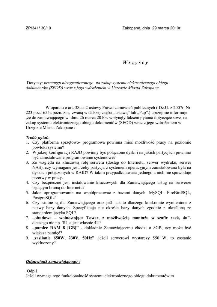 ZP/341/ 30/10 Zakopane, dnia 29 marca 2010r. Wszyscy Dotyczy: przetargu nieograniczonego na zakup systemu elektronicznego obiegu dokumentów (SEOD) wraz z jego wdroŜeniem w Urzędzie Miasta Zakopane . W oparciu o art. 38ust.2 ustawy Prawo zamówień publicznych ( Dz.U. z 2007r. Nr 223 poz.1655z późn. zm, zwaną w dalszej części „ustawą” lub „Pzp”.) uprzejmie informuje ,Ŝe do zamawiającego w dniu 26 marca 2010r. wpłynęły faksem pytania dotyczące siwz na zakup systemu elektronicznego obiegu dokumentów (SEOD) wraz z jego wdroŜeniem w Urzędzie Miasta Zakopane : Treść pytań: 1. Czy platforma sprzętowo- programowa powinna mieć moŜliwość pracy na poziomie powłoki systemu? 2. W jakiej konfiguracji RAJD powinny być połączone dyski i na jakich partycjach powinno być zainstalowane programowanie systemowe? 3. Ze względu na kluczową rolę serwera (dostęp do Internetu, serwer wydruku, serwer NAS), czy wymagane jest, Ŝeby partycja z systemem operacyjnym zainstalowana była na dyskach połączonych w RAID? W takim przypadku awaria jednego z nich nie spowoduje przerwy w pracy. 4. Czy bezpieczne jest instalowanie kluczowych dla Zamawiającego usług na serwerze będącym bramą do Internetu? 5. Jakie oprogramowanie ma współpracować z bazami danych: MySQL. FireBirdSQL, PostgreSQL? 6. Czy istotne są dla Zamawiającego oraz jeśli tak to dlaczego konkretnie wymienione z nazwy bazy danych. Specyfikacja nie określa bazy danych zgodnie z określoną ze standardem języka SQL? 7. „obudowa – wolnostojąca Tower, z moŜliwością montaŜu w szafie rack, 4u”dlaczego nie np. 3U, a jest właśnie 4U? 8. „pamiec RAM 8 [GB]” - dokładnie Zamawiającemu chodzi o 8GB, czy moŜe być większa pamięć? 9. „zasilanie 650W, 230V, 50Hz” .jeŜeli serwerowi wystarczy 550 W, to zostanie wykluczony? Odpowiedź zamawiającego : Odp.1 JeŜeli wymaga tego funkcjonalność systemu elektronicznego obiegu dokumentów to platforma sprzętowo-programowa powinna mieć moŜliwość pracy na poziomie powłoki systemu. Odp.2 Dyski powinny być połączone w konfiguracji RAID 0 (mirroring). Oprogramowanie systemowe powinno być zainstalowane na innej partycji niŜ dane z systemu elektronicznego obiegu dokumentów. Odp.3 Partycja z systemem operacyjnym ma być zainstalowana na dyskach połączonych w RAID 0. Odp.4 Serwer nie będzie pełnił roli bramy internetowej. Odp.5 Z bazą danych SQL ma współpracować system elektronicznego obiegu dokumentów. Odp.6 Nazwa bazy danych nie ma znaczenia, jeŜeli tylko będzie ona zgodna ze standardem SQL i pozwoli na sprawną pracę systemu elektronicznego obiegu dokumentów. Odp.7 Obudowa – wolnostojąca Tower, z moŜliwością montaŜu w szafie rack 19’’. Odp.8 Pamięć RAM moŜe być większa niŜ 8GB. Odp.9 JeŜeli zaoferowany serwer będzie wyposaŜony w zasilacz 550W, to zostanie wykluczony. Minimalna moc zasilacza w serwerze to 650W. Sekretarz Miasta Zakopane mgr Renata Szych