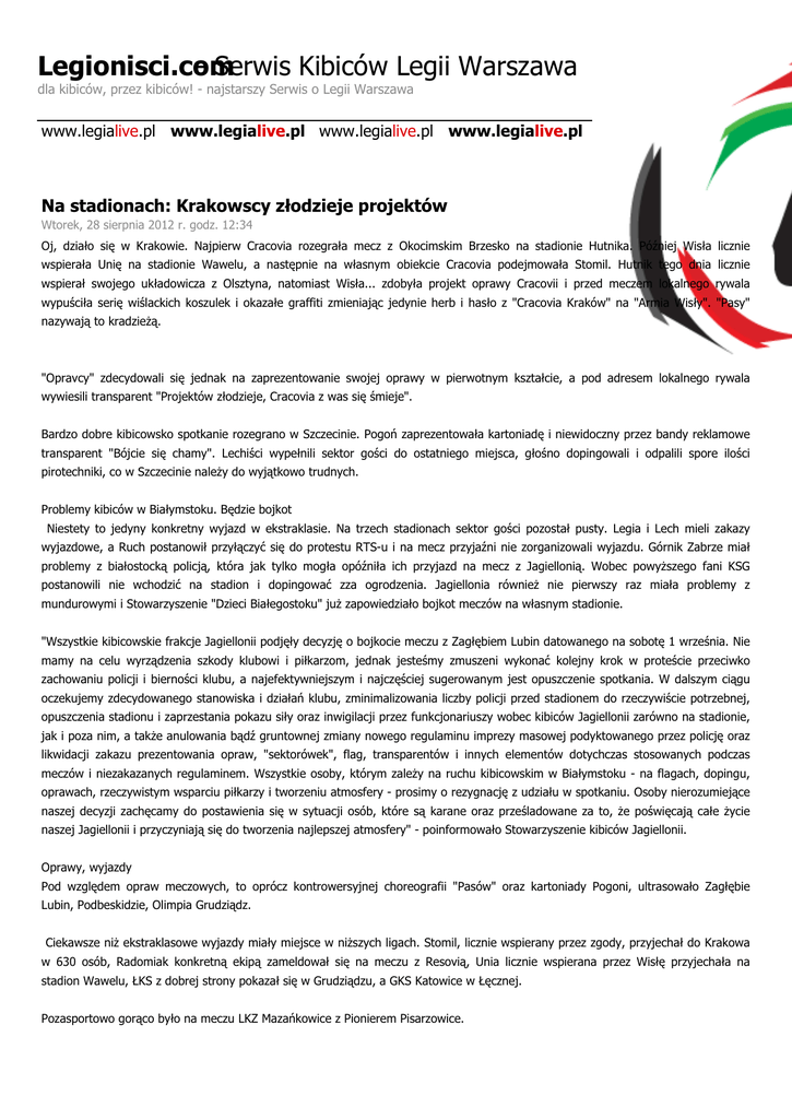 Legionisci.com - Serwis Kibiców Legii Warszawa dla kibiców, przez kibiców! - najstarszy Serwis o Legii Warszawa www.legialive.pl www.legialive.pl www.legialive.pl www.legialive.pl Na stadionach: Krakowscy złodzieje projektów Wtorek, 28 sierpnia 2012 r. godz. 12:34 Oj, działo się w Krakowie. Najpierw Cracovia rozegrała mecz z Okocimskim Brzesko na stadionie Hutnika. Później Wisła licznie wspierała Unię na stadionie Wawelu, a następnie na własnym obiekcie Cracovia podejmowała Stomil. Hutnik tego dnia licznie wspierał swojego układowicza z Olsztyna, natomiast Wisła... zdobyła projekt oprawy Cracovii i przed meczem lokalnego rywala wypuściła serię wiślackich koszulek i okazałe graffiti zmieniając jedynie herb i hasło z "Cracovia Kraków" na "Armia Wisły". "Pasy" nazywają to kradzieżą. "Opravcy" zdecydowali się jednak na zaprezentowanie swojej oprawy w pierwotnym kształcie, a pod adresem lokalnego rywala wywiesili transparent "Projektów złodzieje, Cracovia z was się śmieje". Bardzo dobre kibicowsko spotkanie rozegrano w Szczecinie. Pogoń zaprezentowała kartoniadę i niewidoczny przez bandy reklamowe transparent "Bójcie się chamy". Lechiści wypełnili sektor gości do ostatniego miejsca, głośno dopingowali i odpalili spore ilości pirotechniki, co w Szczecinie należy do wyjątkowo trudnych. Problemy kibiców w Białymstoku. Będzie bojkot Niestety to jedyny konkretny wyjazd w ekstraklasie. Na trzech stadionach sektor gości pozostał pusty. Legia i Lech mieli zakazy wyjazdowe, a Ruch postanowił przyłączyć się do protestu RTS-u i na mecz przyjaźni nie zorganizowali wyjazdu. Górnik Zabrze miał problemy z białostocką policją, która jak tylko mogła opóźniła ich przyjazd na mecz z Jagiellonią. Wobec powyższego fani KSG postanowili nie wchodzić na stadion i dopingować zza ogrodzenia. Jagiellonia również nie pierwszy raz miała problemy z mundurowymi i Stowarzyszenie "Dzieci Białegostoku" już zapowiedziało bojkot meczów na własnym stadionie. "Wszystkie kibicowskie frakcje Jagiellonii podjęły decyzję o bojkocie meczu z Zagłębiem Lubin datowanego na sobotę 1 września. Nie mamy na celu wyrządzenia szkody klubowi i piłkarzom, jednak jesteśmy zmuszeni wykonać kolejny krok w proteście przeciwko zachowaniu policji i bierności klubu, a najefektywniejszym i najczęściej sugerowanym jest opuszczenie spotkania. W dalszym ciągu oczekujemy zdecydowanego stanowiska i działań klubu, zminimalizowania liczby policji przed stadionem do rzeczywiście potrzebnej, opuszczenia stadionu i zaprzestania pokazu siły oraz inwigilacji przez funkcjonariuszy wobec kibiców Jagiellonii zarówno na stadionie, jak i poza nim, a także anulowania bądź gruntownej zmiany nowego regulaminu imprezy masowej podyktowanego przez policję oraz likwidacji zakazu prezentowania opraw, "sektorówek", flag, transparentów i innych elementów dotychczas stosowanych podczas meczów i niezakazanych regulaminem. Wszystkie osoby, którym zależy na ruchu kibicowskim w Białymstoku - na flagach, dopingu, oprawach, rzeczywistym wsparciu piłkarzy i tworzeniu atmosfery - prosimy o rezygnację z udziału w spotkaniu. Osoby nierozumiejące naszej decyzji zachęcamy do postawienia się w sytuacji osób, które są karane oraz prześladowane za to, że poświęcają całe życie naszej Jagiellonii i przyczyniają się do tworzenia najlepszej atmosfery" - poinformowało Stowarzyszenie kibiców Jagiellonii. Oprawy, wyjazdy Pod względem opraw meczowych, to oprócz kontrowersyjnej choreografii "Pasów" oraz kartoniady Pogoni, ultrasowało Zagłębie Lubin, Podbeskidzie, Olimpia Grudziądz. Ciekawsze niż ekstraklasowe wyjazdy miały miejsce w niższych ligach. Stomil, licznie wspierany przez zgody, przyjechał do Krakowa w 630 osób, Radomiak konkretną ekipą zameldował się na meczu z Resovią, Unia licznie wspierana przez Wisłę przyjechała na stadion Wawelu, ŁKS z dobrej strony pokazał się w Grudziądzu, a GKS Katowice w Łęcznej. Pozasportowo gorąco było na meczu LKZ Mazańkowice z Pionierem Pisarzowice. Kibiców innych drużyn zachęcamy do wysyłania własnych relacji, liczb wyjazdowych itp. na adres [email protected] - aby nasze raporty były jak najbardziej rzetelne. Ekstraklasa: Pogoń Szczecin 0-2 Lechia Gdańsk (1000). Około 12 tysięcy widzów przyszło na poniedziałkowy mecz Pogoni z Lechią. Portowcy zaprezentowali oprawę - kartoniadę "PS" oraz transparent "Bójcie się chamy", który był słabo widoczny z powodu wysokich band reklamowych na wysokości młyna. Pogoń z dobrym dopingiem. W Szczecinie bardzo dobrze pokazali się także przyjezdni. Lechiści wykorzystali 1000 biletów i wypełnili sektor gości do ostatniego miejsca. Oprócz dobrego oflagowania i głośnego dopingu, Lechia zaprezentowała flagi na kiju, sektorówkę w kształcie koszulki i sporo pirotechniki. Jagiellonia Białystok - Górnik Zabrze (220). Fani Górnika od lat mają problemy z wyjazdami do Białegostoku i... tym razem nie było inaczej. Zabrzanie, tak jak większość ekip udających się na mecz z Jagiellonią, za sprawą policji utknęli kilkanaście kilometrów od stadionu. Chore procedury, które zaczęli wdrażać mundurowi sprawiły, że pierwsza grupa Górnika dotarła na stadion w 50. minucie spotkania. W związku z tym goście postanowili nie wchodzić na mecz, tylko zwrócić bilety w kasie i prowadzić doping zza ogrodzenia. Jagiellonia słysząc o problemach przyjezdnych skandowała "Piłka nożna dla kibiców". Po meczu piłkarze Górnika podeszli pod płot i podziękowali fanom za wsparcie. Do Białegostoku pojechało ok. 220 kibiców KSG, w tym Wisłoka (16) i GKS Katowice. Śląsk Wrocław 2-0 Korona Kielce (200). Frekwencja na meczach Śląska spada cały czas. Na ligowym spotkaniu z Koroną było już niewiele ponad 10 tysięcy widzów. Gospodarze z bez oprawy. Korona przyjechała do Wrocławia w ok. 200 osób. Próbowali przebijać się przez d
