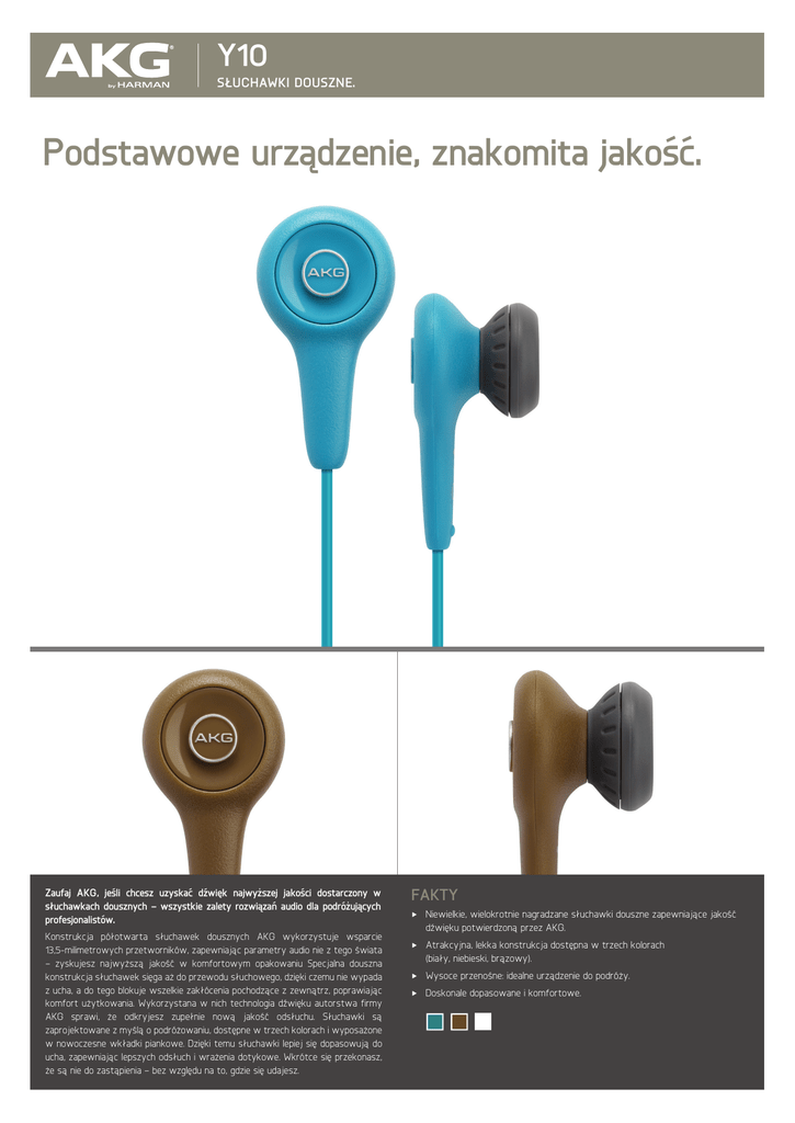 Y10 SŁUCHAWKI DOUSZNE. Podstawowe urządzenie, znakomita jakość. Zaufaj AKG, jeśli chcesz uzyskać dźwięk najwyższej jakości dostarczony w słuchawkach dousznych – wszystkie zalety rozwiązań audio dla podróżujących profesjonalistów. Konstrukcja półotwarta słuchawek dousznych AKG wykorzystuje wsparcie 13,5-milimetrowych przetworników, zapewniając parametry audio nie z tego świata – zyskujesz najwyższą jakość w komfortowym opakowaniu Specjalna douszna konstrukcja słuchawek sięga aż do przewodu słuchowego, dzięki czemu nie wypada z ucha, a do tego blokuje wszelkie zakłócenia pochodzące z zewnątrz, poprawiając komfort użytkowania. Wykorzystana w nich technologia dźwięku autorstwa firmy AKG sprawi, że odkryjesz zupełnie nową jakość odsłuchu. Słuchawki są zaprojektowane z myślą o podróżowaniu, dostępne w trzech kolorach i wyposażone w nowoczesne wkładki piankowe. Dzięki temu słuchawki lepiej się dopasowują do ucha, zapewniając lepszych odsłuch i wrażenia dotykowe. Wkrótce się przekonasz, że są nie do zastąpienia – bez względu na to, gdzie się udajesz. FAKTY Niewielkie, wielokrotnie nagradzane słuchawki douszne zapewniające jakość dźwięku potwierdzoną przez AKG. Atrakcyjna, lekka konstrukcja dostępna w trzech kolorach (biały, niebieski, brązowy). Wysoce przenośne: idealne urządzenie do podróży. Doskonale dopasowane i komfortowe. Y10 SŁUCHAWKI DOUSZNE. PRZEGLĄD CECH MODEL AKG Y10 – SPECYFIKACJA Niewielkie, wielokrotnie nagradzane słuchawki douszne zapewniające jakość Rodzaj : Słuchawki douszne w technologii AKG w konstrukcji półotwartej. System : dynamiczny Konstrukcja : półotwarta Kolor : biały, niebieski lub brązowy dźwięku potwierdzoną przez AKG. Aż trudno uwierzyć, że w tak małym modelu urządzenia udało się zmieścić tak doskonałą technologię dźwięku i łączności. Ale czego innego można się spodziewać po firmie AKG? Atrakcyjna, lekka konstrukcja dostępna w trzech kolorach (biały, niebieski, brązowy). Jeśli coś jest niezwykłe, to takie jest – i takie są słuchawki AKG Y10. A teraz wybierz takie, które najlepiej pasują do Twojego stylu. To, że tak ciężko pracują na Twoją przyjemność, nie znaczy, że muszą wyglądać nieatrakcyjnie. Jest wprost przeciwnie. Wysoce przenośne: idealne urządzenie do podróży. Bez względu na to, jak podróżujesz lub jakie urządzenia przenośne ze sobą zabierasz, słuchawki AKG Y10 pozwolą Ci przekształcić czas w drodze w niezrównane wrażenia ze słuchania muzyki. Doskonale dopasowane i komfortowe. Jeśli mowa o komforcie, słuchawki AKG Y10 nie mają sobie równych dzięki nowoczesnym wkładkom piankowym, idealnie dopasowanym do budowy ucha. ZAWARTOŚĆ ZESTAWU 1 para słuchawek dousznych firmy AKG Zakres częstotliwości : 18 Hz do 20 kHz Efektywność : 124 dB SPL/V Impedancja wejściowa : 16 omów Maks. moc wejściowa : 10 mW Masa netto (bez przewodu) : 5g Przewód : Przewód w 99,99% beztlenowy o długości 1 m Główne złącze : wtyczka typu jack 3,5 mm