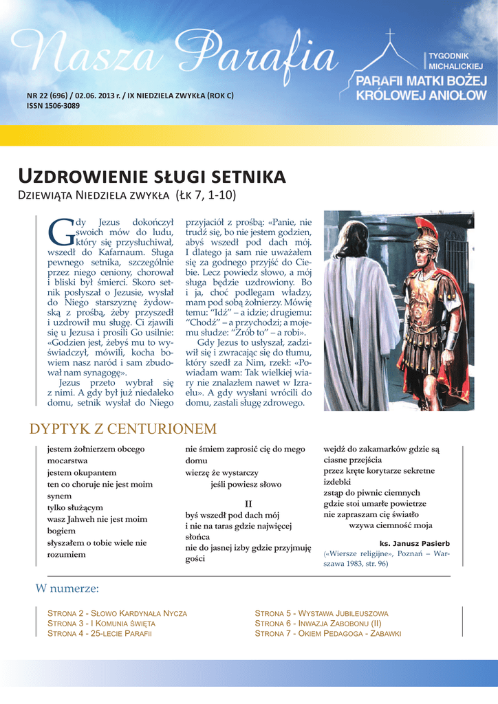 NR 22 •696• / 02.06. 2013 r. / IX NIEDZIELA ZWYKŁA •ROK C• ISSN 1506•3089 U!"#$%&'(&' )*+,& )'-(&47 D••••••• N••"•••# ••$%& (Ł% 7, 1-10) G dy Jezus dokończył swoich mów do ludu, który się przysłuchiwał, wszedł do Kafarnaum. Sługa pewnego setnika, szczególnie przez niego ceniony, chorował i bliski był śmierci. Skoro setnik posłyszał o Jezusie, wysłał do Niego starszyznę żydowską z prośbą, żeby przyszedł i uzdrowił mu sługę. Ci zjawili się u Jezusa i prosili Go usilnie: «Godzien jest, żebyś mu to wyświadczył, mówili, kocha bowiem nasz naród i sam zbudował nam synagogę». Jezus przeto wybrał się z nimi. A gdy był już niedaleko domu, setnik wysłał do Niego przyjaciół z prośbą: «Panie, nie trudź się, bo nie jestem godzien, abyś wszedł pod dach mój. I dlatego ja sam nie uważałem się za godnego przyjść do Ciebie. Lecz powiedz słowo, a mój sługa będzie uzdrowiony. Bo i ja, choć podlegam władzy, mam pod sobą żołnierzy. Mówię temu: “Idź” – a idzie; drugiemu: “Chodź” – a przychodzi; a mojemu słudze: “Zrób to” – a robi». Gdy Jezus to usłyszał, zadziwił się i zwracając się do tłumu, który szedł za Nim, rzekł: «Powiadam wam: Tak wielkiej wiary nie znalazłem nawet w Izraelu». A gdy wysłani wrócili do domu, zastali sługę zdrowego. DYPTYK Z CENTURIONEM jestem żołnierzem obcego mocarstwa jestem okupantem ten co choruje nie jest moim synem tylko służącym wasz Jahweh nie jest moim bogiem słyszałem o tobie wiele nie rozumiem nie śmiem zaprosić cię do mego domu wierzę że wystarczy jeśli powiesz słowo II byś wszedł pod dach mój i nie na taras gdzie najwięcej słońca nie do jasnej izby gdzie przyjmuję gości wejdź do zakamarków gdzie są ciasne przejścia przez kręte korytarze sekretne izdebki zstąp do piwnic ciemnych gdzie stoi umarłe powietrze nie zapraszam cię światło wzywa ciemność moja ks. Janusz Pasierb («Wiersze religijne», Poznań – Warszawa 1983, str. 96) W numerze: STRONA 2 - SŁOWO KARDYNAŁA NYCZA STRONA 3 - I KOMUNIA ŚWIĘTA STRONA 4 - 25-LECIE PARAFII STRONA 5 - WYSTAWA JUBILEUSZOWA STRONA 6 - INWAZJA ZABOBONU (II) STRONA 7 - OKIEM PEDAGOGA - ZABAWKI Nasza Parafia nr 22/2013 Słowo Metropolity Warszawskiego Kazimierza Kardynała Nycza na VI Święto Dziękczynienia Drogie Siostry i Drodzy Bracia w Chrystusie Panu! 1. Panie, nie jestem godzien abyś wszedł pod dach mój (...). Lecz powiedz słowo, a mój sługa będzie uzdrowiony... (Łk 7,6-7) Postawa setnika z Kafarnaum, który szukając pomocy dla swego chorego sługi wyraził wiarę w boską moc Jezusa Chrystusa, pozostaje wciąż swoistą normą wiary dla chrześcijan. W każdej Eucharystii powtarzamy słowa tego pokornego wyznania, ufając, że Bóg wypowiedział w Jezusie słowo mocy - i że to słowo dokona w nas tego, co oznacza: będzie źródłem miłosierdzia dla naszych schorzałych serc. I tak się dzieje. Bóg jest niezawodnym sojusznikiem człowieka - tak, jak matce nigdy nie znudzi się karmić własnego dziecka, tak też Bogu nigdy nie znudzi się okazywanie nam swojej życzliwości. Jakże mogłoby się nam samym znudzić dziękowanie za dobro, którym jesteśmy nieustannie obdarzani? Święto Dziękczynienia, które dziś obchodzimy po raz szósty, jest właśnie po to, byśmy odnowili w sobie postawę dziękczynienia. Chwalcie Pana, bo dobry, bo Jego łaska na wieki... Autor psalmu 136 znajduje aż dwadzieścia sześć powodów, by wychwalać dobroć Boga - i ani razu się przy tym nie powtarza. Czy nie warto i nam stale uaktualniać listy motywów naszej wdzięczności? My, Polacy, uchodzimy za ludzi o dobrych, otwartych sercach, którzy jednak lubią narzekać - czasem narzekać na wszelki wypadek, na zapas, by nie zmarnował się ani jeden okruch nieszczęścia, trudu, cierpienia, jakich - rzeczywiście - nie szczędzi nam życie. To jednak nie jest metoda Jezusa, to nie jest logika Ewangelii! Św. Paweł napomina nas dzisiaj: Nadziwić się nie mogę, że tak szybko chcecie od tego, który was łaską Chrystusa powołał, przejść do innej Ewangelii. Innej jednak Ewangelii nie ma... (Ga 1,6-7) Jaka jest owa prawdziwa Dobra Nowina, Ewangelia ofiarowana nam przez Jezusa, Syna Bożego? To przekonanie, że miłość jest potężniejsza niż śmierć, że łaska jest silniejsza str. 2 niż grzech, że sprawiedliwość zatriumfuje nad nieprawością. Chrystus zwyciężył świat i obiecuje, że my również możemy mieć w nim udział: Wszystko bowiem, co z Boga zrodzone, zwycięża świat; tym właśnie zwycięstwem, które zwyciężyło świat, jest nasza wiara (1 J 5,4). Jakże nie dziękować Bogu za niezasłużony dar wiary? 2. Zaprawdę godne to jest, abyśmy Tobie, Ojcze Święty, zawsze i wszędzie składali dziękczynienie, przez naszego Pana Jezusa Chrystusa... W każdej Mszy św. słyszymy, że dziękowanie Bogu w każdych okolicznościach życia jest sprawiedliwe, słuszne i zbawienne. Przyświadczamy tym słowom, potem zaś klęcząc adorujemy tę chwilę, w której Jezus, mając świadomość przybliżającej się męki, wziął do ręki chleb, który miał się stać sakramentem Jego umęczonego Ciała - i dziękował Ojcu... Zawsze i wszędzie składać dziękczynienie - to prawdziwy znak rozpoznawczy wszystkich, którzy rzeczywiście chcą naśladować Zbawiciela. W naszej procesji dziękczynnej idziemy dzisiaj warszawskim Traktem Królewskim niosąc relikwie św. Andrzeja Boboli, Patrona Polski. Umęczony przez Kozaków w 1657 roku jezuita został 75 lat temu uroczyście kanonizowany w Rzymie, po czym jego relikwie zostały przewiezione do Warszawy. Triumfalny przejazd przez Polskę a potem wjazd męczennika do Stolicy był wówczas okazją do wielkiego dziękczynienia Bogu za to, że daje nam tak mocnych i wyrazistych świadków wiary. Na ulicach Warszawy witali ciało świętego najwyżsi dostojnicy państwowi, pamiętając o t