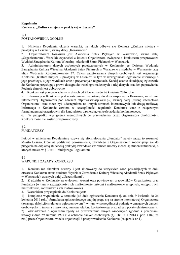 Regulamin Konkurs: „Kultura miejsca – praktykuj w Lesznie” §1 POSTANOWIENIA OGÓLNE 1. Niniejszy Regulamin określa warunki, na jakich odbywa się Konkurs „Kultura miejsca – praktykuj w Lesznie”, zwany dalej „Konkursem”. 2. Organizatorem Konkursu jest Akademia Sztuk Pięknych w Warszawie, zwana dalej „Organizatorem”. Wszelkie czynności w imieniu Organizatora związane z konkursem przeprowadza Wydział Zarządzania Kulturą Wizualną Akademii Sztuk Pięknych w Warszawie. 3. Administratorem danych osobowych przetwarzanych w Konkursie jest Dziekan Wydziału Zarządzania Kulturą Wizualną Akademii Sztuk Pięknych w Warszawie z siedzibą w Warszawie przy ulicy Wybrzeże Kościuszkowskie 37. Celem przetwarzania danych osobowych jest organizacja Konkursu „Kultura miejsca – praktykuj w Lesznie”, w tym w szczególności ogłoszenie informacji o jego przebiegu, o jego wynikach oraz o przyznanych nagrodach. Każdej osobie składającej zgłoszenie do Konkursu przysługuje prawo dostępu do treści zgromadzonych o niej danych oraz ich poprawiania. Podanie danych jest dobrowolne. 4. Konkurs jest przeprowadzany w dniach od 9 kwietnia do 26 kwietnia 2016 roku. 5. Informacja o Konkursie jest udostępniana, najpóźniej do dnia rozpoczęcia Konkursu, na stronie internetowej Organizatora pod adresem http://wzkw.asp.waw.pl/, zwanej dalej „stroną internetową Organizatora” oraz może być udostępniona na innych stronach internetowych lub drogą mailową. Informacja o Konkursie zawiera w szczególności regulamin Konkursu wraz z załączonym formularzem zgłoszeniowym dla kandydatów zawierającym treść zadania konkursowego. 6. W przypadku wystąpienia niemożliwych do przewidzenia przez Organizatora okoliczności, Konkurs może nie zostać przeprowadzony. §2 FUNDATORZY Ilekroć w niniejszym Regulaminie używa się sformułowania „Fundator” należy przez to rozumieć Miasto Leszno, które na podstawie porozumienia, zawartego z Organizatorem zobowiązuje się do przyjęcia na odpłatną studencką praktykę zawodową (w ramach umowy zlecenia) studenta/studentki, o których mowa w § 3 ust. 1 niniejszego Regulaminu. §3 WARUNKI I ZASADY KONKURSU 1. Konkurs ma charakter otwarty i jest skierowany do wszystkich osób posiadających w dniu otwarcia Konkursu status studenta Wydziału Zarządzania Kulturą Wizualną Akademii Sztuk Pięknych w Warszawie), zwanych dalej „Uczestnikami”. 2. Z udziału w Konkursie są wyłączeni krewni oraz powinowaci pracowników Organizatora oraz Fundatora (w tym w szczególności ich małżonkowie, zstępni i małżonkowie zstępnych, wstępni i ich małżonkowie, rodzeństwo i ich małżonkowie). 3. Warunkiem przystąpienia do Konkursu jest: 1) kompletne wypełnienie w terminie (od dnia ogłoszenia Konkursu tj. od dnia 9 kwietnia do 26 kwietnia 2016 roku) formularza zgłoszeniowego znajdującego się na stronie internetowej Organizatora (zwanego dalej „formularzem zgłoszeniowym”) w tym, w szczególności podanie wymaganych danych osobowych (tj. imienia i nazwiska, numeru telefonu kontaktowego oraz adresu poczty elektronicznej); 2) oświadczenia o wyrażeniu zgody na przetwarzanie danych osobowych zgodnie z przepisami ustawy z dnia 29 sierpnia 1997 r. o ochronie danych osobowych (t.j. Dz. U. z 2014 r. poz. 1182, ze zm.) przez Organizatora, w celu organizacji i przeprowadzenia Konkursu (załącznik nr 1). 1 3) wysłanie formularza zgłoszeniowego wraz z załącznikami, o których mowa w pkt 2, za pośrednictwem strony internetowej Organizatora w terminie od dnia rozpoczęcia Konkursu tj. od dnia 9 kwietnia do 26 kwietnia 2016 roku. 4. Wypełnienie formularza zgłoszeniowego jest równoznaczne z akceptacją niniejszego Regulaminu (za wyjątkiem akceptacji oświadczenia o wyrażeniu zgody na przetwarzanie danych osobowych, które wymaga odrębnego własnoręcznego podpisu i nadesłania zgodnie z ust. 3 pkt 2). 6. Jeden Uczestnik może przesłać jedynie jeden formularz zgłoszeniowy. §4 KOMISJA KONKURSOWA 1. Dla potrzeb przeprowadzenia Konkursu utworzona zostanie Komisja Konkursowa, zwana dalej „Komisją”, w skład której wchodzą przedstawiciele Organizatora. Komisję powołuje Dziekan Wydziału Zarządzania Kulturą Wizualną ASP w Warszawie w składzie: Prodziekan, Kierownik Katedry Historii Sztuki Polskiej Najnowszej, Pełnomocnik Dziekana ds. Praktyk Studenckich. 2. Komisja dokonuje oceny zadania, rozwiązanego przez Uczestników Konkursu, w oparciu o szczegółowe kryteria oceny zadania konkursowego, udostępnione zgodnie z § 1 ust. 5 Regulaminu, i wyłania Laureata Konkursu. 3. W przypadku uzyskania tej samej liczby punktów przez więcej niż jednego Uczestnika, Komisja przeprowadza rozmowy sprawdzające wiedzę i kompetencje Uczestników, które będą rozstrzygające dla wyłonienia Laureata. 4. Komisja podejmuje decyzje w drodze głosowania. Decyzje zapadają większością głosów. 5. Ocena rozwiązania zadania konkursowego oraz przeprowadzenie ewentualnych rozmów sprawdzających, o których mowa w ust. 3 powyżej, jest dokonywana w terminie 21 dni roboczych od dnia zakończenia Konkursu. 6. Decyzje Komisji są ostateczne i nie przysługuje od nich odwołanie. 7. Z przebiegu prac Komisji sporządzany jest protokół. 8. Informacja o wyłonieniu Laureata przekazywane są do Fundatora w terminie 7 dni roboczych od dnia zakończenia prac Komisji. §5 PRZEBIEG KONKURSU 1. Konkurs polega na rozwiązaniu zadania przygotowanego przez Organizatora. Zadanie konkursowe wskazane jest w Formularzu zgłoszeniowym, stanowiącym załącznik nr 1 do Regulaminu 2. Za realizację zadania konkursowego Uczestnik może otrzymać maksymalnie 15 punktów. Kryteria oceny realizacji zadania konkursowego wraz z punktacją: - trafność doboru przykładów do opisywanych zagadnień (0-5 punktów); - merytoryczna poprawność argumentacji (0-5 punktów); - rzetelność opisu przykładów do opisywanych zagadnień (0-5 punktów). 3. Uczestnicy 