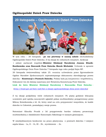 Ogólnopolski Dzień Praw Dziecka W tym roku – 20 listopada - po raz pierwszy w naszej szkole obchodziliśmy Ogólnopolski Dzień Praw Dziecka. Z tej okazji do ciekawych inicjatyw, dyskusji i zabaw zachęcali wspólnie Minister Edukacji Narodowej Joanna KluzikRostkowska oraz Rzecznik Praw Dziecka Marek Michalak. Uchwałę w sprawie Ogólnopolskiego Dnia Praw Dziecka 7 listopada tego roku podjął Sejm RP. 20 listopada świętowaliśmy także 25. rocznicę uchwalenia przez Zgromadzenie Ogólne Narodów Zjednoczonych najważniejszego dokumentu określającego prawa dziecka – Konwencji o Prawach Dziecka. Polska była jej inicjatorem i współtwórcą. Dokument ten do dzisiaj nazywany jest Światową Konstytucją Praw Dziecka. Link do listu Minister Edukacji Narodowej i Rzecznika Praw Dziecka – (http://brpd.gov.pl/listy-rpd/list-z-okazji-ogolnopolskiego-dnia-praw-dziecka) Z tej okazji podjęliśmy wiele ciekawych inicjatyw. Po piątej godzinie lekcyjnej uczniowie pod opieką nauczycieli oglądali pokaz multimedialny przygotowany przez Milenę Kwiatkowską z kl. Id, który miał na celu przypomnieć wszystkim, że każde dziecko to Człowiek, posiadający swoje prawa. Natomiast Klaudia Prusik z 3d przygotowała bardzo ciekawą prezentację multimedialną o działalności Samorządu Szkolnego w naszym gimnazjum. W międzyklasowym konkursie na pracę plastyczną o prawach dziecka: I miejsce zajęła klasa - 1a, II - 1b, III - 3b , wyróżnienie - 3e. Wszyscy uczniowie przyszli ubrani kolorowo, co zwalniało ich z odpowiedzi ustnej i kartkówki. Dziękujemy wszystkim Uczniom za udział w akcji!!! Agnieszka Knieć