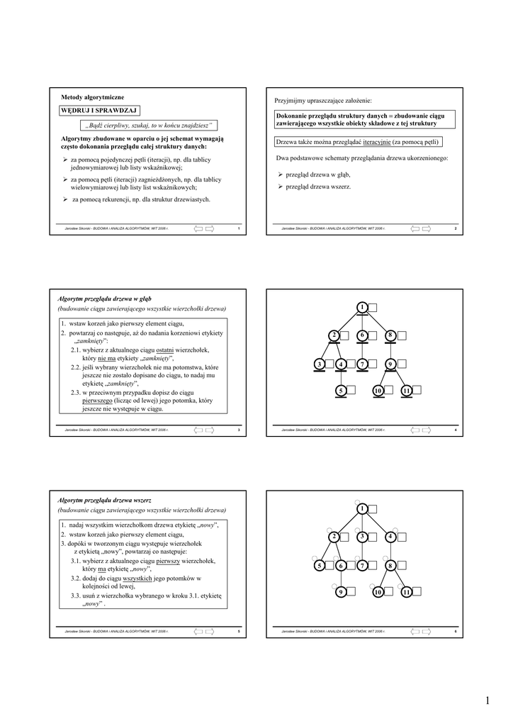 Metody algorytmiczne Przyjmijmy upraszczające założenie: WĘDRUJ I SPRAWDZAJ Dokonanie przeglądu struktury danych = zbudowanie ciągu zawierającego wszystkie obiekty składowe z tej struktury „Bądź cierpliwy, szukaj, to w końcu znajdziesz” Algorytmy zbudowane w oparciu o jej schemat wymagają często dokonania przeglądu całej struktury danych: Drzewa także można przeglądać iteracyjnie (za pomocą pętli) Dwa podstawowe schematy przeglądania drzewa ukorzenionego: za pomocą pojedynczej pętli (iteracji), np. dla tablicy jednowymiarowej lub listy wskaźnikowej; przegląd drzewa w głąb, za pomocą pętli (iteracji) zagnieżdżonych, np. dla tablicy wielowymiarowej lub listy list wskaźnikowych; przegląd drzewa wszerz. za pomocą rekurencji, np. dla struktur drzewiastych. Jarosław Sikorski - BUDOWA i ANALIZA ALGORYTMÓW, WIT 2006 r. 1 Jarosław Sikorski - BUDOWA i ANALIZA ALGORYTMÓW, WIT 2006 r. 2 Algorytm przeglądu drzewa w głąb 1 (budowanie ciągu zawierającego wszystkie wierzchołki drzewa) 1. wstaw korzeń jako pierwszy element ciągu, 2. powtarzaj co następuje, aż do nadania korzeniowi etykiety „zamknięty”: 2.1. wybierz z aktualnego ciągu ostatni wierzchołek, który nie ma etykiety „zamknięty”, 2.2. jeśli wybrany wierzchołek nie ma potomstwa, które jeszcze nie zostało dopisane do ciągu, to nadaj mu etykietę „zamknięty”, 2.3. w przeciwnym przypadku dopisz do ciągu pierwszego (licząc od lewej) jego potomka, który jeszcze nie występuje w ciągu. Jarosław Sikorski - BUDOWA i ANALIZA ALGORYTMÓW, WIT 2006 r. 2 3 4 6 8 7 9 5 3 10 11 Jarosław Sikorski - BUDOWA i ANALIZA ALGORYTMÓW, WIT 2006 r. 4 Algorytm przeglądu drzewa wszerz 1 (budowanie ciągu zawierającego wszystkie wierzchołki drzewa) 1. nadaj wszystkim wierzchołkom drzewa etykietę „nowy”, 2. wstaw korzeń jako pierwszy element ciągu, 3. dopóki w tworzonym ciągu występuje wierzchołek z etykietą „nowy”, powtarzaj co następuje: 3.1. wybierz z aktualnego ciągu pierwszy wierzchołek, który ma etykietę „nowy”, 3.2. dodaj do ciągu wszystkich jego potomków w kolejności od lewej, 3.3. usuń z wierzchołka wybranego w kroku 3.1. etykietę „nowy” . Jarosław Sikorski - BUDOWA i ANALIZA ALGORYTMÓW, WIT 2006 r. 2 5 6 9 5 3 4 7 8 10 Jarosław Sikorski - BUDOWA i ANALIZA ALGORYTMÓW, WIT 2006 r. 11 6 1 1 Algorytmy wyznaczania najdłuższej przekątnej w wielokącie wypukłym Y 1 1 6 2 N - liczba wierzchołków 2 3 6 4 8 7 5 2 9 10 5 11 6 3 4 7 8 9 Przegląd drzewa w głąb 10 5 Strukturą danych dla opisu wielokąta może być tablica dwuwymiarowa: Przegląd drzewa wszerz 7 1. 1 0 d12 d13 ... d21 0 d23 ... d2N d31 d32 0 ... d3N N ... xN 2 y1 y2 y3 ... yN 2. 1 ... ... ... ... ... dN1 dN2 dN3 ... 0 1 6 2 d25 d24 4 4. 3 5. 1 3 6. 1 6 2 5 3 4 1 6 2 4 2. Przejrzyj N(N−1)/2 elementów w górnej trójkątnej połowie tablicy i znajdź największy. 5 4 3 5 ... 3. 1 6 5 6 N 8 2 5 d1N 3 ... x3 2 N 2 3 x2 6 1. Wypełnij tablicę dwuwymiarową NxN długościami wszystkich możliwych przekątnych, ... 2 x1 2. Algorytm najlepszy ze znanych: 1. Algorytm „na siłę”: 3 1 1 Jarosław Sikorski - BUDOWA i ANALIZA ALGORYTMÓW, WIT 2006 r. Co trzeba przejrzeć, aby znaleźć najdłuższą przekątną? 2 X 3 11 Jarosław Sikorski - BUDOWA i ANALIZA ALGORYTMÓW, WIT 2006 r. 1 4 2 5 4 3 4 3 Dla N = 6: 1. Algorytm – 15 kroków, 2. Algorytm – 6 kroków Jarosław Sikorski - BUDOWA i ANALIZA ALGORYTMÓW, WIT 2006 r. 9 Jarosław Sikorski - BUDOWA i ANALIZA ALGORYTMÓW, WIT 2006 r. 10 Algorytm sortowania przez scalanie DZIEL I ZWYCIĘŻAJ Dane wejściowe: nieuporządkowana lista (wskaźnikowa) Jeśli nie możesz uporać się od razu z rozwiązaniem zadania w całości, to spróbuj dzielić je na mniejsze o takiej samej strukturze i stosuj rekurencyjnie procedurę rozwiązywania. Uzyskane rozwiązania małych fragmentów zadań łącz w rozwiązania tych zadań, które były wcześniej dzielone. Przykładem zastosowania metody jest algorytm sortowania przez scalanie Jarosław Sikorski - BUDOWA i ANALIZA ALGORYTMÓW, WIT 2006 r. 11 Procedura sortuj (L) 1. jeśli lista L zawiera tylko jeden element, to jest posortowana, 2. w przeciwnym przypadku wykonaj co następuje: 2.1. podziel listę L na dwie połowy L1 i L2 , 2.2. wywołaj sortuj (L1) , 2.3. wywołaj sortuj (L2) , 2.4. scal posortowane listy L1 i L2 w jedną posortowaną listę , 3. wróć do poziomu wywołania. Jarosław Sikorski - BUDOWA i ANALIZA ALGORYTMÓW, WIT 2006 r. 12 2 Schemat działania algorytmu Schemat scalania w kroku 2.4: 55 12 12 17 17 15 7 45 15 7 77 20 20 21 21 45 8 34 12 11 45 7 15 8 8 12 11 4 34 s. 45 34 p. s. 11 12 scalanie 8 4 p. s. 7 34 12 11 45 s. 7 8 p. 15 12 17 20 21 4 podział p. 7 12 11 4 podział 15 7 5 8 podział 4 34 scalanie 15 45 4 11 12 34 scalanie 4 Jarosław Sikorski - BUDOWA i ANALIZA ALGORYTMÓW, WIT 2006 r. 13 7 8 11 12 15 34 45 Jarosław Sikorski - BUDOWA i ANALIZA ALGORYTMÓW, WIT 2006 r. 14 Algorytm zachłanny do wyznaczania najkrótszej „sieci kolejowej” METODA ZACHŁANNA Przykład dla N = 9 i M = 15: Bywają zadania, których rozwiązanie może być budowane z fragmentów dobieranych kolejno według zasady: „idź naprzód, bierz najlepsze z tego co pod ręką i już nie oddawaj tego, co masz”. 26 3 12 10 Przykładem zastosowania metody jest algorytm wyznaczania minimalnego drzewa rozpinającego w grafie nieskierowanym 13 15 9 6 16 8 4 Dane wejściowe: skończona liczba punktów (N), odcinki łączące wybrane pary punktów (M) i liczby przypisane podanym odcinkom (ich długość, koszt, waga itp.) 11 1. Wybierz najkrótszy odcinek ze wszystkich podanych, 2. Powtarzaj co następuje, aż do połączenia wszystkich punktów: 2.1. Wyznacz zbiór odcinków, które przyłączają do sieci jakiekolwiek jeszcze nie przyłączone miasto, 2.2. Dołącz do sieci najkrótszy odcinek z tego zbioru Wynik: taki zbiór odcinków, który tworzy najkrótszą sieć połączeń wiążącą wsz