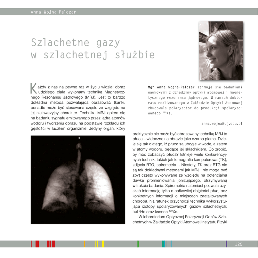 Anna Wojna-Pelczar Szlachetne gazy w szlachetnej służbie K ażdy z nas na pewno raz w życiu widział obraz ludzkiego ciała wykonany techniką Magnetycznego Rezonansu Jądrowego (MRJ). Jest to bardzo dokładna metoda pozwalająca obrazować tkanki, ponadto może być stosowana często ze względu na jej nieinwazyjny charakter. Technika MRJ opiera się na badaniu sygnału emitowanego przez jądra atomów wodoru i tworzeniu obrazu na podstawie rozkładu ich gęstości w ludzkim organizmie. Jedyny organ, który Mgr Anna Wojna-Pelczar zajmuje się badaniami naukowymi z dziedziny optyki atomowej i magnetycznego rezonansu jądrowego. W ramach doktoratu realizowanego w Zakładzie Optyki Atomowej zbudowała polaryzator do produkcji spolaryzowanego 129Xe. [email protected] praktycznie nie może być obrazowany techniką MRJ to płuca – widoczne na obrazie jako czarna plama. Dzieje się tak dlatego, iż płuca są ubogie w wodę, a zatem w atomy wodoru, będące jej składnikiem. Co zrobić, by móc zobaczyć płuca? Istnieje wiele konkurencyjnych technik, takich jak tomografia komputerowa (TK), zdjęcia RTG, spirometria… Niestety, TK oraz RTG nie są tak dokładnymi metodami jak MRJ i nie mogą być zbyt często wykonywane ze względu na potencjalną dawkę promieniowania jonizującego, otrzymywaną w trakcie badania. Spirometria natomiast pozwala uzyskać informację tylko o całkowitej objętości płuc, bez konkretnych informacji o miejscach zaatakowanych chorobą. Na ratunek przychodzi technika wykorzystująca izotopy spolaryzowanych gazów szlachetnych: hel 3He oraz ksenon 129Xe. W laboratorium Optycznej Polaryzacji Gazów Szlachetnych w Zakładzie Optyki Atomowej Instytutu Fizyki 125 Anna Wojna-Pelczar UJ przygotowuję gazy do wykorzystania ich jako kontrast w badaniach MRJ. 3He i 129Xe grają teraz rolę wodoru. Gazy te wstępnie muszą być przygotowane. Polega to na ustawieniu spinów jąder w polu magnetycznym tak, by sygnał z ośrodka rzadkiego, jakim jest gaz, był wystarczająco silny do odtworzenia obrazu płuc. Istnieją dwie metody polaryzowania optycznego gazów szlachetnych: pompowanie optyczne z wymianą metastabilności (ang. Metastability Exchange Optical Pumping – MEOP) oraz pompowanie optyczne z wymianą spinu (ang. Spin Exchange Optical Pumping – SEOP), które pozwalają osiągnąć hiperpolaryzację – stan polaryzacji jąder, w którym do obrazowania jest przygotowanych kilka tysięcy razy więcej jąder niż w warunkach równowagowych. Obie metody są dwustopniowe. Najpierw zachodzi pompowanie optyczne z wykorzystaniem technik laserowych. Dokonujemy wtedy zmian w obsadzeniu poziomów energetycznych atomów 3He lub metalu alkalicznego (np. Rb). Następnie wskutek zderzeń 3 He- 3He (MEOP) lub Rb-129Xe (SEOP) następuje przekaz polaryzacji do jąder atomowych (zmiana ustawienia spinów). Procesy te zachodzą w jednorodnym polu magnetycznym, w czystych komórkach szklanych, gdyż jakiekolwiek zderzenie z jądrami paramagnetycznymi obecnymi np. w szkle naczynia lub gradienty pola magnetycznego powodują niekorzystną depolaryzację. Odpowiednie warunki fizyczne dla procesów MEOP i SEOP są stwarzane w urządzeniach – polaryzatorach. 126 Spolaryzowane gazy podawane są pacjentowi w skanerze MRJ i po kilku sekundach tworzony jest wysokiej rozdzielczości obraz płuc. Zaaplikowanie obojętnego biologicznie znacznika (spolaryzowanego 3He czy 129Xe) polega na wykonaniu przez pacjenta jednego wdechu. Badanie to jest całkowicie bezpieczne i może być stosowane u osób z trudnościami z oddychaniem. Metoda ta pozwala na wykrycie raka płuc wcześniej niż z użyciem innych metod diagnostycznych, pozwala także na kontrolę postępu choroby w przypadku przewlekłej obturacyjnej choroby płuc, mukowiscydozy oraz astmy, czy obserwacje pracy płuc po przeszczepach. Obrazowanie płuc MRJ nie jest ograniczone dawką promieniowania, a zatem można je powtarzać dowolnie często. Badanie trwa krótko, nie jest uciążliwe dla pacjenta. Podczas badania wykorzystywane są dostępne skanery MRJ, dzięki czemu można uniknąć dodatkowych kosztów zakupu sprzętu. Ponadto obrazowanie spolaryzowanymi 3He lub 129Xe pozwala na śledzenie drogi gazu w płucach, i tym samym utworzenie klatka po klatce filmu. Analiza rozchodzenia się gazu w płucach umożliwia natychmiastowe rozpoznanie miejsc wyłączonych z oddychania. Spolaryzowane gazy szlachetne rzucają nowe światło na niezwykle trudną diagnostykę płuc, a dzięki interdyscyplinarnym i nowatorskim badaniom z zakresu technik laserowych i magnetycznego rezonansu jądrowego eliminowane są wszystkie ograniczenia dotychczas stosowanych metod, uznanych za klasyczne.