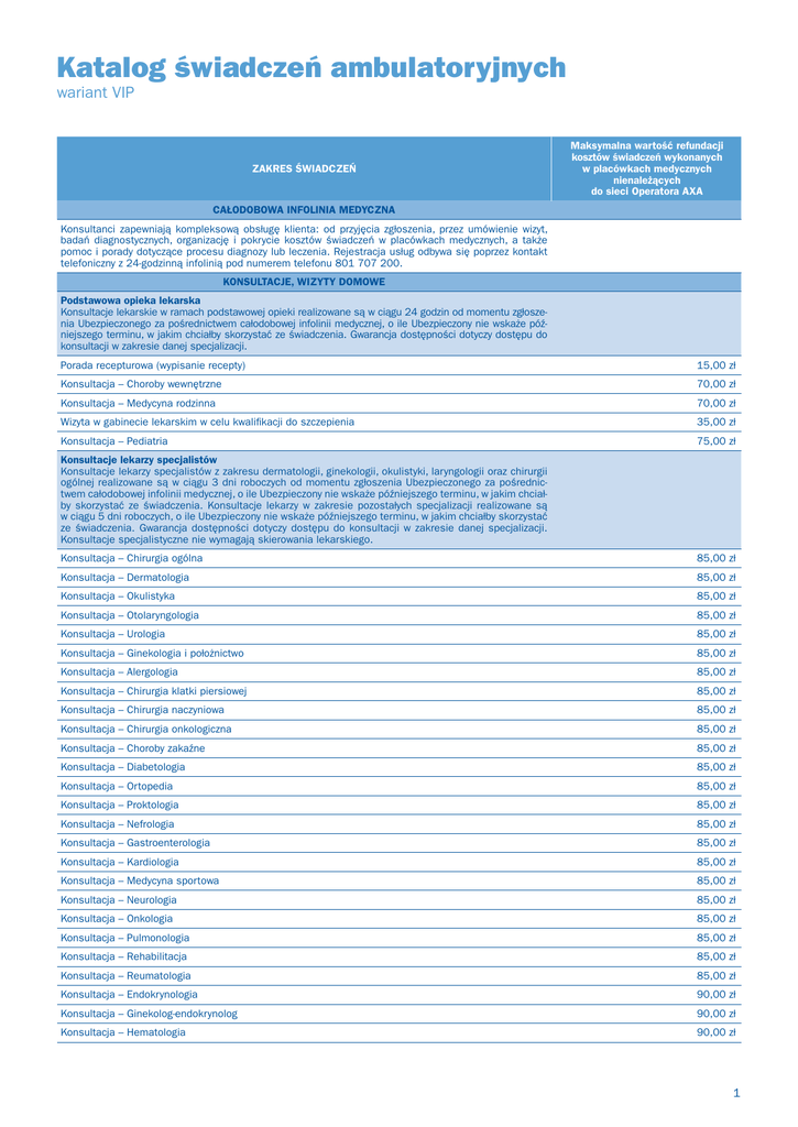 Katalog świadczeń ambulatoryjnych wariant VIP ZAKRES ŚWIADCZEŃ Maksymalna wartość refundacji kosztów świadczeń wykonanych w placówkach medycznych nienależących do sieci Operatora AXA CAŁODOBOWA INFOLINIA MEDYCZNA Konsultanci zapewniają kompleksową obsługę klienta: od przyjęcia zgłoszenia, przez umówienie wizyt, badań diagnostycznych, organizację i pokrycie kosztów świadczeń w placówkach medycznych, a także pomoc i porady dotyczące procesu diagnozy lub leczenia. Rejestracja usług odbywa się poprzez kontakt telefoniczny z 24-godzinną infolinią pod numerem telefonu 801 707 200. KONSULTACJE, WIZYTY DOMOWE Podstawowa opieka lekarska Konsultacje lekarskie w ramach podstawowej opieki realizowane są w ciągu 24 godzin od momentu zgłoszenia Ubezpieczonego za pośrednictwem całodobowej infolinii medycznej, o ile Ubezpieczony nie wskaże późniejszego terminu, w jakim chciałby skorzystać ze świadczenia. Gwarancja dostępności dotyczy dostępu do konsultacji w zakresie danej specjalizacji. Porada recepturowa (wypisanie recepty) 15,00 zł Konsultacja – Choroby wewnętrzne 70,00 zł Konsultacja – Medycyna rodzinna 70,00 zł Wizyta w gabinecie lekarskim w celu kwalifikacji do szczepienia 35,00 zł Konsultacja – Pediatria 75,00 zł Konsultacje lekarzy specjalistów Konsultacje lekarzy specjalistów z zakresu dermatologii, ginekologii, okulistyki, laryngologii oraz chirurgii ogólnej realizowane są w ciągu 3 dni roboczych od momentu zgłoszenia Ubezpieczonego za pośrednictwem całodobowej infolinii medycznej, o ile Ubezpieczony nie wskaże późniejszego terminu, w jakim chciałby skorzystać ze świadczenia. Konsultacje lekarzy w zakresie pozostałych specjalizacji realizowane są w ciągu 5 dni roboczych, o ile Ubezpieczony nie wskaże późniejszego terminu, w jakim chciałby skorzystać ze świadczenia. Gwarancja dostępności dotyczy dostępu do konsultacji w zakresie danej specjalizacji. Konsultacje specjalistyczne nie wymagają skierowania lekarskiego. Konsultacja – Chirurgia ogólna 85,00 zł Konsultacja – Dermatologia 85,00 zł Konsultacja – Okulistyka 85,00 zł Konsultacja – Otolaryngologia 85,00 zł Konsultacja – Urologia 85,00 zł Konsultacja – Ginekologia i położnictwo 85,00 zł Konsultacja – Alergologia 85,00 zł Konsultacja – Chirurgia klatki piersiowej 85,00 zł Konsultacja – Chirurgia naczyniowa 85,00 zł Konsultacja – Chirurgia onkologiczna 85,00 zł Konsultacja – Choroby zakaźne 85,00 zł Konsultacja – Diabetologia 85,00 zł Konsultacja – Ortopedia 85,00 zł Konsultacja – Proktologia 85,00 zł Konsultacja – Nefrologia 85,00 zł Konsultacja – Gastroenterologia 85,00 zł Konsultacja – Kardiologia 85,00 zł Konsultacja – Medycyna sportowa 85,00 zł Konsultacja – Neurologia 85,00 zł Konsultacja – Onkologia 85,00 zł Konsultacja – Pulmonologia 85,00 zł Konsultacja – Rehabilitacja 85,00 zł Konsultacja – Reumatologia 85,00 zł Konsultacja – Endokrynologia 90,00 zł Konsultacja – Ginekolog-endokrynolog 90,00 zł Konsultacja – Hematologia 90,00 zł 1 ZAKRES ŚWIADCZEŃ Maksymalna wartość refundacji kosztów świadczeń wykonanych w placówkach medycznych nienależących do sieci Operatora AXA Konsultacja – Anestezjolog 90,00 zł Konsultacja – Neurochirurgia 90,00 zł Konsultacje – inne Konsultacje dietetyka, logopedy i psychologa nie wymagają skierowania lekarskiego. Ubezpieczenie obejmuje do 20 konsultacji psychologa w ciągu każdych kolejnych 12 miesięcy ochrony ubezpieczoniowej udzielanej Ubezpieczonemu. Konsultacja – Dietetyk 80,00 zł Konsultacja – Logopeda 80,00 zł Konsultacja – Psycholog 80,00 zł Wizyty domowe Wizyty domowe realizowane są przez lekarzy podstawowej opieki lekarskiej wyłącznie w przypadkach, gdy istnieje medyczne uzasadnienie braku możliwości odbycia przez Ubezpieczonego konsultacji w placówce medycznej. Wskazaniem do wizyty domowej nie są w szczególności: – potrzeba odbycia wizyty kontrolnej w związku z wcześniej rozpoczętym leczeniem, – zapotrzebowanie na recepty na leki stosowane w sposób ciągły w związku z przewlekłą chorobą, – zapotrzebowanie na zaświadczenia lub skierowania lekarskie, – problemy organizacyjne w dotarciu do placówki medycznej. Wizyta domowa – dorośli – dzień powszedni 130,00 zł Wizyta domowa – dorośli – dni świąteczne i noce (20.00–08.00) 180,00 zł Wizyta domowa – dzieci – dzień powszedni 130,00 zł Wizyta domowa – dzieci – dni świąteczne i noce (20.00–08.00) 180,00 zł ZABIEGI AMBULATORYJNE Ambulatoryjne zabiegi chirurgiczne Zabiegi wykonywane są w warunkach ambulatoryjnych na zlecenie lekarza. Proste nacięcie i usunięcie ciała obcego, tkanek podskórnych 150,00 zł Nacięcie i drenaż krwiaka, zbiornika płynu surowiczego lub innego zbiornika płynu 150,00 zł Usunięcie szwów 35,00 zł Zmiana opatrunku 35,00 zł Nakłucie stawu, aspiracja i/lub wstrzyknięcie; mały staw lub kaletka (np. palce u rąk lub nóg) 65,00 zł Nakłucie stawu, aspiracja i/lub wstrzyknięcie; średniej wielkości staw lub kaletka (np. staw skroniowo-żuchwowy, barkowo-obojczykowy, nadgarstek, staw łokciowy lub skokowy, kaletka maziowa wyrostka łokciowego) 75,00 zł Nakłucie stawu, aspiracja i/lub wstrzyknięcie; duży staw lub kaletka (np. staw ramienny, biodrowy, kolanowy, kaletka barkowa) 80,00 zł Proste zamknięcie powierzchownych ran owłosionej skóry głowy, szyi, pachy, narządów płciowych zewnętrznych, tułowia i/lub kończyn 130,00 zł Proste zamknięcie powierzchownych ran twarzy, uszu, powiek, nosa, warg i/lub błon śluzowych 140,00 zł Nacięcie i drenaż ropnia (np. czyrak mnogi, ropne zapalenie gruczołów potowych, ropień skóry lub tkanki podskórnej, torbiel, czyrak lub zanokcica); proste lub pojedyncze 150,00 zł Proste nacięcie i drenaż torbieli włosowej 145,00 zł Proste usunięcie płytki paznokciowej, częściowe lub całkowite 170,00 zł Wprowadzenie c