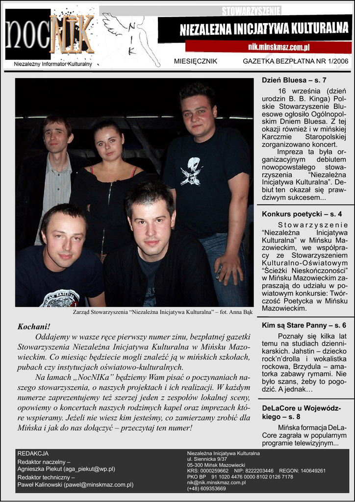 MIESIĘCZNIK GAZETKA BEZPŁATNA NR 1/2006 Dzień Bluesa – s. 7 16 września (dzień urodzin B. B. Kinga) Polskie Stowarzyszenie Bluesowe ogłosiło Ogólnopolskim Dniem Bluesa. Z tej okazji również i w mińskiej Karczmie Staropolskiej zorganizowano koncert. Impreza ta była organizacyjnym debiutem nowopowstałego stowarzyszenia “Niezależna Inicjatywa Kulturalna”. Debiut ten okazał się prawdziwym sukcesem... Konkurs poetycki – s. 4 Zarząd Stowarzyszenia “Niezależna Inicjatywa Kulturalna” – fot. Anna Bąk Kochani! Oddajemy w wasze ręce pierwszy numer zinu, bezpłatnej gazetki Stowarzyszenia Niezależna Inicjatywa Kulturalna w Mińsku Mazowieckim. Co miesiąc będziecie mogli znaleźć ją w mińskich szkołach, pubach czy instytucjach oświatowo-kulturalnych. Na łamach „NocNIKa” będziemy Wam pisać o poczynaniach naszego stowarzyszenia, o naszych projektach i ich realizacji. W każdym numerze zaprezentujemy też szerzej jeden z zespołów lokalnej sceny, opowiemy o koncertach naszych rodzimych kapel oraz imprezach które wspieramy. Jeżeli nie wiesz kim jesteśmy, co zamierzamy zrobić dla Mińska i jak do nas dołączyć – przeczytaj ten numer! REDAKCJA Redaktor naczelny – Agnieszka Piekut ([email protected]) Redaktor techniczny – Paweł Kalinowski ([email protected]) Stowarzyszenie “Niezależna Inicjatywa Kulturalna” w Mińsku Mazowieckim, we współpracy ze Stowarzyszeniem Kulturalno-Oświatowym “Ścieżki Nieskończoności” w Mińsku Mazowieckim zapraszają do udziału w powiatowym konkursie: Twórczość Poetycka w Mińsku Mazowieckim. Kim są Stare Panny – s. 6 Poznały się kilka lat temu na studiach dziennikarskich. Jahstin – dziecko rock’n’drolla i wokalistka rockowa, Brzydula – amatorka zabawy rymami. Nie było szans, żeby to pogodzić. A jednak… DeLaCore u Wojewódzkiego – s. 8 Mińska formacja DeLaCore zagrała w popularnym programie telewizyjnym... Niezależna Inicjatywa Kulturalna ul. Siennicka 9/37 05-300 Mińsk Mazowiecki KRS: 0000259662 NIP: 8222203446 REGON: 140649261 PKO BP 91 1020 4476 0000 8102 0126 7178 [email protected] (+48) 609353669 Czym jest Niezależna Inicjatywa Kulturalna? Mamy ogromną przyjemność poinformować Państwa, że decyzją z dnia 29.06.2006 sąd rejonowy dla miasta stołecznego Warszawy, postanowił wpisać do Krajowego Rejestru Sądowego - Rejestru Stowarzyszeń, Innych Organizacji Społecznych i Zawodowych, Fundacji oraz Publicznych Zakładów Opieki Zdrowotnej pod numerem KRS: 000259662 Stowarzyszenie “Niezależna Inicjatywa Kulturalna”, które ma na celu promocję i stymulowanie projektów kulturalnych na terenie Mińska Mazowieckiego i całego powiatu mińskiego. Inicjatywa ta powstała w wyniku wielu rozmów z osobami, biorącymi aktywny udział w życiu kulturalnym miasta, w szczególności z muzykami tworzącymi mińskie zespoły młodzieżowe. Dostrzegamy duże zapotrzebowanie ze strony ludzi młodych na uczestnictwo w tego typu działaniach i jednocześnie brak faktycznego poparcia dla spontanicznej aktywności młodzieży ze strony instytucji i organizacji, których celem działalności jest promocja kultury i sztuki. Sytuacja ta dziwi tym bardziej, że niektóre mińskie zespoły muzyczne (3Siostry, DeLaCore, Los Alamos, Street Terror, Muzyka Końca Lata) zdobyły niemałą popularność i są znane w całym kraju, a ich twórczość została uhonorowana wieloma nagrodami. Żeby wypełnić powstałą przez nieudolną politykę kulturalną miasta lukę, zarejestrowane zostało to stowarzyszenie non-profit. Stowarzyszenie nosi nazwę „Niezależna Inicjatywa Kulturalna”. Naszym celem jest wspieranie i animowanie aktywności społeczno-kulturalnej w środowiskach lokalnych, promowanie mińskiej twórczości w granicach i poza granicami powiatu. W pierwszej kolejności zamierzamy podjąć następujące działania: organizacja koncertów, wystaw sztuki plastycznej i innych imprez kulturalnych, uruchomienie internetowej rozgłośni radiowej, wydawanie tej oto gazetki (zinu) poświęconej życiu kulturalnemu Mińska Mazowieckiego, zorganizowanie sali prób dla młodzieżowych zespołów z Mińska Mazowieckiego, wydanie płyty promo, promującej mińską muzykę. Więcej informacji o Stowarzyszeniu znajdziecie pod adresem www.nik.minskmaz.com.pl. Jak do nas dołączyć? Stowarzyszenie nie zamyka się ani na pomysły ani na nowych członków. Chcemy promować szeroko pojętą kulturę i mamy nadzieję, że miłośnicy lokalnych przedsięwzięć przyłączą się do ich propagowania, wstępując do NIK. Nie musisz być muzykiem ani aktywnym działaczem kulturalnym, jeśli chcesz wspomóc lokalne przedsięwzięcia i interesujesz się lokalną kulturą – możesz nam pomóc. Deklaracje członkowskie, które należy wypełnić, znajdziecie w każdym numerze gazetki zin. Możecie ją też pobrać z naszej strony internetowej www.nik.minskmaz.com.pl, w razie pytań prosimy pisać na naszego maila [email protected], odpowiemy na wszelkie wątpliwości. WŁADZE STOWARZYSZENIA ZARZĄD: Jacek Bieliński – prezes socjolog, absolwent Collegium Civitas, obecnie asystent w Katedrze Socjologii Collegium Civitas oraz doktorant w Szkole Nauk Społecznych przy IFiS PAN. Główne zainteresowania naukowe koncentrują się wokół socjologii ekonomicznej oraz przemian społecznych, politycznych i gospodarczych w krajach Środkowej i Wschodniej Europy. Posiada doświadczenie w badaniach akademickich oraz rynkowych. Od 2005 członek zarządu i skarbnik stowarzyszenia “Stowarzyszenie - Fundamenty Silnego Państwa”, od 2006 prezes stowarzyszenia “Niezależna Inicjatywa Kulturalna” z siedzibą w Mińsku Mazowieckim. Gitarzysta zespołu Freemind Society. Strona WWW: http://www.civitas.edu.pl/bielinski/ Kamil Kaźmierczak – wiceprezes student V roku politologii, specjalność: dziennikarstwo, UMCS Lublin. Zawodowo związany z TVN24, producent. Główne zainteresowania to muzyka i czynne uczestni