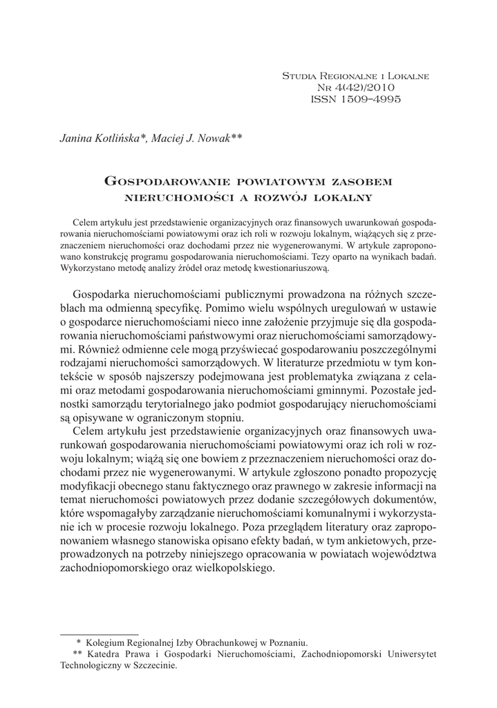 Studia Regionalne i Lokalne Nr 4(42)/2010 ISSN 1509–4995 Janina Kotlińska*, Maciej J. Nowak** Gospodarowanie powiatowym zasobem nieruchomości a rozwój lokalny Celem artykułu jest przedstawienie organizacyjnych oraz finansowych uwarunkowań gospodarowania nieruchomościami powiatowymi oraz ich roli w rozwoju lokalnym, wiążących się z przeznaczeniem nieruchomości oraz dochodami przez nie wygenerowanymi. W artykule zaproponowano konstrukcję programu gospodarowania nieruchomościami. Tezy oparto na wynikach badań. Wykorzystano metodę analizy źródeł oraz metodę kwestionariuszową. Gospodarka nieruchomościami publicznymi prowadzona na różnych szczeblach ma odmienną specyfikę. Pomimo wielu wspólnych uregulowań w ustawie o gospodarce nieruchomościami nieco inne założenie przyjmuje się dla gospodarowania nieruchomościami państwowymi oraz nieruchomościami samorządowymi. Również odmienne cele mogą przyświecać gospodarowaniu poszczególnymi rodzajami nieruchomości samorządowych. W literaturze przedmiotu w tym kontekście w sposób najszerszy podejmowana jest problematyka związana z celami oraz metodami gospodarowania nieruchomościami gminnymi. Pozostałe jednostki samorządu terytorialnego jako podmiot gospodarujący nieruchomościami są opisywane w ograniczonym stopniu. Celem artykułu jest przedstawienie organizacyjnych oraz finansowych uwarunkowań gospodarowania nieruchomościami powiatowymi oraz ich roli w rozwoju lokalnym; wiążą się one bowiem z przeznaczeniem nieruchomości oraz dochodami przez nie wygenerowanymi. W artykule zgłoszono ponadto propozycję modyfikacji obecnego stanu faktycznego oraz prawnego w zakresie informacji na temat nieruchomości powiatowych przez dodanie szczegółowych dokumentów, które wspomagałyby zarządzanie nieruchomościami komunalnymi i wykorzystanie ich w procesie rozwoju lokalnego. Poza przeglądem literatury oraz zaproponowaniem własnego stanowiska opisano efekty badań, w tym ankietowych, przeprowadzonych na potrzeby niniejszego opracowania w powiatach województwa zachodniopomorskiego oraz wielkopolskiego. * Kolegium Regionalnej Izby Obrachunkowej w Poznaniu. ** Katedra Prawa i Gospodarki Nieruchomościami, Zachodniopomorski Uniwersytet Technologiczny w Szczecinie. 106 Janina Kotlińska, Maciej J. Nowak Powiat w rozwoju lokalnym Rozwój lokalny, rozumiany jako proces pozytywnych zmian (zarówno ilościowych, jak i jakościowych) zachodzących na stosunkowo niewielkim obszarze, sprowadza się do harmonijnej realizacji dwóch głównych celów, tj. zaspokajania potrzeb społecznych oraz rozwoju gospodarczego. W związku z powyższym można zadać pytanie, jak poszczególne cele rozwoju lokalnego będą realizowane na szczeblu powiatu. Wyjaśnienia tej kwestii można szukać w aktywności władz powiatu, uwarunkowanej regulacjami zawartymi przede wszystkim w ustawie o samorządzie powiatowym1. Z reguły pisząc o rozwoju lokalnym, wskazuje się zadania i rolę gmin w tym zakresie. Rola powiatu w rozwoju lokalnym pozostaje bowiem wciąż doprecyzowywana. Zakres realizacji spraw wpisanych w rozwój lokalny uzależniony jest przy tym w znaczącym stopniu od modelu współpracy pomiędzy powiatem a gminą, a ta na przestrzeni ostatnich dziesięciu lat przybierała różne formy. Na początku reformy samorządowej z drugiej połowy lat 90. powiat był postrzegany jako zagrożenie dla gmin. Istniały obawy, że docelowo może on odebrać gminom pewne kompetencje. Wskazywano także, że wyrazem przeszkód we współpracy gmin z powiatami jest możliwość stanowienia przez gminy związków między gminnych. Przeszkody we współpracy mogą wynikać także z założenia, że gminy nie potrafią współpracować z powiatami, tylko wolą porozumiewać się pomiędzy sobą (Tucholska 2007). Pomimo licznych trudności niektóre powiaty potrafią zaproponować gminom efektywne współdziałanie na rzecz rozwoju lokalnego, np. w zakresie prowadzenia działalności pożytku publicznego czy też pobudzania przedsiębiorczości. Gospodarowanie nieruchomościami publicznymi Przez gospodarowanie nieruchomościami należy rozumieć ogół zależności i relacji występujących między przedmiotem (nieruchomością) a podmiotem gospodarowania. Podmiot gospodarowania jest związany z daną nieruchomością wskutek określonego stosunku prawnego, np. prawa własności, użytkowania wieczystego czy najmu. Gospodarowanie nieruchomościami publicznymi wiąże się ponadto z obowiązkiem realizacji zadań publicznych, które ciążą na podmiotach gospodarujących. W gospodarowaniu nieruchomościami publicznymi rozróżnić należy pojęcie nieruchomości gminnych/powiatowych/wojewódzkich/państwowych (stanowiących przedmiot własności danej jednostki) od gminnego/powiatowego/wojewódzkiego/państwowego zasobu nieruchomości2. W tym drugim przypadku chodzi o nieruchomości, na których zagospodarowanie dany podmiot publicz1 Ustawa z dnia 5 czerwca 1998 r. o samorządzie powiatowym, Dz.U. 2000, nr 46, poz. 543 z późn. zm. 2 Ustawa z dnia 1 sierpnia 1997 r. o gospodarce nieruchomościami, Dz.U. 2000, nr 46, poz. 543 z późn. zm. Gospodarowanie powiatowym zasobem nieruchomości a rozwój lokalny 107 ny ma rzeczywisty wpływ. Może więc zdarzyć się sytuacja, kiedy dana nieruchomość stanowiąca przedmiot własności powiatu nie będzie zarazem znajdować się w powiatowym zasobie nieruchomości z uwagi na fakt, że została oddana w użytkowanie wieczyste. Nieruchomość stanowiąca przedmiot własności danego podmiotu publicznego, ale zarazem nienależąca do zasobu nieruchomości tego podmiotu, może również przynosić pewne korzyści (np. opłaty z tytułu użytkowania wieczystego, podatku od nieruchomości), ale – dopóki nie znajdzie się we wspomnianym zasobie – nie można nią swobodnie dysponować lub zmieniać jej przeznaczenia. Tak jak gminnemu, również i powiatowemu zasobowi nieruchomości można przypisać pe