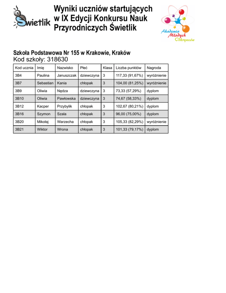 Wyniki uczniów startujących w IX Edycji Konkursu Nauk Przyrodniczych Świetlik Szkoła Podstawowa Nr 155 w Krakowie, Kraków Kod szkoły: 318630 Kod ucznia Imię Nazwisko Płeć Klasa Liczba punktów Nagroda 3B4 Paulina Januszczak dziewczyna 3 117,33 (91,67%) wyróżnienie 3B7 Sebastian Kania chłopak 3 104,00 (81,25%) wyróżnienie 3B9 Oliwia Nędza dziewczyna 3 73,33 (57,29%) dyplom 3B10 Oliwia Pawłowska dziewczyna 3 74,67 (58,33%) dyplom 3B12 Kacper Przybylik chłopak 3 102,67 (80,21%) dyplom 3B16 Szymon Szala chłopak 3 96,00 (75,00%) dyplom 3B20 Mikołaj Warzecha chłopak 3 105,33 (82,29%) wyróżnienie 3B21 Wiktor Wrona chłopak 3 101,33 (79,17%) dyplom