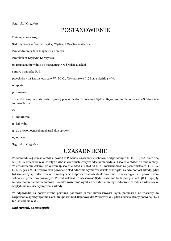 Sygn. akt I C 550/12 POSTANOWIENIE Dnia 07 marca 2013 r. Sąd Rejonowy w Środzie Śląskiej Wydział I Cywilny w składzie : Przewodniczący SSR Magdalena Korczak Protokolant Krystyna Korczyńska po rozpoznaniu w dniu 07 marca 2013r. w Środzie Śląskiej sprawy z wniosku R. P. przeciwko (...) S.A. z siedzibą w W., M. O., Towarzystwu (...) S.A. z siedzibą w W. o zapłatę postanawia : stwierdzić swą niewłaściwość i sprawę przekazać do rozpoznania Sądowi Rejonowemu dla Wrocławia-Śródmieścia we Wrocławiu. Z/ 1. odnotować, 2. kal. 7 dni, 3. do prawomocności przekazać akta sprawy. 07.03.2013r. Sygn. akt I C 550/12 UZASADNIENIE Pozwem z dnia 4 września 2012 r. powód R. P. wniósł o zasądzenie solidarnie od pozwanych M. O., (...) S.A. z siedzibą w (...) S.A. z siedzibą w W. kwoty 20.000 zł wraz z ustawowymi odsetkami od dnia 11 stycznia 2010 r. do dnia zapłaty. W uzasadnieniu wskazał, że w dniu 19 stycznia 2010 r. nabył od M. O. nieruchomość za pośrednictwem (...) S.A. (...) S.A, jak i M. O. wprowadzili powoda w błąd odnośnie wymiarów działki w związku z czym poniósł szkodę, gdyż był zmuszony sprzedać działkę za niższą cenę. Odpowiedzialność deliktowa umożliwia wystąpienie z powództwem solidarnie przeciwko pozwanym. Powód wskazał, że właściwość Sądu uzasadnia treść przepisu art. 38 § 1 kpc, tj. miejsce położenia nieruchomości. Ponadto roszczenie wynika z deliktu i może być wytoczone przed Sąd właściwy ze względu na miejsce wyrządzenia szkody. W odpowiedzi na pozew strona pozwana podniosła zarzut niewłaściwości Sądu, podnosząc, że właściwy do rozpoznania sprawy zgodnie z art. 30 kpc jest Sąd Rejonowy dla Warszawy W., gdyż siedziba strony pozwanej (...) S.A. mieści się w W.. Sąd zważył, co następuje: Sąd, który stwierdzi swą niewłaściwość przekaże sprawę sądowi właściwemu. Niewłaściwość sądu dająca się usunąć za pomocą umowy stron sąd bierze jednak pod uwagę jedynie na zarzut pozwanego zgłoszony i należycie uzasadniony przed wdaniem się w spór co do istoty sprawy. ( art. 200 § 1 k.p.c i art. 202 k.p.c. ). Na wstępie wskazać należy, że to powód dokonuje wyboru Sądu przed który wytacza powództwo. Właściwość przemienna polega bowiem na tym, że miejscowo właściwy w określonej kategorii spraw jest zarówno sąd właściwości ogólnej, jak i sąd (lub sądy) określony w przepisach art. 32–37 kpc, a wybór sądu, przed który ma być wytoczone powództwo pozostawiony jest powodowi. Powód, wytaczając powództwo przed sąd inny niż wyznaczony miejscem zamieszkania czy siedzibą pozwanego, powinien w pozwie podać okoliczności uzasadniające właściwość sądu według przepisów o właściwości przemiennej (zob. także uchwała SN z dnia 9 czerwca 2005 r., III CZP 28/05, OSNC 2006, nr 4, poz. 61). Powód, pozywając solidarnie M. O., (...) S.A. oraz Towarzystwo (...) S.A. spełnił ten wymóg, wskazując m.in., że wywozi swe roszczenie z czynu niedozwolonego. W uzasadnieniu pozwu powód podał bowiem, że wskutek działania (...) S.A. oraz M. O. poniósł szkodę. Powództwo o roszczenie z czynu niedozwolonego można wytoczyć przed sąd, w którego okręgu nastąpiło zdarzenie wywołujące szkodę (art. 35 k.p.c.). W niniejszej sprawie za zdarzenie takie należy uznać miejsce zawarcia umowy pośrednictwa z (...) S.A. lub umowy sprzedaży nieruchomości zawartej w dniu 19 stycznia 2010 r. z M. O.. Obie umowy zostały zawarte we W., jednak z akt sprawy nie wynika gdzie dokładnie została zawarta umowa o pośrednictwo. Umowa sprzedaży nieruchomości zwarta z M. O., została podpisana we W. przy ul. (...), co uzasadnia właściwość Sądu Rejonowego dla Wrocławia – Śródmieścia. Mając powyższe na uwadze, na podstawie art. 200 § 1 k.p.c. należało orzec jak w sentencji. Z/ 1. odnotować 2. odpis postanowienia wraz z uzasadnieniem doręczyć pełnomocnikowi (...) S.A. 3. kal. 7 dni 4. po prawomocności przekazać akta sprawy