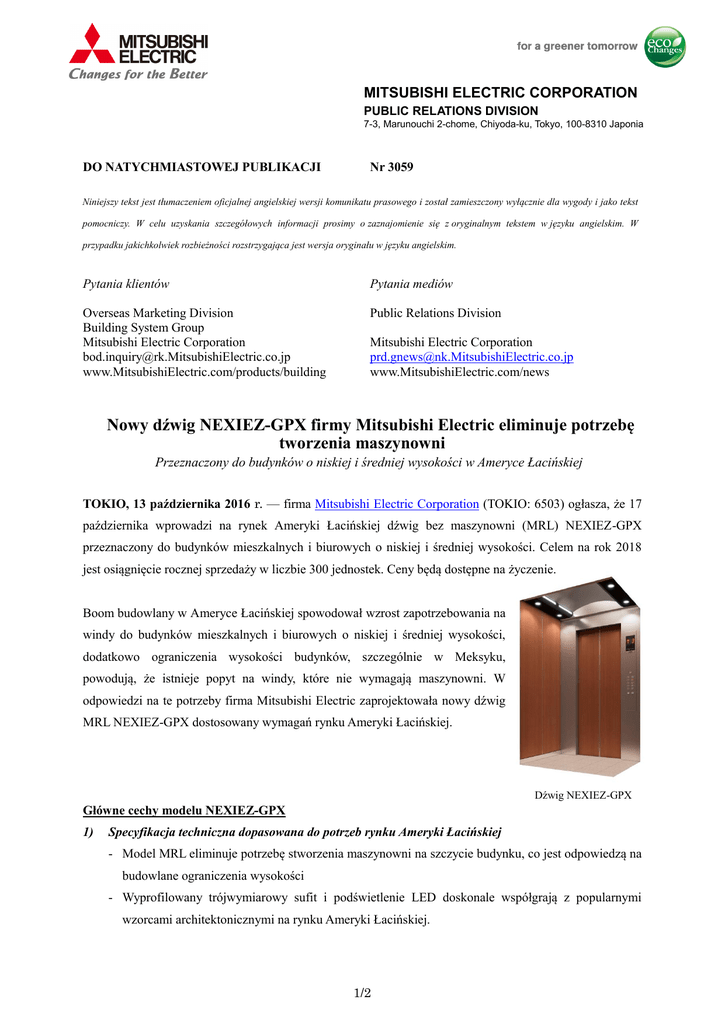 MITSUBISHI ELECTRIC CORPORATION PUBLIC RELATIONS DIVISION 7-3, Marunouchi 2-chome, Chiyoda-ku, Tokyo, 100-8310 Japonia DO NATYCHMIASTOWEJ PUBLIKACJI Nr 3059 Niniejszy tekst jest tłumaczeniem oficjalnej angielskiej wersji komunikatu prasowego i został zamieszczony wyłącznie dla wygody i jako tekst pomocniczy. W celu uzyskania szczegółowych informacji prosimy o zaznajomienie się z oryginalnym tekstem w języku angielskim. W przypadku jakichkolwiek rozbieżności rozstrzygająca jest wersja oryginału w języku angielskim. Pytania klientów Pytania mediów Overseas Marketing Division Building System Group Mitsubishi Electric Corporation [email protected] www.MitsubishiElectric.com/products/building Public Relations Division Mitsubishi Electric Corporation [email protected] www.MitsubishiElectric.com/news Nowy dźwig NEXIEZ-GPX firmy Mitsubishi Electric eliminuje potrzebę tworzenia maszynowni Przeznaczony do budynków o niskiej i średniej wysokości w Ameryce Łacińskiej TOKIO, 13 października 2016 r. — firma Mitsubishi Electric Corporation (TOKIO: 6503) ogłasza, że 17 października wprowadzi na rynek Ameryki Łacińskiej dźwig bez maszynowni (MRL) NEXIEZ-GPX przeznaczony do budynków mieszkalnych i biurowych o niskiej i średniej wysokości. Celem na rok 2018 jest osiągnięcie rocznej sprzedaży w liczbie 300 jednostek. Ceny będą dostępne na życzenie. Boom budowlany w Ameryce Łacińskiej spowodował wzrost zapotrzebowania na windy do budynków mieszkalnych i biurowych o niskiej i średniej wysokości, dodatkowo ograniczenia wysokości budynków, szczególnie w Meksyku, powodują, że istnieje popyt na windy, które nie wymagają maszynowni. W odpowiedzi na te potrzeby firma Mitsubishi Electric zaprojektowała nowy dźwig MRL NEXIEZ-GPX dostosowany wymagań rynku Ameryki Łacińskiej. Dźwig NEXIEZ-GPX Główne cechy modelu NEXIEZ-GPX 1) Specyfikacja techniczna dopasowana do potrzeb rynku Ameryki Łacińskiej - Model MRL eliminuje potrzebę stworzenia maszynowni na szczycie budynku, co jest odpowiedzą na budowlane ograniczenia wysokości - Wyprofilowany trójwymiarowy sufit i podświetlenie LED doskonale współgrają z popularnymi wzorcami architektonicznymi na rynku Ameryki Łacińskiej. 1/2 2) Lokalna produkcja zwiększa konkurencyjność produktu - Konkurencyjność pod względem cen i czasu dostawy ma swoje źródło w lokalnym projektowaniu i produkcji produktu przez meksykańską spółkę zależną MITSUBISHI ELECTRIC DE MEXICO, S.A. DE C.V. (MELMEX) 3) Oszczędność energetyczna - Podświetlenie LED zmniejsza zużycie energii o 88% w porównaniu do tradycyjnego oświetlenia - Bezprzekładniowy napęd z silnikami wykorzystującymi magnesy trwałe zmniejsza zużycie energii ### O firmie Mitsubishi Electric Corporation Dzięki ponad 90-letniemu doświadczeniu w produkcji niezawodnych produktów wysokiej jakości firma Mitsubishi Electric Corporation (TOKIO: 6503) zdobyła renomę światowego lidera w dziedzinie produkcji, marketingu i sprzedaży urządzeń elektrycznych i elektronicznych dla przemysłu informatycznego, komunikacyjnego, kosmicznego, komunikacji satelitarnej, elektroniki użytkowej, technologii przemysłowych, energetyki, transportu oraz budownictwa. Realizując swoje firmowe postanowienie — Changes for the Better (zmiany na lepsze) — oraz swoje postanowienie dotyczące zrównoważonego rozwoju — Eco Changes (ekologiczne zmiany) — firma Mitsubishi Electric robi wszystko, aby zachować swoją pozycję światowego lidera ochrony środowiska, wzbogacając przy tym społeczeństwo i technologię. Roczne łączne przychody firmy na rok fiskalny zakończony 31 marca 2016 r. sięgają 4,3943 biliona jenów (38,8 miliarda USD*). Więcej informacji na: www.MitsubishiElectric.com *Kurs — 113 jenów = 1 dolar amerykański na dzień 31 marca 2016 r. obliczony przez tokijską giełdę papierów wartościowych. 2/2