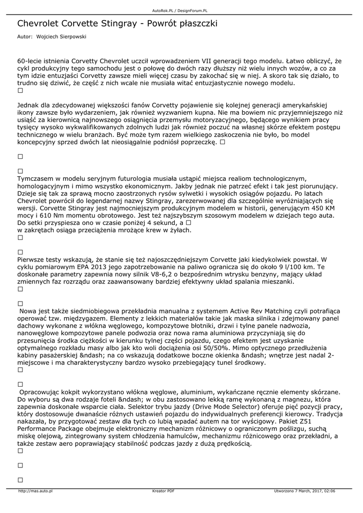AutoRok.PL / DesignForum.PL Chevrolet Corvette Stingray - Powrót płaszczki Autor: Wojciech Sierpowski 60-lecie istnienia Corvetty Chevrolet uczcił wprowadzeniem VII generacji tego modelu. Łatwo obliczyć, że cykl produkcyjny tego samochodu jest o połowę do dwóch razy dłuższy niż wielu innych wozów, a co za tym idzie entuzjaści Corvetty zawsze mieli więcej czasu by zakochać się w niej. A skoro tak się działo, to trudno się dziwić, że część z nich wcale nie musiała witać entuzjastycznie nowego modelu. Jednak dla zdecydowanej większości fanów Corvetty pojawienie się kolejnej generacji amerykańskiej ikony zawsze było wydarzeniem, jak również wyzwaniem kupna. Nie ma bowiem nic przyjemniejszego niż usiąść za kierownicą najnowszego osiągnięcia przemysłu motoryzacyjnego, będącego wynikiem pracy tysięcy wysoko wykwalifikowanych zdolnych ludzi jak również poczuć na własnej skórze efektem postępu technicznego w wielu branżach. Być może tym razem wielkiego zaskoczenia nie było, bo model koncepcyjny sprzed dwóch lat nieosiągalnie podniósł poprzeczkę. Tymczasem w modelu seryjnym futurologia musiała ustąpić miejsca realiom technologicznym, homologacyjnym i mimo wszystko ekonomicznym. Jakby jednak nie patrzeć efekt i tak jest piorunujący. Dzieje się tak za sprawą mocno zaostrzonych rysów sylwetki i wysokich osiągów pojazdu. Po latach Chevrolet powrócił do legendarnej nazwy Stingray, zarezerwowanej dla szczególnie wyróżniających się wersji. Corvette Stingray jest najmocniejszym produkcyjnym modelem w historii, generującym 450 KM mocy i 610 Nm momentu obrotowego. Jest też najszybszym szosowym modelem w dziejach tego auta. Do setki przyspiesza ono w czasie poniżej 4 sekund, a w zakrętach osiąga przeciążenia mrożące krew w żyłach. Pierwsze testy wskazują, że stanie się też najoszczędniejszym Corvette jaki kiedykolwiek powstał. W cyklu pomiarowym EPA 2013 jego zapotrzebowanie na paliwo ogranicza się do około 9 l/100 km. Te doskonałe parametry zapewnia nowy silnik V8-6,2 o bezpośrednim wtrysku benzyny, mający układ zmiennych faz rozrządu oraz zaawansowany bardziej efektywny układ spalania mieszanki. Nowa jest także siedmiobiegowa przekładnia manualna z systemem Active Rev Matching czyli potrafiąca operować tzw. międzygazem. Elementy z lekkich materiałów takie jak maska silnika i zdejmowany panel dachowy wykonane z włókna węglowego, kompozytowe błotniki, drzwi i tylne panele nadwozia, nanowęglowe kompozytowe panele podwozia oraz nowa rama aluminiowa przyczyniają się do przesunięcia środka ciężkości w kierunku tylnej części pojazdu, czego efektem jest uzyskanie optymalnego rozkładu masy albo jak kto woli dociążenia osi 50/50%. Mimo optycznego przedłużenia kabiny pasażerskiej – na co wskazują dodatkowe boczne okienka – wnętrze jest nadal 2miejscowe i ma charakterystyczny bardzo wysoko przebiegający tunel środkowy. Opracowując kokpit wykorzystano włókna węglowe, aluminium, wykańczane ręcznie elementy skórzane. Do wyboru są dwa rodzaje foteli – w obu zastosowano lekką ramę wykonaną z magnezu, która zapewnia doskonałe wsparcie ciała. Selektor trybu jazdy (Drive Mode Selector) oferuje pięć pozycji pracy, który dostosowuje dwanaście różnych ustawień pojazdu do indywidualnych preferencji kierowcy. Tradycja nakazała, by przygotować zestaw dla tych co lubią wpadać autem na tor wyścigowy. Pakiet Z51 Performance Package obejmuje elektroniczny mechanizm różnicowy o ograniczonym poślizgu, suchą miskę olejową, zintegrowany system chłodzenia hamulców, mechanizmu różnicowego oraz przekładni, a także zestaw aero poprawiający stabilność podczas jazdy z dużą prędkością. http://mas.auto.pl Kreator PDF Utworzono 7 March, 2017, 02:06 AutoRok.PL / DesignForum.PL Zapraszamy do galerii zdjęć http://mas.auto.pl Kreator PDF Utworzono 7 March, 2017, 02:06