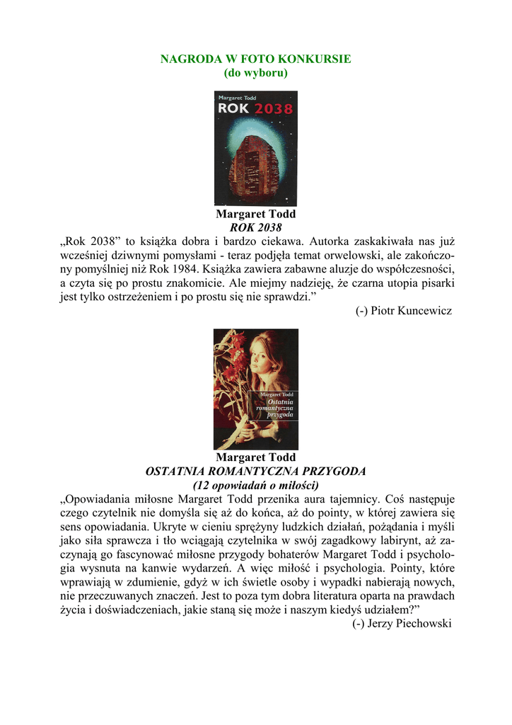 NAGRODA W FOTO KONKURSIE (do wyboru) Margaret Todd ROK 2038 „Rok 2038” to książka dobra i bardzo ciekawa. Autorka zaskakiwała nas już wcześniej dziwnymi pomysłami - teraz podjęła temat orwelowski, ale zakończony pomyślniej niż Rok 1984. Książka zawiera zabawne aluzje do współczesności, a czyta się po prostu znakomicie. Ale miejmy nadzieję, że czarna utopia pisarki jest tylko ostrzeżeniem i po prostu się nie sprawdzi.” (-) Piotr Kuncewicz Margaret Todd OSTATNIA ROMANTYCZNA PRZYGODA (12 opowiadań o miłości) „Opowiadania miłosne Margaret Todd przenika aura tajemnicy. Coś następuje czego czytelnik nie domyśla się aż do końca, aż do pointy, w której zawiera się sens opowiadania. Ukryte w cieniu sprężyny ludzkich działań, pożądania i myśli jako siła sprawcza i tło wciągają czytelnika w swój zagadkowy labirynt, aż zaczynają go fascynować miłosne przygody bohaterów Margaret Todd i psychologia wysnuta na kanwie wydarzeń. A więc miłość i psychologia. Pointy, które wprawiają w zdumienie, gdyż w ich świetle osoby i wypadki nabierają nowych, nie przeczuwanych znaczeń. Jest to poza tym dobra literatura oparta na prawdach życia i doświadczeniach, jakie staną się może i naszym kiedyś udziałem?” (-) Jerzy Piechowski Margaret Todd UTWORY SCENICZNE „Tematem jednego z utworów jest tango, pomyślane jednak całkiem odmiennie od słynnej sztuki Mrożka. Tango pani Todd to pretekst do ukazania cienkiej nici intrygi, jaka wiąże dwoje ludzi: pisarza dramaturga i dziennikarkę, która się zjawia w jego domu, by przeprowadzić wywiad dla czasopisma. Lecz czy na pewno dziennikarkę, lub tylko dziennikarkę, a nie policjantkę? A może szantażystkę, która trzyma w ręku znaczone karty i kładzie je na stół w pewnej niedomówień i niejasności rozgrywce? Czy chodzi o plagiat, czy może o morderstwo, nawet podwójne? Wnętrze piwnicy, a w nim jakiś przedmiot zawinięty w dywan – czyżby ludzkie zwłoki? Nóż, samochód porzucony na drodze. Spotkanie dwojga ludzi, które wcale nie okazuje się przypadkiem. W mgle urojeń, przywidzeń, nie do końca wyświetlonych sekretów, tango pani Todd ukazuje zamknięte, jak w pudełku, ludzkie wnętrza, z których każde tworzy świat w ostatecznym rachunku nieprzenikalny dla drugiej osoby.” (-) Jerzy Piechowski