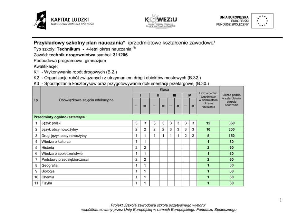 Przykładowy szkolny plan nauczania* /przedmiotowe kształcenie zawodowe/ Typ szkoły: Technikum - 4-letni okres nauczania /1/ Zawód: technik drogownictwa symbol: 311206 Podbudowa programowa: gimnazjum Kwalifikacje: K1 - Wykonywanie robót drogowych (B.2.) K2 - Organizacja robót związanych z utrzymaniem dróg i obiektów mostowych (B.32.) K3 - Sporządzanie kosztorysów oraz przygotowywanie dokumentacji przetargowej (B.30.) I II I II I II I II Klasa Liczba godzin tygodniowo w czteroletnim okresie nauczania 1 Język polski 3 3 3 3 3 3 3 3 12 360 2 Język obcy nowożytny 2 2 2 2 3 3 3 3 10 300 3 Drugi język obcy nowożytny 1 1 1 1 1 1 2 2 5 150 4 Wiedza o kulturze 1 1 1 30 5 Historia 2 2 2 60 6 Wiedza o społeczeństwie 1 1 1 30 7 Podstawy przedsiębiorczości 2 2 2 60 8 Geografia 1 1 1 30 9 Biologia 1 1 1 30 10 Chemia 1 1 1 30 11 Fizyka 1 1 1 30 I II III IV Obowiązkowe zajęcia edukacyjne Lp. Liczba godzin w czteroletnim okresie nauczania Przedmioty ogólnokształcące 1 Projekt „Szkoła zawodowa szkołą pozytywnego wyboru” współfinansowany przez Unię Europejską w ramach Europejskiego Funduszu Społecznego 12 Matematyka 3 3 2 13 Informatyka 1 1 14 Wychowanie fizyczne 3 3 15 Edukacja dla bezpieczeństwa 1 1 16 Zajęcia z wychowawcą 1 1 1 1 Łączna liczba godzin 25 25 12 12 13 13 15 15 3 2 3 2 3 1 2 3 1 3 3 1 3 3 1 10 300 1 30 12 360 1 30 4 120 65 1950 Przedmioty realizowane w zakresie rozszerzonym oraz uzupełniające 1 Fizyka 2 Matematyka 3 Historia i społeczeństwo - przedmiot uzupełniający 1 Łączna liczba godzin 1 2 1 2 1 1 1 3 3 2 1 2 1 2 1 6 5 8 240 6 180 1 1 1 5 4 120 4 4 4 16 18 540 3 90 9 270 8 240 Przedmioty w kształceniu zawodowym teoretycznym 1 Budownictwo ogólne 1 1 2 2 2 Technologia robót ziemnych i nawierzchniowych 3 3 3 3 6 3 Organizacja robót drogowych i utrzymaniowych 2 2 5 4 Kosztorysowanie w budownictwie 1 3 2 60 5 Język obcy zawodowy w drogownictwie 1 2 1,5 45 6 Działalność gospodarcza w budownictwie 1 1 1 30 11 10 6 24,5 735 3 90 8 240 Łączna liczba godzin 4 4 7 7 7 0 Przedmioty w kształceniu zawodowym praktycznym** 1 Dokumentacja techniczna 1 1 2 2 2 Roboty ziemne i nawierzchniowe 2 2 4 4 4 2 Projekt „Szkoła zawodowa szkołą pozytywnego wyboru” współfinansowany przez Unię Europejską w ramach Europejskiego Funduszu Społecznego 3 Nadzór robót i utrzymanie dróg i obiektów mostowych 4 Kosztorysowanie i dokumentacja przetargowa w budownictwie 5 Praktyki zawodowe*** 2 2 2 5 2 5 5 6 5,5 165 4 120 5 160 Łączna liczba godzin 3 3 13 13 6 0 25,5 775 Łączna liczba godzin kształcenia zawodowego 7 7 20 20 17 17 12 0 50 1510 133 4000 Tygodniowy wymiar godzin obowiązkowych zajęć edukacyjnych 33 35 6 7 34 31 /1/ do celów obliczeniowych przyjęto 30 tygodni w ciągu jednego roku szkolnego *w szkolnym planie uwzględnia się również wymiar godzin zajęć określonych w par. 4 ust. 2 rozporządzenia w sprawie ramowych planów nauczania, tj. m.in. religii lub etyki oraz wychowania do życia w rodzinie. **zajęcia odbywają się w pracowniach szkolnych, warsztatach szkolnych, centrach kształcenia praktycznego oraz u pracodawcy ***w przypadku praktyk realizowanych w wymiarze ponad 4 tygodnie Minimalny wymiar praktyk zawodowych tyg. godz. kl. I - zgodnie z podstawą programową 0 kl. II - zgodnie z podstawą programową 4 160 kl. III - zgodnie z podstawą programową 4 160 kl. IV - zgodnie z podstawą programową 0 Razem 8 320 Egzamin potwierdzający pierwszą kwalifikację (K1) odbywa się pod koniec pierwszego semestru klasy trzeciej. Egzamin potwierdzający drugą kwalifikację (K2) odbywa się pod koniec klasy trzeciej. Egzamin potwierdzający trzecią kwalifikację (K3) odbywa się pod koniec pierwszego semestru klasy czwartej. 3 Projekt „Szkoła zawodowa szkołą pozytywnego wyboru” współfinansowany przez Unię Europejską w ramach Europejskiego Funduszu Społecznego Tabela efektów kształcenia Tabela przyporządkowania poszczególnym przedmiotom efektów kształcenia dla zawodu: BHP(1) rozróżnia pojęcia związane z bezpieczeństwem i higieną pracy, ochroną przeciwpożarową, ochroną środowiska i ergonomią; BHP(2) rozróżnia zadania i uprawnienia instytucji oraz służb działających w zakresie ochrony pracy i ochrony środowiska w Polsce; BHP(3) określa prawa i obowiązki pracownika oraz pracodawcy w zakresie bezpieczeństwa i higieny pracy; I II III IV XXXX Liczba godzin przeznaczona na realizację efektów kształcenia klasa I semestr II semestr I semestr II semestr I semestr II semestr I semestr II semestr Uczeń: Efekty wspólne dla wszystkich zawodów / wspólne dla zawodów w ramach obszaru B / kwalifikacje Efekty kształcenia /umiejętności, wiedza oraz kompetencje personalne i społeczne/ BHP Budownictwo ogólne Nazwa zajęć edukacyjnych Nazwa zawodu: technik drogownictwa, symbol: 311206 5 BHP(7) organizuje stanowisko pracy zgodnie z obowiązującymi wymaganiami ergonomii, przepisami bezpieczeństwa i higieny pracy, ochrony przeciwpożarowej i ochrony środowiska; 4 Projekt „Szkoła zawodowa szkołą pozytywnego wyboru” współfinansowany przez Unię Europejską w ramach Europejskiego Funduszu Społecznego PKZ(B.c)(1) rozpoznaje rodzaje i elementy obiektów budowlanych; PKZ(B.c)(2) rozróżnia konstrukcje obiektów budowlanych i technologie ich wykonania; PKZ(B.c)(3) rozróżnia rodzaje i elementy instalacji budowlanych; PKZ(B.c)(4) rozpoznaje materiały budowlane i określa ich zastosowanie; PKZ(B.c)(9) przestrzega zasad wykonywania pomiarów związanych z robotami budowlanymi; PKZ(B.c) PKZ(B.c)(8) rozróżnia przyrządy pomiarowe stosowane w robotach budowlanych; XXXX KPS PKZ(B.c)(7) rozróżnia rodzaje i elementy dokumentacji stosowanej w budownictwie; XXXX 85 PKZ(B.c)(10) rozpoznaje elementy zagospodarowania terenu budowy; PKZ(B.c)(11) rozróżnia środki transportu stosowane w budownictwie; PKZ(B.c)(12) przestrzega zasad transportu i składowania materiałów budowlanych; PKZ(B.c)(13) rozr