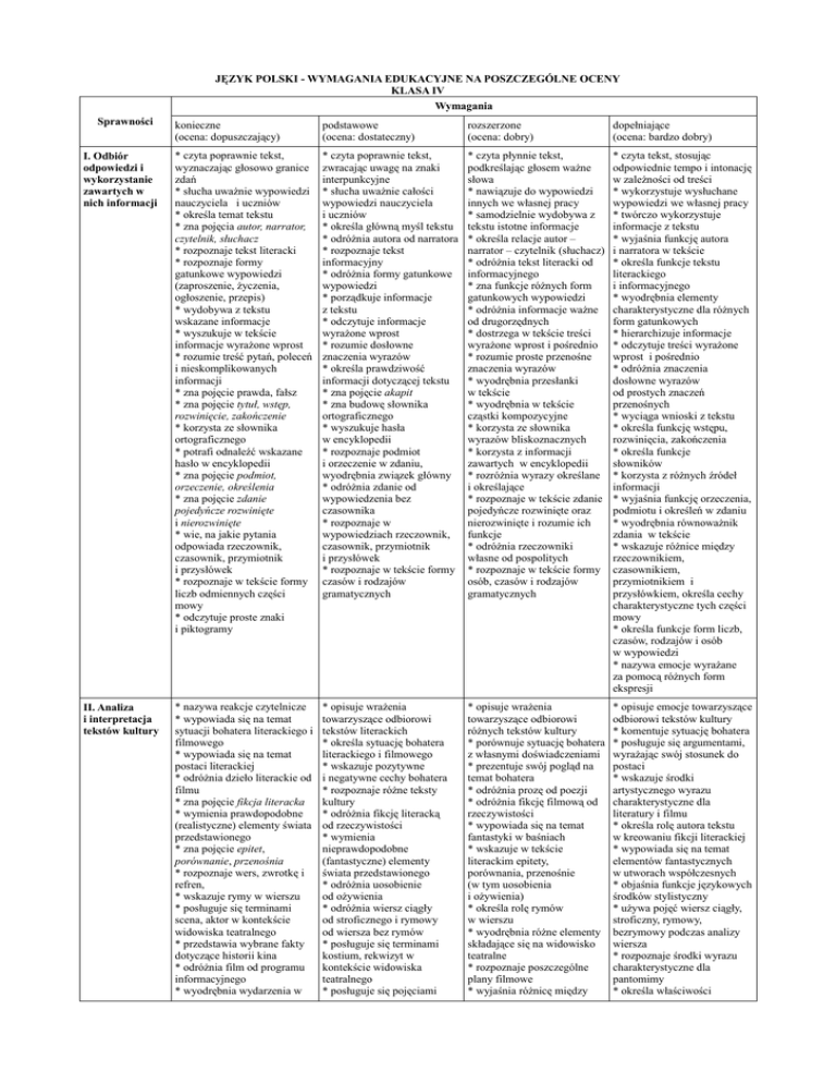 JĘZYK POLSKI - WYMAGANIA EDUKACYJNE NA POSZCZEGÓLNE OCENY KLASA IV Wymagania Sprawności konieczne (ocena: dopuszczający) podstawowe (ocena: dostateczny) rozszerzone (ocena: dobry) dopełniające (ocena: bardzo dobry) I. Odbiór odpowiedzi i wykorzystanie zawartych w nich informacji * czyta poprawnie tekst, wyznaczając głosowo granice zdań * słucha uważnie wypowiedzi nauczyciela i uczniów * określa temat tekstu * zna pojęcia autor, narrator, czytelnik, słuchacz * rozpoznaje tekst literacki * rozpoznaje formy gatunkowe wypowiedzi (zaproszenie, życzenia, ogłoszenie, przepis) * wydobywa z tekstu wskazane informacje * wyszukuje w tekście informacje wyrażone wprost * rozumie treść pytań, poleceń i nieskomplikowanych informacji * zna pojęcie prawda, fałsz * zna pojęcie tytuł, wstęp, rozwinięcie, zakończenie * korzysta ze słownika ortograficznego * potrafi odnaleźć wskazane hasło w encyklopedii * zna pojęcie podmiot, orzeczenie, określenia * zna pojęcie zdanie pojedyńcze rozwinięte i nierozwinięte * wie, na jakie pytania odpowiada rzeczownik, czasownik, przymiotnik i przysłówek * rozpoznaje w tekście formy liczb odmiennych części mowy * odczytuje proste znaki i piktogramy * czyta poprawnie tekst, zwracając uwagę na znaki interpunkcyjne * słucha uważnie całości wypowiedzi nauczyciela i uczniów * określa główną myśl tekstu * odróżnia autora od narratora * rozpoznaje tekst informacyjny * odróżnia formy gatunkowe wypowiedzi * porządkuje informacje z tekstu * odczytuje informacje wyrażone wprost * rozumie dosłowne znaczenia wyrazów * określa prawdziwość informacji dotyczącej tekstu * zna pojęcie akapit * zna budowę słownika ortograficznego * wyszukuje hasła w encyklopedii * rozpoznaje podmiot i orzeczenie w zdaniu, wyodrębnia związek główny * odróżnia zdanie od wypowiedzenia bez czasownika * rozpoznaje w wypowiedziach rzeczownik, czasownik, przymiotnik i przysłówek * rozpoznaje w tekście formy czasów i rodzajów gramatycznych * czyta płynnie tekst, podkreślając głosem ważne słowa * nawiązuje do wypowiedzi innych we własnej pracy * samodzielnie wydobywa z tekstu istotne informacje * określa relacje autor – narrator – czytelnik (słuchacz) * odróżnia tekst literacki od informacyjnego * zna funkcje różnych form gatunkowych wypowiedzi * odróżnia informacje ważne od drugorzędnych * dostrzega w tekście treści wyrażone wprost i pośrednio * rozumie proste przenośne znaczenia wyrazów * wyodrębnia przesłanki w tekście * wyodrębnia w tekście cząstki kompozycyjne * korzysta ze słownika wyrazów bliskoznacznych * korzysta z informacji zawartych w encyklopedii * rozróżnia wyrazy określane i określające * rozpoznaje w tekście zdanie pojedyńcze rozwinięte oraz nierozwinięte i rozumie ich funkcje * odróżnia rzeczowniki własne od pospolitych * rozpoznaje w tekście formy osób, czasów i rodzajów gramatycznych * czyta tekst, stosując odpowiednie tempo i intonację w zależności od treści * wykorzystuje wysłuchane wypowiedzi we własnej pracy * twórczo wykorzystuje informacje z tekstu * wyjaśnia funkcję autora i narratora w tekście * określa funkcje tekstu literackiego i informacyjnego * wyodrębnia elementy charakterystyczne dla różnych form gatunkowych * hierarchizuje informacje * odczytuje treści wyrażone wprost i pośrednio * odróżnia znaczenia dosłowne wyrazów od prostych znaczeń przenośnych * wyciąga wnioski z tekstu * określa funkcję wstępu, rozwinięcia, zakończenia * określa funkcje słowników * korzysta z różnych źródeł informacji * wyjaśnia funkcję orzeczenia, podmiotu i określeń w zdaniu * wyodrębnia równoważnik zdania w tekście * wskazuje różnice między rzeczownikiem, czasownikiem, przymiotnikiem i przysłówkiem, określa cechy charakterystyczne tych części mowy * określa funkcje form liczb, czasów, rodzajów i osób w wypowiedzi * nazywa emocje wyrażane za pomocą różnych form ekspresji II. Analiza i interpretacja tekstów kultury * nazywa reakcje czytelnicze * wypowiada się na temat sytuacji bohatera literackiego i filmowego * wypowiada się na temat postaci literackiej * odróżnia dzieło literackie od filmu * zna pojęcie fikcja literacka * wymienia prawdopodobne (realistyczne) elementy świata przedstawionego * zna pojęcie epitet, porównanie, przenośnia * rozpoznaje wers, zwrotkę i refren, * wskazuje rymy w wierszu * posługuje się terminami scena, aktor w kontekście widowiska teatralnego * przedstawia wybrane fakty dotyczące historii kina * odróżnia film od programu informacyjnego * wyodrębnia wydarzenia w * opisuje wrażenia towarzyszące odbiorowi tekstów literackich * określa sytuację bohatera literackiego i filmowego * wskazuje pozytywne i negatywne cechy bohatera * rozpoznaje różne teksty kultury * odróżnia fikcję literacką od rzeczywistości * wymienia nieprawdopodobne (fantastyczne) elementy świata przedstawionego * odróżnia uosobienie od ożywienia * odróżnia wiersz ciągły od stroficznego i rymowy od wiersza bez rymów * posługuje się terminami kostium, rekwizyt w kontekście widowiska teatralnego * posługuje się pojęciami * opisuje wrażenia towarzyszące odbiorowi różnych tekstów kultury * porównuje sytuację bohatera z własnymi doświadczeniami * prezentuje swój pogląd na temat bohatera * odróżnia prozę od poezji * odróżnia fikcję filmową od rzeczywistości * wypowiada się na temat fantastyki w baśniach * wskazuje w tekście literackim epitety, porównania, przenośnie (w tym uosobienia i ożywienia) * określa rolę rymów w wierszu * wyodrębnia różne elementy składające się na widowisko teatralne * rozpoznaje poszczególne plany filmowe * wyjaśnia różnicę między * opisuje emocje towarzyszące odbiorowi tekstów kultury * komentuje sytuację bohatera * posługuje się argumentami, wyrażając swój stosunek do postaci * wskazuje środki artystycznego wyra
