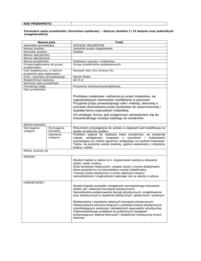 KOD PRZEDMIOTU Formularz opisu przedmiotu (formularz sylabusa) – dotyczy studiów I i II stopnia oraz jednolitych (magisterskich) Nazwa pola Jednostka prowadząca Rodzaj studiów Kierunek studiów Nazwa specjalności Nazwa specjalizacji Nazwa przedmiotu Przyporządkowanie do grupy przedmiotów Cykl dydaktyczny, w którym przedmiot jest realizowany Imię i nazwisko prowadzącego Stopień/tytuł naukowy Skrócony opis przedmiotu Forma/typ zajęć Opis przedmiotu Treść WYDZIAŁ MALARSTWA Jednolite studia magisterskie Grafika Podstawy rysunku i malarstwa Grupa przedmiotów podstawowych Semestr letni (h)i zimowy (h) Marek Model Ad II st Pracownia artystyczna/projektowa, Podstawy malarstwa i widzenia po przez malarstwo, są najważniejszym elementem kształcenia w pracowni. Przyjente przez prowadzącego cele i metody, stanowią o procesie dochodzenia przez studentów do autonomicznej i dojżałej formy wypowiedzi malarskiej. Ich strategia, forma, jest wzajemnym odniesieniem się do indywidualnego rozwoju każdego ze studentów. Zakres tematów Wymagania wstępne Wymagania formalne Założenia wstępne Warunkiem przystąpienia do udziału w zajęciach jest kwalifikacja na studia na kierunku grafika. Punktem wyjścia do realizacji treści przedmiotu, są wcześniej nabyte umiejętności związane z rysunkiem i malarstwem pozwalające na zdanie egzaminu wstępnego na wydział malarstwa. Także, na poziomie szkoły średniej, ogólne wiadomości z dziedziny kultury i sztuki. Efekty uczenia się WIEDZA Student będzie w stanie m.in. dysponować wiedzą w obszarze sztuki, nauki i kultury. Znać konteksty historyczne i związki sztuki z innymi dziedzinami, które pozwolą mu na samodzielny rozwój intelektualny. Tworzyć prace artystyczne o coraz większym stopniu samodzielności i oryginalności opierając się na wiedzy o sztuce. UMIEJĘTNOŚCI Student będzie posiadać umiejętność samodzielnego kreowania dzieła, jak i własnych koncepcji artystycznych, Samodzielnie podejmowania decyzji artystycznych, projektowania prac artystycznych w aspekcie estetycznym, społecznym i prawnym Realizowania i wyrażania własnych koncepcji artystycznych. Wykorzystania wzorców leżących u podstaw kreacji artystycznych umożliwiających swobodę i niezależność wypowiedzi artystycznej, Odpowiedzialnego podejścia do publicznych wystąpień prezentujących własną twórczość i działalność artystyczną innych twórców. KOMPETENCJE SPOŁECZNE (POSTAWY) Student poprzez nabytą wiedzę i umiejętność łączenia jej elementów będzie rozumieć potrzebę uczenia się przez całe życie. Potrafić będzie podejmować niezależne decyzje artystyczne, także w warunkach ograniczonego dostępu do potrzebnych informacji, Ma świadomość mechanizmów psychologicznych wspomagających podejmowane decyzje i działania, Posiadać umiejętność krytycznej oceny uwzględniającą autorefleksję, konstruktywną krytykę w aspekcie tematów społecznych, naukowych i etycznych, Poprzez zdobyte doświadczenie posiadać będzie zdolność w komunikowaniu się w społeczeństwie, a także inicjować pracę i projekty z innymi osobami, Potrafić będzie zaprezentować różne formy aktywności w przystępnej formie stosując różnorodne formy technologiczne, Swoją postawą, student będzie mógł w pełni wykorzystywać wyobraźnię, intuicję i emocjonalność do realizacji różnych form aktywności artystycznej, Posiadać świadomość zarządzania własnymi zasobami intelektualnymi Punkty ECTS Metody i kryteria oceniania Ćwiczenia praktyczne w zakresie malarstwa. Indywidualne analizy i korekty. Wskazywanie i ujawnianie odrębności i początków własnego języka plastycznego. Ocena świadomości artystycznej i wartości plastycznych. Zaliczenie kończy się oceną końcową. Sposób zaliczenia Podstawą oceny są 3 przeglądy w każdym semestrze oraz przegląd kończący semestr. Oceniany jest poziom plastyczny, rozwój umiejętności manualno-warsztatowych, zaangażowanie w ciągu semestru, indywidualne poszukiwania rozwiązań formalnych w zakresie podstaw malarstwa Wykonanie określonych prac zaliczeniowych. Sposób realizacji przedmiotu Cele przedmiotu to: - opanowanie podstawowych umiejętności komponowania konstruowania rysunku w oparciu o naturę - rozwijanie umiejętności wnikliwej obserwacji natury jako warunku rzetelnego budowania obrazu- rozwijanie umiejętności percepcji - analiza wzajemnych stosunków, różnych elementów (kontrasty) - kształcenie postawy kreacyjnej (Inicjatywa twórcza) - wybór odpowiednich środków artystycznych do realizacji własnych koncepcji artystycznych - kształcenie w zakresie szeroko rozumianej kultury plastycznej, analizowanie składników dzieł sztuki pochodzących z różnych epok. - Kształcenie myślenia analitycznego - Rozwijanie indywidualnych cech wyrazu i naturalnych predyspozycji studentów. - Rozwijanie umiejętności wykonawczych - komponowanie przestrzeni malarskiej, praktyczne ćwiczenia z barwą i kolorem, uświadomienie studentów o tym że kolor nie tylko barwi przedmiot lecz ma znaczenie samodzielne. - Praktyczne poznanie różnych narzędzi i technik rysunkowych i malarskich - Nauka pokory w stosunku do wykonywanej pracy - rozwijanie intuicji artystycznej - autokrytyka ( zdolność obiektywnego oceniania własnych postępów Język wykładowy Literatura J.polski lektury obowiązkowe: Władysław Strzemiński. Teoria widzenia. / Wydawnictw Literackie / Kraków 1958 Maria Rzepińska Historia Koloru w dziejach malarstwa europejskiego, Wydawnictwo Literackie, Kraków 1970 John Gage, Kolor i kultura. Teorie i znaczenie Koloru od Antyku do Abstrakcji, Universitas, Kraków 2008 Rudolf Arnheim, Sztuka i percepcja wzrokowa. Psychologia twórczego oka, przeł. J. Mach, WAiF, Warszawa 1978 Rudolf Arnheim, Myślenie wzrokowe, przeł.M. Chojnacki, słowo/obraz terytoria, Gdańsk 2011 lektury uzupełniające: Ernst H. Gombrich , Sztuka i złudzenie. O psych
