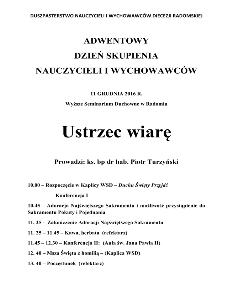 DUSZPASTERSTWO NAUCZYCIELI I WYCHOWAWCÓW DIECEZJI RADOMSKIEJ ADWENTOWY DZIEŃ SKUPIENIA NAUCZYCIELI I WYCHOWAWCÓW 11 GRUDNIA 2016 R. Wyższe Seminarium Duchowne w Radomiu Ustrzec wiarę Prowadzi: ks. bp dr hab. Piotr Turzyński 10.00 – Rozpoczęcie w Kaplicy WSD – Duchu Święty Przyjdź Konferencja I 10.45 – Adoracja Najświętszego Sakramentu i możliwość przystąpienie do Sakramentu Pokuty i Pojednania 11. 25 - Zakończenie Adoracji Najświętszego Sakramentu 11. 25 – 11.45 – Kawa, herbata (refektarz) 11.45 – 12.30 – Konferencja II: (Aula św. Jana Pawła II) 12. 40 – Msza Święta z homilią – (Kaplica WSD) 13. 40 – Poczęstunek (refektarz)