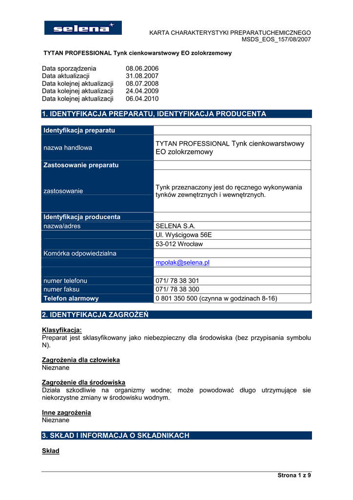 KARTA CHARAKTERYSTYKI PREPARATUCHEMICZNEGO MSDS_EOS_157/08/2007 TYTAN PROFESSIONAL Tynk cienkowarstwowy EO zolokrzemowy Data sporządzenia Data aktualizacji Data kolejnej aktualizacji Data kolejnej aktualizacji Data kolejnej aktualizacji 08.06.2006 31.08.2007 08.07.2008 24.04.2009 06.04.2010 1. IDENTYFIKACJA PREPARATU, IDENTYFIKACJA PRODUCENTA Identyfikacja preparatu nazwa handlowa TYTAN PROFESSIONAL Tynk cienkowarstwowy EO zolokrzemowy Zastosowanie preparatu zastosowanie Identyfikacja producenta nazwa/adres Tynk przeznaczony jest do ręcznego wykonywania tynków zewnętrznych i wewnętrznych. SELENA S.A. Ul. Wyścigowa 56E 53-012 Wrocław Komórka odpowiedzialna [email protected] numer telefonu numer faksu Telefon alarmowy 071/ 78 38 301 071/ 78 38 300 0 801 350 500 (czynna w godzinach 8-16) 2. IDENTYFIKACJA ZAGROśEŃ Klasyfikacja: Preparat jest sklasyfikowany jako niebezpieczny dla środowiska (bez przypisania symbolu N). ZagroŜenia dla człowieka Nieznane ZagroŜenie dla środowiska Działa szkodliwie na organizmy wodne; moŜe powodować długo utrzymujące sie niekorzystne zmiany w środowisku wodnym. Inne zagroŜenia Nieznane 3. SKŁAD I INFORMACJA O SKŁADNIKACH Skład Strona 1 z 9 KARTA CHARAKTERYSTYKI PREPARATUCHEMICZNEGO MSDS_EOS_157/08/2007 TYTAN PROFESSIONAL Tynk cienkowarstwowy EO zolokrzemowy Mieszanina dyspersji kopolimeru akrylowego, krzemionki koloidalnej, granulatów i wypełniaczy węglanowych, bieli tytanowej i pigmentów barwnych, środków konserwujących, dyspergujących i zagęszczających. Substancje stanowiące zagroŜenie dla zdrowia lub środowiska: Nazwa Chemiczna % wagowy Terbutryn Nr CAS Nr WE 886-50-0 212-950-5 Klasyfikacja i zwroty zagroŜenia N, R50/53 Xn, R20/22, R38 Xi, R41,R50 N N, R50/53 T, R22, R23/24 C, R34, R43 N, R50/53 Pirytionian cynku < 0.01% 13463-41-7 236-671-3 Tlenek cynku < 0.05% 1314-13-2 215-222-5 2-oktyloizotiazol- 3 (2H)-on < 0.01% 26530-20-1 247-761-7 <0.025% 5395-50-6 226-408-0 Xi, R 43 <0.01% 55965-84-9 613-167-00-5 T, C, R 23/24/25-34-43 N, R50/53 <0.01% 2682-20-4 220-239-6 T, C, N, R22-23-34-43-50 <0.01% 2634-33-5 220-120-9 Xn, Xi, N, R22-38-41-43-50 265-185-4 T, Rakowt.Kat.2, R45 Xn, R10, R52/53, R65,R66, R67 Ma zastosowanie nota H i nota P dla czystej benzyny lak. ze względu za zawartość benzenu <0,1% (w preparacie <0,0003%), -nie ma zastosowania nota 4 dla preparatu, a co za tym idzie produkt nie jest klasyfikowany jako szkodliwy Tetrahydro-1,3,4,6tetrakis(hydroksymetyl o) imidazo[4,5d]imidazol-2,5(1H,3H)dion Mieszanina 5-chloro2-metylo-2H-izotiazol3-onu i 2-metylo2H-izotiazol-3-onu 2-metylo-2H-izotiazol3-on 1,2-benzoizotiazol3(2H)-on Niskowrząca frakcja naftowa obrabiana wodorem, (benzyna lakiernicza o obniŜonej zawartości benzenu <0,1%) < 1.5% 64742-82-1 Substancje o obowiązujących NDS w środowisku pracy: Mączka dolomitowa (nr CAS: 16389-88-1, nr WE: 240-440-2) Mączka węglanu wapnia (nr CAS: 1317-65-3, nr WE: 240-440-2) Biel tytanowa (nr CAS: 13463-67-7) Pyły zawierające wolną (krystaliczną) krzemionkę od 2% do 50% C > 1% C > 1% C > 1% C > 1% Inne informacje: Do klasyfikacji przyjęto rzeczywistą zawartość składników niebezpiecznych. 4. PIERWSZA POMOC Strona 2 z 9 KARTA CHARAKTERYSTYKI PREPARATUCHEMICZNEGO MSDS_EOS_157/08/2007 TYTAN PROFESSIONAL Tynk cienkowarstwowy EO zolokrzemowy NaleŜy przestrzegać uwag dotyczących bezpieczeństwa i uŜytkowania zamieszczonych na etykiecie. W przypadku wystąpienia jakichkolwiek niepokojących objawów wezwać lekarza lub odwieźć poszkodowanego do szpitala, pokazać opakowanie lub etykietę. Układ oddechowy Dostarczyć świeŜego powietrza, pacjenta utrzymywać w cieple i zapewnić wypoczynek. Kontakt ze skórą Zdjąć zanieczyszczoną odzieŜ. Przemyć zanieczyszczoną skórę duŜą ilością wody. Kontakt z okiem Usunąć soczewki kontaktowe, dokładnie płukać duŜą ilością wody przez 15 minut. Unikać silnego strumienia wody ze względu na moŜliwość uszkodzenia rogówki. SpoŜycie Zdarzenie mało prawdopodobne. SpoŜycie moŜe być przyczyną zaczopowania przewodu pokarmowego. Zwrócić się o pomoc medyczną. 5. POSTĘPOWANIE W PRZYPADKU POśARU Preparat nie jest palny. Odpowiednie środki gaśnicze Zabiegi gaszenia ognia dostosować do warunków otoczenia i przyczyny poŜaru. Woda – rozproszone prądy wodne, proszki gaśnicze, gaśnice pianowe, gaśnice śniegowe i piasek. Środki gaśnicze, których nie wolno uŜywać ze względów bezpieczeństwa Brak specjalnych przeciwwskazań. Specjalne zagroŜenia Unikać wdychania pyłów. Niebezpieczne produkty rozkładu W przypadku poŜaru mogą tworzyć się niebezpieczne gazy (CO2, CO) w określonych warunkach spalania, nie moŜna wykluczyć powstania innych szkodliwych substancji. Specjalne wyposaŜenie ochronne dla straŜaków Dostosowane do przyczyny poŜaru. Dalsze zalecenia Woda skaŜona środkami gaśniczymi musi być usuwana jako odpad niebezpieczny. Zawiadomić otoczenie o poŜarze. Usunąć z obszaru zagroŜenia wszystkie osoby niebiorące udziału w likwidowaniu poŜaru. Powiadomić Państwową StraŜ PoŜarną, a w razie konieczności takŜe Policję Państwową, najbliŜsze władze terenowe i najbliŜszą jednostkę Ratownictwa Chemicznego. 6. POSTĘPOWANIE W PRZYPADKU NIEZAMIERZONEGO UWOLNIENIA DO ŚRODOWISKA Indywidualne środki ostroŜności Unikać kontaktu preparatu z oczami i skórą. Usuwania uwolnionego preparatu mogą dokonywać tylko osoby wyposaŜone w odpowiednie środki ochrony osobistej (pkt.8) Strona 3 z 9 KARTA CHARAKTERYSTYKI PREPARATUCHEMICZNEGO MSDS_EOS_157/08/2007 TYTAN PROFESSIONAL Tynk cienkowarstwowy EO zolokrzemowy Środki ostroŜności w zakresie ochrony środowiska W razie awarii nie dopuszczać do zrzutów do środowiska. Zabezpieczyć produkt przed przedostaniem się do wód bieŜących i kanałów ściekowych. Próbować zebrać jak tylko to moŜliwe, do odpowiednich pojemników celem dalszej utylizacji. Metody oczyszczania Zabezpieczyć powierzchnie przed roz