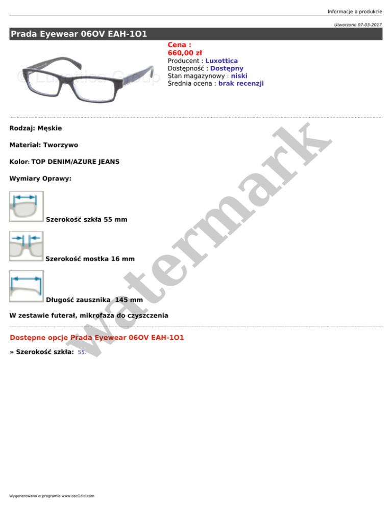 Informacje o produkcie Utworzono 07-03-2017 Prada Eyewear 06OV EAH-1O1 Cena : 660,00 zł Producent : Luxottica Dostępność : Dostępny Stan magazynowy : niski Średnia ocena : brak recenzji Materiał: Tworzywo er m ar k Rodzaj: Męskie Kolor: TOP DENIM/AZURE JEANS Wymiary Oprawy: Szerokość szkła 55 mm at Szerokość mostka 16 mm Długość zausznika 145 mm w W zestawie futerał, mikrofaza do czyszczenia Dostępne opcje Prada Eyewear 06OV EAH-1O1 » Szerokość szkła: 55. Wygenerowano w programie www.oscGold.com