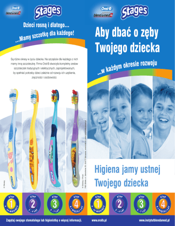 Dzieci rosnà i dlatego… zczotk´ dla ka˝dego! s y m a …M Aby dbaç o z´by Twojego dziecka Sà ró˝ne okresy w ˝yciu dziecka. Na szcz´Êcie dla ka˝dego z nich mamy innà szczoteczk´. Firma Oral-B stworzy∏a kompletny zestaw szczoteczek tradycyjnych i elektrycznych, zaprojektowanych, by spe∏niaç potrzeby dzieci zale˝nie od rozwoju ich uz´bienia, zr´cznoÊci i osobowoÊci. - 4 L AT 5 - 7 L AT W I¢ C EJ L Zapytaj swojego stomatologa lub higienistk´ o wi´cej informacji. ETAP CY 24 ¢ AT CY ¢ 2 ETAP ETAP M IE SI www.oralb.pl ETAP 8 i 8 i M IE SI ETAP 4 - 4 - 24 ETAP Higiena jamy ustnej Twojego dziecka AT © Disney / Pixar © Disney ETAP ETAP P&G Gillette, ul. Zabraniecka 20, 03-872 Warszawa, www.oralb.pl, www.instytutblendamed.pl kresie rozwoju o m y d ˝ a ...w k 2 - 4 L AT 5 - 7 L AT W I¢ C EJ L www.instytutblendamed.pl Dlaczego higiena jamy ustnej jest wa˝na Jak rozwijajà si´ z´by dzieci Od samego poczàtku O z´by mleczne dziecka nale˝y dbaç, poniewa˝ pomagajà one podczas zmiany z pokarmu p∏ynnego na sta∏y. Sà równie˝ istotne podczas rozwoju mowy i zapewniajà odpowiednià iloÊç miejsca do wyroÊni´cia z´bów sta∏ych. Tak jak z´by doros∏ych, z´by dzieci sà zagro˝one przez p∏ytk´ naz´bnà. Jest to nagromadzenie bakterii w ustach, które, jeÊli nie sà regularnie usuwane, mogà spowodowaç próchnic´, choroby dziàse∏, a nawet utrat´ z´bów. Stosowanie odpowiedniej szczoteczki oraz sprawienie, ˝e szczotkowanie stanie si´ dobrà zabawà spowodujà, ˝e czyszczenie z´bów b´dzie czynnoÊcià, którà Twoje dziecko polubi i b´dzie traktowaç przychylnie. Wizyty u stomatologa nie b´dà dla niego czymÊ budzàcym strach. Po∏àczenie zach´ty z Twojej strony, codziennego efektywnego czyszczenia z´bów, odpowiedniej diety oraz regularnych wizyt u stomatologa, pomo˝e zapewniç Twojemu dziecku zdrowe z´by i dziàs∏a na ca∏e ˝ycie. Podczas naszego ˝ycia mamy dwa zestawy z´bów. Pierwszy zestaw, zwany z´bami mlecznymi, jest zwykle kompletny w wieku czterech lat. Z´by sta∏e zaczynajà si´ pojawiaç oko∏o szóstego roku ˝ycia. Z´by mleczne zaczynajà si´ pojawiaç w wieku oko∏o szeÊciu miesi´cy. Zwykle na pierwsze urodziny dziecka górne (A) i dolne (B) Êrodkowe siekacze sà ju˝ na miejscu. GÓRNA SZCZ¢KA ETAP A Y Jako rodzic jesteÊ pierwszym nauczycielem Twojego dziecka i cz´sto osobà, którà b´dzie ono naÊladowaç. Dlatego wpajanie dziecku prawid∏owych przyzwyczajeƒ w utrzymywaniu higieny jamy ustnej zaczyna si´ od Ciebie. Podczas drugiego etapu ˝ycia dziecka, 20 z´bów mlecznych roÊnie nadal. Wszystkie sà na swoim miejscu w wieku mniej wi´cej czterech lat. ETAP B DOLNA SZCZ¢KA (˚UCHWA) GÓRNA SZCZ¢KA DOLNA SZCZ¢KA (˚UCHWA) Jak rozwijajà si´ z´by dzieci Kszta∏towanie i utrwalanie dobrych przyzwyczajeƒ Z´by sta∏e zaczynajà si´ pojawiaç oko∏o szóstego roku ˝ycia i rosnà do trzynastego. „Z´by màdroÊci” pojawiajà si´ zwykle w wieku oko∏o szesnastu lat. Nale˝y jednak pami´taç, ˝e ka˝de dziecko jest inne i czas, kiedy rosnà z´by, mo˝e byç ró˝ny. Wyuczone wczeÊnie dobre przyzwyczajenia pozostanà u Twojego dziecka przez ca∏e ˝ycie. Jest to moment, kiedy zaczynajà si´ pojawiaç pierwsze z´by sta∏e (C). W wieku szeÊciu lat mleczne dolne Êrodkowe siekacze (A) wypadajà. Górne mleczne Êrodkowe siekacze (B) wypadajà mi´dzy siódmym a ósmym rokiem ˝ycia. Pojawiajà si´ z´by sta∏e i rosnà do trzynastego roku ˝ycia. „Z´by màdroÊci” mogà pojawiç si´ oko∏o szesnastego roku ˝ycia. Szczotkuj prawid∏owo przez dwie minuty dwa razy dziennie. GÓRNA SZCZ¢KA ETAP B C C A DOLNA SZCZ¢KA (˚UCHWA) GÓRNA SZCZ¢KA ETAP 3 2 1 2 3 4 4 5 5 6 6 7 7 6 6 5 5 4 4 3 2 1 2 3 DOLNA SZCZ¢KA (˚UCHWA) 1. 2. 3. 4. Ârodkowy siekacz Boczny siekacz Kie∏ Pierwszy przedtrzonowy 7.-8. lat 8.-9. lat 11.-12. lat 10.-11. lat 5. Drugi przedtrzonowy 6. Pierwszy trzonowy 7. Drugi trzonowy 10.-12. lat 6.-7. lat 12.-13. lat Czas szczotkow ania = 2 minu ty Zach´caj dzieci do szczotkowania, spraw by by∏a to zabawa. U˝ywaj szczoteczki z ich ulubionymi postaciami. Dzieci rosnà (etap 2 i 3) i chcà szczotkowaç z´by samodzielnie. Jest jednak ma∏o prawdopodobne, ˝e dziecko poni˝ej siódmego roku ˝ycia b´dzie doÊç zr´czne, aby samemu poprawnie szczotkowaç. Dla starszych dzieci (Etap 4) motywowanie pomaga zachowaç dobre przyzwyczajenia - zarówno nawyk szczotkowania dwa razy dziennie, jak i nawyk szczotkowania prawid∏owo. U˝ywanie szczoteczek z w∏óknami pokazujàcymi stopieƒ zu˝ycia (zu˝ycie barwnika po ok. 3-ech miesiàcach) pozwala okreÊliç czy dziecko skutecznie szczotkuje . Regularne wizyty u stomatologa Wybór w∏aÊciwej pasty do mycia z´bów Zaplanuj wizyt´ u stomatologa mi´dzy pojawieniem si´ pierwszych z´bów i pierwszymi urodzinami Twojego dziecka. Twój stomatolog sprawdzi, czy wszystko rozwija si´ poprawnie i udzieli Ci porad na temat dbania o z´by dziecka. Twoje dziecko powinno odwiedzaç stomatologa przynajmniej raz na szeÊç miesi´cy. Fluor wzmacnia i chroni z´by, wi´c u˝ywanie pasty, która go zawiera pomaga zapobiegaç próchnicy. Poniewa˝ m∏odsze dzieci cz´sto po∏ykajà past´, dost´pne sà produkty o ni˝szej zawartoÊci fluoru. Zawsze u˝ywaj porcji pasty wielkoÊci groszku, jak pokazano obok. U bardzo ma∏ych dzieci u˝ywaj ma∏ej porcji pasty roztartej na szczoteczce. ¸àczenie wizyt z innymi zaj´ciami oraz uczynienie z nich rodzinnego wydarzenia mo˝e spowodowaç, ˝e dzieci nie b´dà si´ ich baç. Stomatolog mo˝e zaleciç stosowanie Êrodka do lakowania lub Êrodka fluoryzujàcego, aby zwi´kszyç ochron´ przed próchnicà. Byç mo˝e zostanie zalecone leczenie ortodontyczne, aby pomóc z´bom wyrosnàç w odpowiednim miejscu. JeÊli Twoje dziecko ma aparat ortodontyczny, jest bardzo wa˝ne, aby wiedzieç jak nale˝y go czyÊciç. Je˝eli masz wàtpliwoÊci, czy stosowaç past´ z fluorem, 