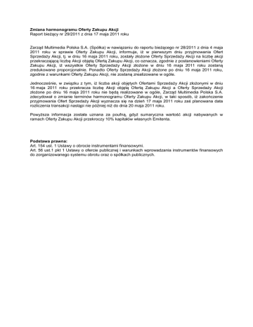 Zmiana harmonogramu Oferty Zakupu Akcji Raport bieżący nr 29/2011 z dnia 17 maja 2011 roku Zarząd Multimedia Polska S.A. (Spółka) w nawiązaniu do raportu bieżącego nr 28/2011 z dnia 4 maja 2011 roku w sprawie Oferty Zakupu Akcji, informuje, iż w pierwszym dniu przyjmowania Ofert Sprzedaży Akcji, tj. w dniu 16 maja 2011 roku, zostały złożone Oferty Sprzedaży Akcji na liczbę akcji przekraczającą liczbę Akcji objętą Ofertą Zakupu Akcji, co oznacza, zgodnie z postanowieniami Oferty Zakupu Akcji, iż wszystkie Oferty Sprzedaży Akcji złożone w dniu 16 maja 2011 roku zostaną zredukowane proporcjonalnie. Ponadto Oferty Sprzedaży Akcji złożone po dniu 16 maja 2011 roku, zgodnie z warunkami Oferty Zakupu Akcji, nie zostaną zrealizowane w ogóle. Jednocześnie, w związku z tym, iż liczba akcji objętych Ofertami Sprzedaży Akcji złożonymi w dniu 16 maja 2011 roku przekracza liczbę Akcji objętą Ofertą Zakupu Akcji a Oferty Sprzedaży Akcji złożone po dniu 16 maja 2011 roku nie będą realizowane w ogóle, Zarząd Multimedia Polska S.A. zdecydował o zmianie terminów harmonogramu Oferty Zakupu Akcji, w taki sposób, iż zakończenie przyjmowania Ofert Sprzedaży Akcji wyznacza się na dzień 17 maja 2011 roku zaś planowana data rozliczenia transakcji nastąpi nie później niż do dnia 20 maja 2011 roku. Powyższa informacja została uznana za poufną, gdyż sumaryczna wartość akcji nabywanych w ramach Oferty Zakupu Akcji przekroczy 10% kapitałów własnych Emitenta. Podstawa prawna: Art. 154 ust. 1 Ustawy o obrocie instrumentami finansowymi. Art. 56 ust.1 pkt 1 Ustawy o ofercie publicznej i warunkach wprowadzania instrumentów finansowych do zorganizowanego systemu obrotu oraz o spółkach publicznych.