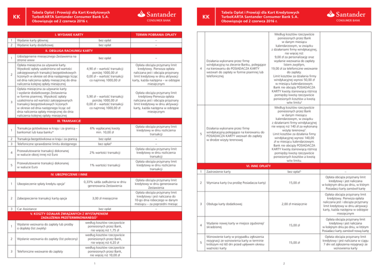 KK Tabela Opłat i Prowizji dla Kart Kredytowych TurboKARTA Santander Consumer Bank S.A. Obowiązuje od 2 czerwca 2016 r. I. WYDANIE KARTY KK Tabela Opłat i Prowizji dla Kart Kredytowych TurboKARTA Santander Consumer Bank S.A. Obowiązuje od 2 czerwca 2016 r. Działania wykonane przez firmę windykacyjną na zlecenie Banku, polegające na kierowaniu do POSIADACZA KARTY wezwań do zapłaty w formie pisemnej lub telefonicznej Według kosztów rzeczywiście poniesionych przez Bank w danym miesiącu kalendarzowym, w związku z działaniami firmy windykacyjnej, nie więcej niż: 9,00 zł za personalizację oraz wysłanie wezwania do zapłaty listem zwykłym, 19,00 zł za telefoniczne wezwanie do zapłaty. Limit kosztów za działania firmy windykacyjnej wynosi 50,00 zł w miesiącu kalendarzowym. Bank nie obciąży POSIADACZA KARTY kwotą stanowiącą różnicę pomiędzy kwotą rzeczywiście poniesionych kosztów a kwotą w/w limitu2 5 Działania wykonane przez firmę windykacyjną polegające na kierowaniu do POSIADACZA KARTY wezwań do zapłaty w drodze wizyty terenowej Według kosztów rzeczywiście poniesionych przez Bank w danym miesiącu kalendarzowym, w związku z działaniami firmy windykacyjnej nie więcej niż 140 zł za wykonaną wizytę terenową3. Limit kosztów za działania firmy windykacyjnej wynosi 140,00 zł w miesiącu kalendarzowym. Bank nie obciąży POSIADACZA KARTY kwotą stanowiącą różnicę pomiędzy kwotą rzeczywiście poniesionych kosztów a kwotą w/w limitu. 1 Zastrzeżenie karty TERMIN POBRANIA OPŁATY 1 Wydanie karty głównej bez opłat – 2 Wydanie karty dodatkowej bez opłat – bez opłat – II. OBSŁUGA RACHUNKU KARTY 1 Udostępnienie miesięcznego Zestawienia na stronie www 2 Opłata miesięczna za używanie karty. Wysokość opłaty uzależniona od wartości zaksięgowanych transakcji bezgotówkowych liczonych w okresie od dnia następnego licząc od dnia naliczenia opłaty miesięcznej do dnia naliczenia kolejnej opłaty miesięcznej 4,90 zł – wartość transakcji poniżej 1000,00 zł 0,00 zł – wartość transakcji co najmniej 1000,00 zł Opłata obciąża przyznany limit kredytowy. Pierwsza opłata naliczana jest i obciąża przyznany limit kredytowy w dniu aktywacji karty, każda następna – w odstępie miesięcznym 3 Opłata miesięczna za używanie karty i wysłanie dodatkowego Zestawienia w formie pisemnej. Wysokość opłaty uzależniona od wartości zaksięgowanych transakcji bezgotówkowych liczonych w okresie od dnia następnego licząc od dnia naliczenia opłaty miesięcznej do dnia naliczenia kolejnej opłaty miesięcznej 5,90 zł – wartość transakcji poniżej 1000,00 zł 0,00 zł – wartość transakcji co najmniej 1000,00 zł Opłata obciąża przyznany limit kredytowy Pierwsza opłata naliczana jest i obciąża przyznany limit kredytowy w dniu aktywacji karty, każda następna w odstępie miesięcznym 6% wypłacanej kwoty min. 10,00 zł Opłata obciąża przyznany limit kredytowy w dniu rozliczenia transakcji – 4 III. TRANSAKCJE 1 Transakcja gotówkowa w kraju i za granicą – bankomat lub kasa banku* 2 Transakcja bezgotówkowa w kraju i za granicą bez opłat 3 Telefoniczne sprawdzenie limitu dostępnego bez opłat5 – 4 Przewalutowanie transakcji dokonanej w walucie obcej innej niż Euro 2% wartości transakcji Opłata obciąża przyznany limit kredytowy w dniu rozliczenia transakcji 5 Przewalutowanie transakcji dokonanej w walucie Euro 1% wartości transakcji Opłata obciąża przyznany limit kredytowy w dniu rozliczenia transakcji IV. UBEZPIECZENIE I INNE 1 Ubezpieczenie spłaty kredytu opcja7 0,33% salda zadłużenia w dniu generowania Zestawienia Opłata obciąża przyznany limit kredytowy w dniu generowania Zestawienia 2 Zabezpieczenie transakcji kartą opcja 3,00 zł miesięcznie Opłata obciąża przyznany limit kredytowy i jest naliczana do 10-go dnia roboczego w danym miesiącu – za poprzedni miesiąc 3 Car Assistance bez opłat – VI. INNE OPŁATY 2 bez opłat5 – 15,00 zł Opłata obciąża przyznany limit kredytowy i jest naliczana w kolejnym dniu po dniu, w którym Posiadacz karty zamówił kartę 2,00 zł miesięcznie Opłata obciąża przyznany limit kredytowy. Pierwsza opłata naliczana jest i obciąża przyznany limit kredytowy w dniu aktywacji karty, każda następna w odstępie miesięcznym Wymiana karty (na prośbę Posiadacza karty) 3 Obsługa karty dodatkowej 4 Wydanie nowej karty w miejsce zgubionej/ skradzionej 15,00 zł Opłata obciąża przyznany limit kredytowy i jest naliczana w kolejnym dniu po dniu, w którym Posiadacz karty zamówił nową kartę 5 Wznowienie karty w przypadku zgłoszenia rezygnacji ze wznowienia karty w terminie krótszym niż 60 dni przed upływem okresu ważności karty 15,00 zł Opłata obciąża przyznany limit kredytowy i jest naliczana w ciągu 7 dni od zgłoszenia rezygnacji ze wznowienia karty V. KOSZTY DZIAŁAŃ ZWIĄZANYCH Z WYSTĄPIENIEM ZADŁUŻENIA PRZETERMINOWANEGO1 1 Wysłanie wezwania do zapłaty lub prośby o dopłatę (list zwykły) według kosztów rzeczywiście poniesionych przez Bank, nie więcej niż 1,75 zł 2 Wysłanie wezwania do zapłaty (list polecony) według kosztów rzeczywiście poniesionych przez Bank, nie więcej niż 4,20 zł 3 Telefoniczne wezwanie do zapłaty według kosztów rzeczywiście poniesionych przez Bank, nie więcej niż 10,00 zł 1 2 KK Tabela Opłat i Prowizji dla Kart Kredytowych TurboKARTA Santander Consumer Bank S.A. Obowiązuje od 2 czerwca 2016 r. KK 6 Odblokowanie karty po trzykrotnym kolejnym wprowadzeniu błędnego numeru PIN 10,00 zł Opłata obciąża przyznany limit kredytowy i jest naliczana dzień po odblokowaniu karty 7 Sporządzenie kopii miesięcznego Zestawienia z rachunku karty na prośbę Posiadacza karty 5,00 zł Opłata obciąża przyznany limit kredytowy i jest naliczana w ciągu 7 dni od sporządzenia kopii miesięcznego Zestawiania 8 Sporządzenie kopii dokumentu bankowego 25,00 zł4 9 Sporz