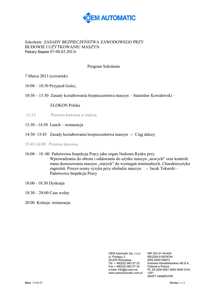 Szkolenie ZASADY BEZPIECZEŃSTWA ZAWODOWEGO PRZY BUDOWIE I UŻYTKOWANIU MASZYN Piekary Śląskie 07-08.03.2013r Program Szkolenia 7 Marca 2013 (czwartek) 10:00 – 10:30 Przyjazd Gości, 10:30 – 13:30 Zasady kształtowania bezpieczeństwa maszyn - Stanisław Kowalewski – ELOKON Polska 12:15 Przerwa kawowa w trakcie 13:30 - 14:30 Lunch – restauracja 14:30- 15:45 Zasady kształtowania bezpieczeństwa maszyn -- Ciąg dalszy 15:45-16:00 Przerwa kawowa 16:00 – 18 :00 Państwowa Inspekcja Pracy jako organ Nadzoru Rynku przy Wprowadzaniu do obrotu i oddawaniu do użytku maszyn „nowych” oraz kontroli stanu dostosowania maszyn „starych” do wymagań minimalnych. Charakterystyka zagrożeń. Proces oceny ryzyka przy obsłudze maszyn. - Jacek Tokarski – Państwowa Inspekcja Pracy 18:00 - 18:30 Dyskusja 18:30 – 20:00 Czas wolny 20:00 Kolacja restauracja OEM Automatic Sp. z o.o. ul. Postępu 2 02-676 Warszawa Tel. + 48(022) 863 27 22 Fax + 48(022) 863 27 24 e-mail: [email protected] www.oemautomatic.com.pl Data: 13-02-07 NIP 522-21-44-624 REGON 012678744 KRS 0000126873 Svenska Handelsbanken AB S.A. Oddział w Polsce PL 39 2250 0001 0000 0040 0143 1251 SWIFT HANDPLPW Strona: 1 z 2 8 marca 2013 (piątek) 07:00 – 09:00 Śniadanie 09:00 – 10:00 Rozwiązania produktowe Grzegorz Bauer - Rockwell Autoamtion 10:00 – 13:00 Techniczne środki kształtowania bezpieczeństwa - Stanisław Kowalewski – ELOKON Polska ok. 11:00 Przerwa kawowa 13:00 – 14:00 Lunch – restauracja 14:00 - 16:30 - Układy sterowania - wymagania bezpieczeństwa Tomasz Otrębski – ELOKON Polska ok. 15:15 Przerwa kawowa 16:30 - 17:00 Dyskusja OEM Automatic Sp. z o.o. ul. Postępu 2 02-676 Warszawa Tel. + 48(022) 863 27 22 Fax + 48(022) 863 27 24 e-mail: [email protected] www.oemautomatic.com.pl Data: 13-02-07 NIP 522-21-44-624 REGON 012678744 KRS 0000126873 Svenska Handelsbanken AB S.A. Oddział w Polsce PL 39 2250 0001 0000 0040 0143 1251 SWIFT HANDPLPW Strona: 2 z 2