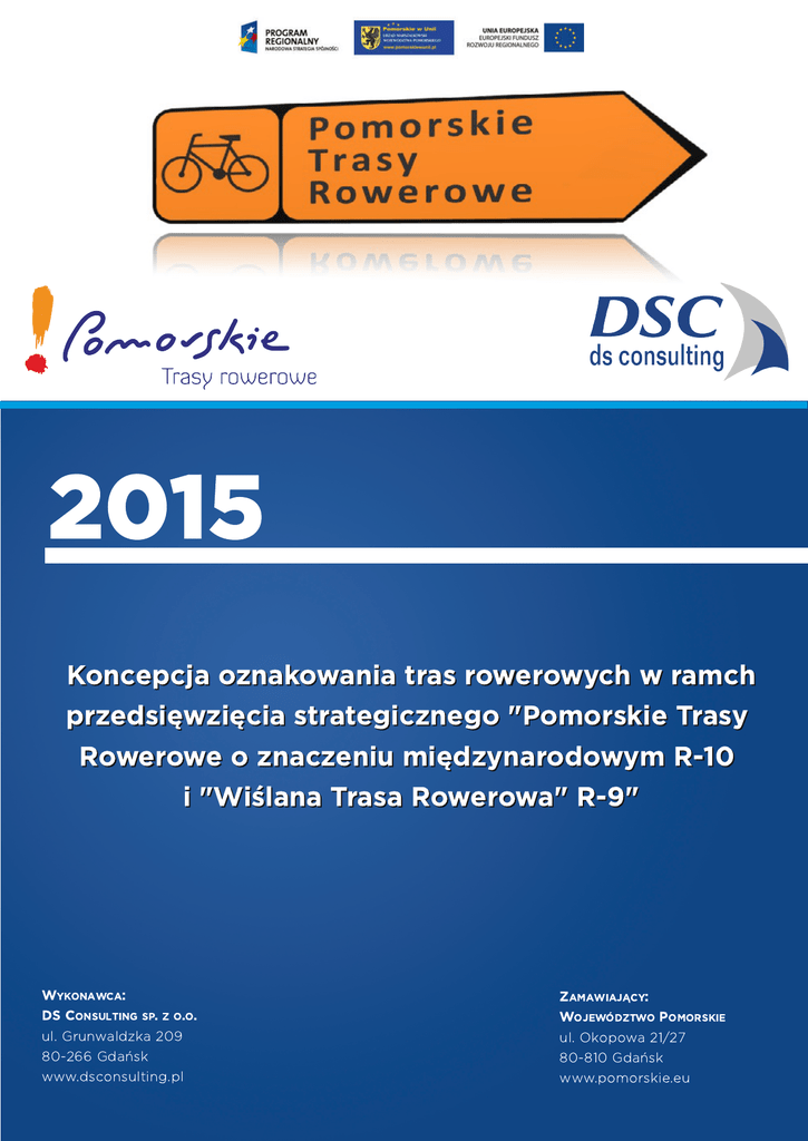 2015 Kon cepcj a oz n a kowa n i a tra s rowerowych w ra m ch przed si ęwz i ęci a stra teg i cz n eg o "Pom orski e Tra sy Rowerowe o z n a czen i u m i ęd z yn a rod owym R-1 0 i "Wi śl a n a Tra sa Rowerowa " R- 9 " WYKONAWCA: DS CONSULTING SP. Z O.O. ul. Grunwaldzka 209 80-266 Gdańsk www.dsconsulting.pl Z AMAWIAJĄCY: WOJEWÓDZTWO POMORSKIE ul. Okopowa 21/27 80-810 Gdańsk www.pomorskie.eu Koncepcja oznakowania tras rowerowych 12 października 2015 Spis treści Użyte skróty ......................................................................................................................................... 4 Wstęp ................................................................................................................................................... 5 1. Zasady oznakowania szlaków rowerowych ................................................................................. 8 1.1. Zasady wytyczania szlaków rowerowych ze względu na ich klasyfikacje ............................. 8 1.2. Procedura otrzymywania zgody na wytyczenie przebiegu ze względu na obszar oraz właściciela terenu .......................................................................................................................... 11 1.3. Rekomendowane możliwości i uwarunkowania techniczne (w szczególności rodzaj nawierzchni) ze względu na obszar, po którym prowadzi szlak .................................................... 17 1.4. Zasady bezpieczeństwa przy wyznaczaniu szlaków ze względu na ich klasyfikację z uwzględnieniem łączenia się różnych rodzajów tras ..................................................................... 24 1.4.1. Elementy infrastruktury wpływające na bezpieczeństwo rowerzystów ......................... 26 1.5. Zasady oznakowywania i numerowania tras rowerowych ze względu na ich klasyfikację z uwzględnieniem łączenia się różnych rodzajów tras ..................................................................... 33 2. Opinia Prawna ............................................................................................................................ 36 3. Koszty oznakowania tras R-10 i „Wiślanej Trasy Rowerowej”(R-9) ........................................... 40 3.1. 3.1.1. 3.2. 4. Nakłady inwestycyjne .......................................................................................................... 40 Zestawienie zbiorcze........................................................................................................ 91 Koszty utrzymania oznakowania ......................................................................................... 93 Standardy stosowane podczas oznakowania Pomorskich Tras Rowerowych ........................... 95 4.2. Zasady oznakowania............................................................................................................ 95 4.2.1. Znaki pionowe.................................................................................................................. 96 4.2.2. Znaki poziome ................................................................................................................ 102 4.2.3. Posadowienie znaków ................................................................................................... 104 4.2.4. Atrakcje turystyczne ...................................................................................................... 107 4.3. Rekomendacje ................................................................................................................... 119 4.3.1. Znaki drogowe i tablice informacyjne ........................................................................... 119 4.3.2. Oznakowanie ości i tras wspierających ......................................................................... 122 DS CONSULTING 2 Koncepcja oznakowania tras rowerowych 4.3.3. 12 października 2015 Oznakowanie mające na celu zwiększenie bezpieczeństwa ......................................... 123 Załączniki .......................................................................................................................................... 125 Załączniki .......................................................................................................................................... 125 Bibliografia ....................................................................................................................................... 126 Spis tabel i wykresów ....................................................................................................................... 128 DS CONSULTING 3 Koncepcja oznakowania tras rowerowych 12 października 2015 UŻYTE SKRÓTY Koncepcja Koncepcja Oznakowania Tras Rowerowych w Ramach Przedsięwzięcia Strategicznego Pomorskie Trasy Rowerowe o Znaczeniu Międzynarodowym R-10 i „Wiślana Trasa Rowerowa” (R-9) JST jednostka/(i) samorządu terytorialnego KC ustawa z dnia 23 kwietnia 1964 r. Kodeks cywilny (tekst jednolity Dz. U. z 2014 r. poz. 121 z późn. zm.) RPO WP 2014-2020 Regionalny Program Operacyjny Województwa Pomorskiego na lata 2014-2020 u.d.p. ustawa z dnia 21 marca 1985 r. o drogach publicznych (tekst jednolity Dz. U. z 2013 r. poz. 260 z późn. zm.) u.g.n. ustawa z dnia 21 sierpnia 1997 r. o gospodarce nieruchomościami (tekst jednolity Dz. U. z 2014 r. poz. 518 z późn. zm.) WTR Wiślana Trasa Rowerowa LGD Lokalne Grupy Działania LGR Lokalne Grupy Rybackie LOT Lokalne Organizacje Turystyczne PGL Państwowe Gospodarstwo Leśne "Lasy Państwowe" PN Park Narodowy PTTK Polskie Towarzystwo Turystyczno-Krajoznawcze RDOŚ Regionalna Dyrekcja Ochrony Środowiska ZMiUW Zarząd Melioracji i Urządzeń Wodnych Rozporządzenie Rozporządzenie Ministra Transportu, Budownictwa i Gospodarki Morskiej z dnia 19 lipca 2013 r. zmieniające rozporządzenie w sprawie szczegółowych warunków technicznych dla znaków i sygnałów drogowych oraz urządzeń bezpieczeństwa ruchu drogowego
