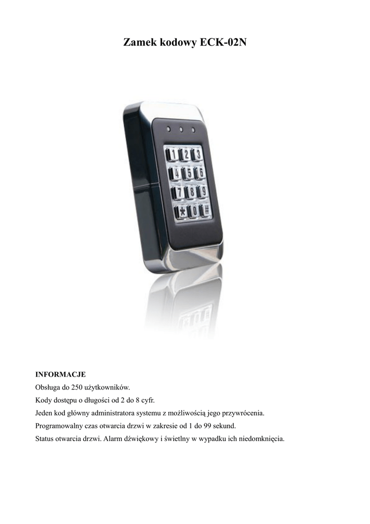 Zamek kodowy ECK-02N INFORMACJE Obsługa do 250 użytkowników. Kody dostępu o długości od 2 do 8 cyfr. Jeden kod główny administratora systemu z możliwością jego przywrócenia. Programowalny czas otwarcia drzwi w zakresie od 1 do 99 sekund. Status otwarcia drzwi. Alarm dźwiękowy i świetlny w wypadku ich niedomknięcia. Parametry techniczne: 1. Napięcie robocze: 10V-13V DC 2. Prąd pracy: ≤ 80mA 3. Prąd spoczynkowy: ≤ 27mA 4. Przekaźnik: 2A 5. Wymiary: 110x72x34mm OBSŁUGA W celu otwarcia drzwi należy wprowadzić zaprogramowany kod użytkownika i wcisnąć #. Jeżeli kod jest poprawny zamek wyda krótki dźwięk i żółta dioda zaświeci się. W wypadku podania błędnego kodu zamek wyda długi dźwięk i czerwona dioda zaświeci się. W celu usunięcia błędnie podanej cyfry należy wcisnąć *. Trzykrotne podanie błędnego kodu spowoduje zablokowanie klawiatury na 60s wraz z alarmem świetlnym i dźwiękowym. Jeśli kod nie zostanie wpisany w całości w ciągu 10s od momentu wpisania pierwszej cyfry, to wprowadzone wartości są automatycznie usuwane. PROGRAMOWANIE Wejście w tryb programowania: wcisnąć #, wpisać kod administratora (domyślnie 1234) i wcisnąć #. Zamek wyda dźwięk i czerwona dioda zacznie migać. Wyjście z trybu – wcisnąć #. Zmiana kodu administratora: 000 + (nowy kod administratora) + # + (nowy kod administratora – potwierdzenie) np. zmiana kodu administratora na 1111: 000 + 1111 + # + 1111 Ustalenie kodu użytkownika: liczba z zakresu 001-250 + kod użytkownika od 2 do 8 cyfr + # + (kod użytkownika – potwierdzenie) np. ustalenie kodu użytkownika 002 na 9999: 002 + 9999 + # + 9999 Ustalenie czasu otwarcia drzwi: 251 + czas z zakresu od 01 do 99s + # + czas – potwierdzenie np. ustalenie czasu otwarcia drzwi na 5s: 251 + 05 + # + 05 Ustalenie sprawdzania statusu otwarcia drzwi: 252 + 00 lub 01 (00 – stan niski, 01 – stan wysoki) + # + 00 lub 01 – potwierdzenie Usunięcie kodów wszystkich użytkowników: 253 + 8888 + # + 8888 Zapisanie ustawienia jest potwierdzane krótkim sygnałem dźwiękowym. PRZYWRÓCENIE USTAWIEŃ FABRYCZNYCH W celu przywrócenia ustawień fabrycznych należy: 1. Odłączyć zasilanie od zamka. 2. Zworkę z pozycji NORMAL przestawić na RESTORE. 3. Podłączyć zasilanie na minimum 10s i odłączyć ponownie. 4. Ustawić zworkę na pozycję NORMAL. 5. Ustawienia (kod administratora, czas otwarcia drzwi itd.) powrócą do ustawień fabrycznych. SCHEMAT PODŁĄCZENIA Wyprowadzenia: ➢ NUL1 – niepodłączone ➢ NUL2 – niepodłączone ➢ GND – masa zasilania ➢ DECT – wejście sprawdzania statusu drzwi ➢ NO – wyjście NO na elektrozaczep ➢ COM – zasilanie elektrozaczepu ➢ NC - wyjście NC na elektrozaczep ➢ REMOTE – zewnętrzny przycisk otwarcia drzwi ➢ DC – zasilanie prądem stałym
